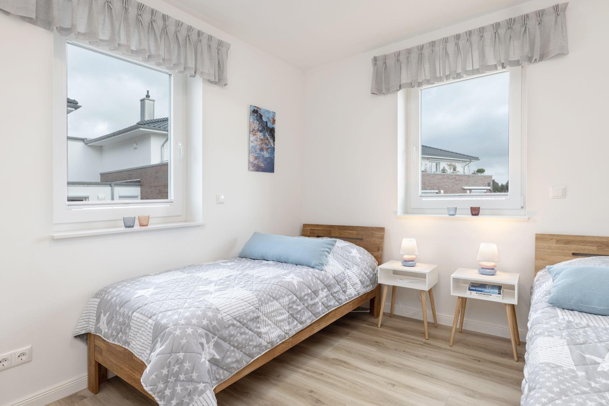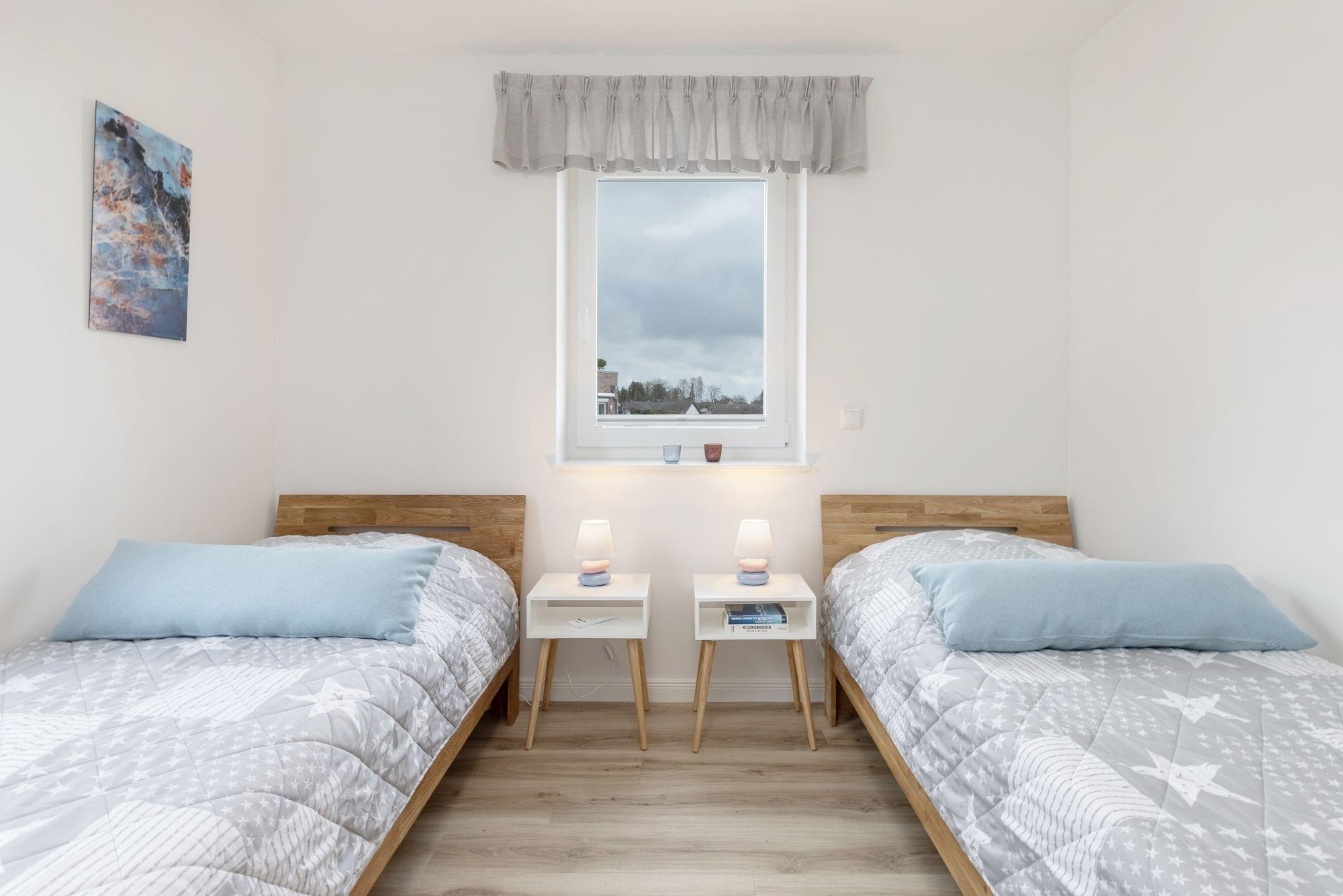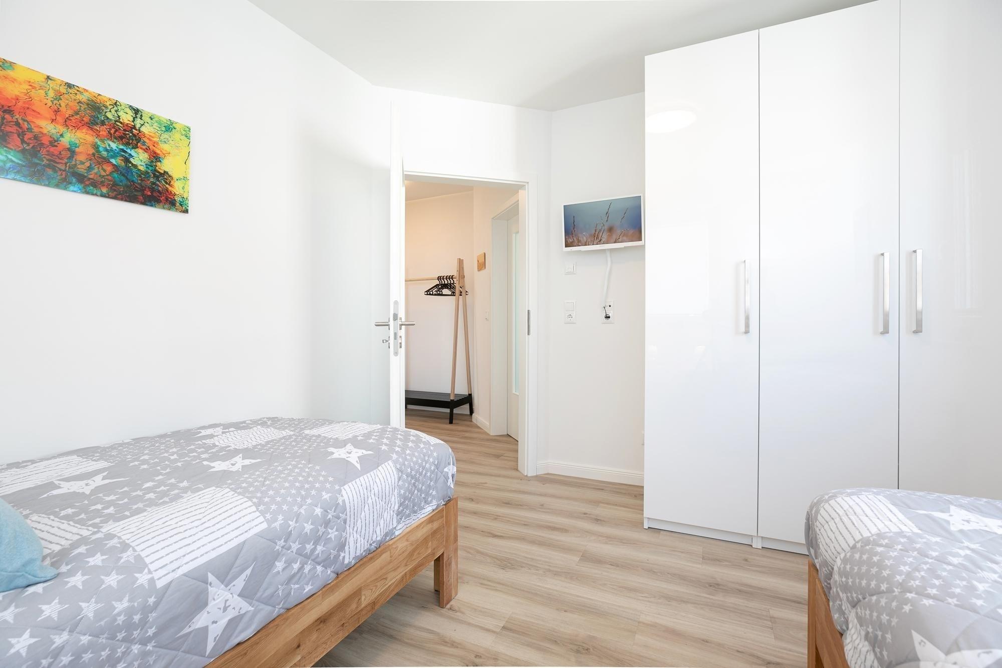 Schlafzimmer 2: 2 Einzelbetten (je 90x200 cm), Kleiderschrank, TV, Verdunkelung: Außenjalousie