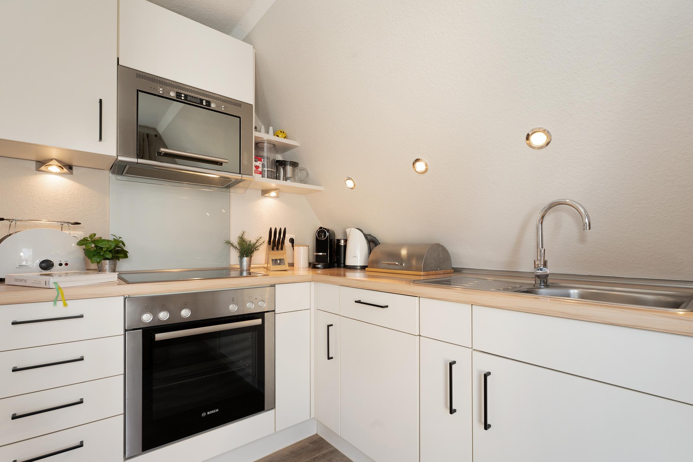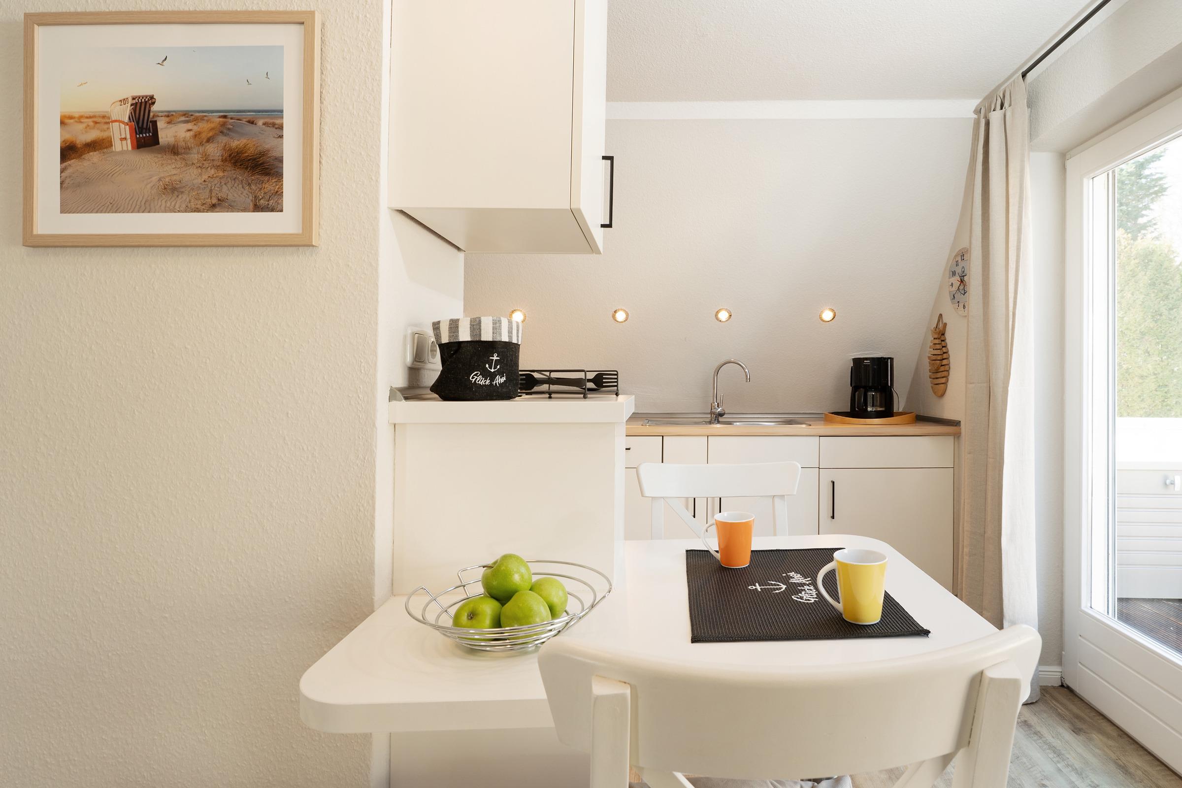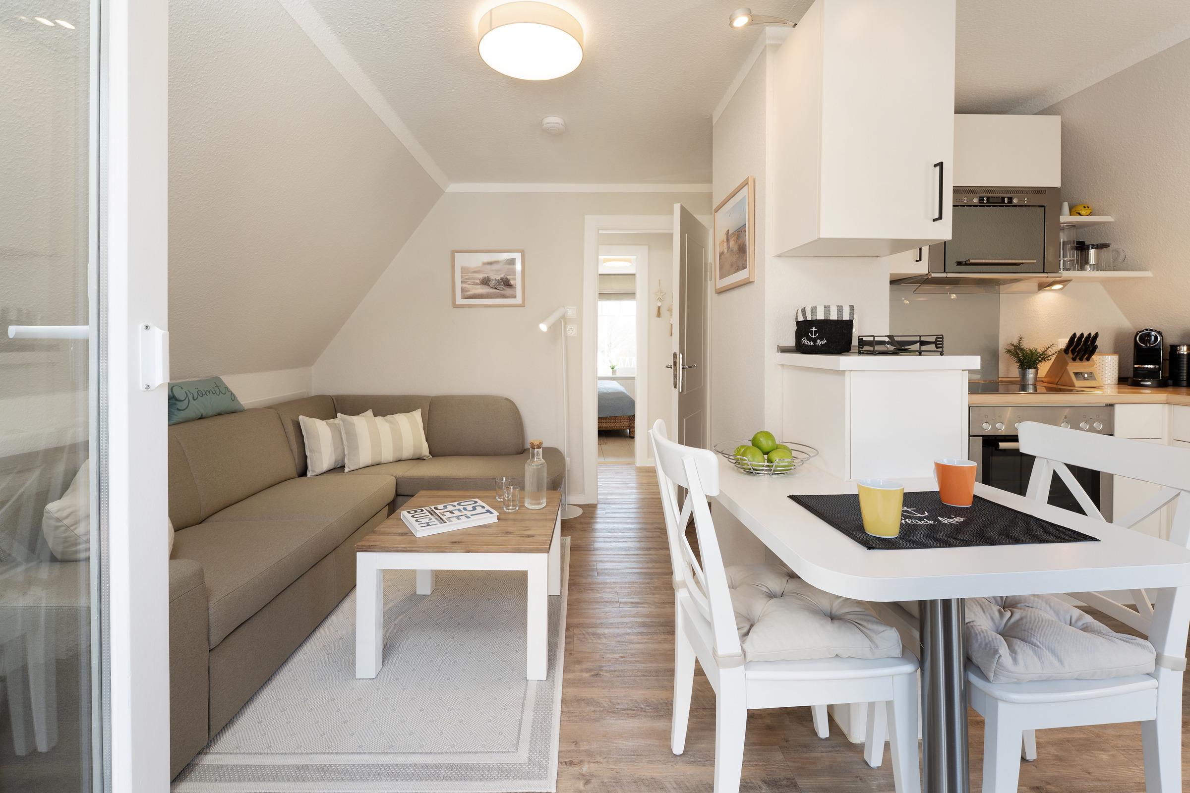 Im hellen und freundlichen Wohnbereich können Sie ungestörte Zweisamkeit genießen. Auch an Regentagen lässt es sich hier gut aushalten, denn ein Flat-TV und ein kostenloser WLAN-Anschluss zum Streamen Ihrer Lieblingsmusik stehen Ihnen zur Verfügung. In der zum Wohnbereich offenen Küche sorgen Sie mühelos für Ihr leibliches Wohl. Dank hochwertiger Ausstattung geht die Zubereitung schmackhafter Köstlichkeiten leicht von der Hand - zum Beispiel eine Kaffeespezialität aus der Nespresso-Kapselmaschine. Ein gemütlicher Essplatz ist ebenfalls integriert. Bei Sonnenschein können Sie Ihre Mahlzeiten aber auch auf der eigenen großzügigen Dachterrasse genießen, bei Bedarf verwandelt diese sich durch eine Markise in ein schattiges Plätzchen. Sonnenliegen, Terrassenmöbel und auch ein Strandkorb bieten vielfältige Rückzugs- und Entspannungsmöglichkeiten. Ein auf dem Steingrill zubereiteter Ostseefisch schmeckt unter freiem Himmel bei einem Glas Wein doppelt gut. Ein Sichtschutz sorgt für ungestörte Urlaubsmomente. Erholung und Ruhe finden Sie im komfortablen Doppelbett (2x 90x200 cm) im separaten Schlafzimmer, das sich angenehm abdunkeln lässt. Ihre Reisegarderobe bringen Sie mühelos in einem geräumigen Kleiderschrank unter. Das zeitlose Tageslichtduschbad rundet die stilvolle Ausstattung dieses Feriendomizils ab.