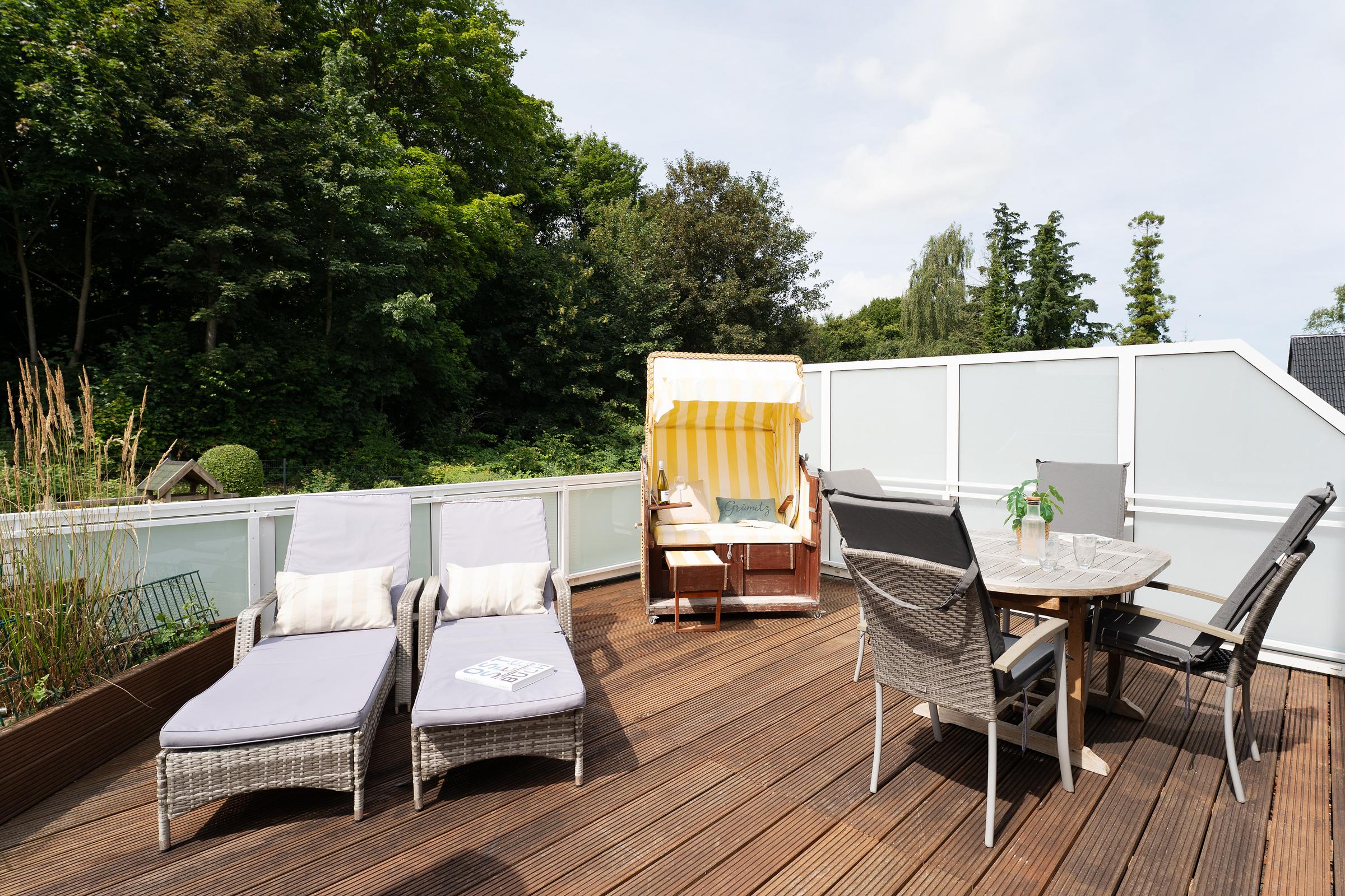 Gemütliche 2-Zimmer-Ferienwohnung mit Dachterrasse und Strandkorb in Grömitz, nur wenige Minuten vom Strand entfernt.