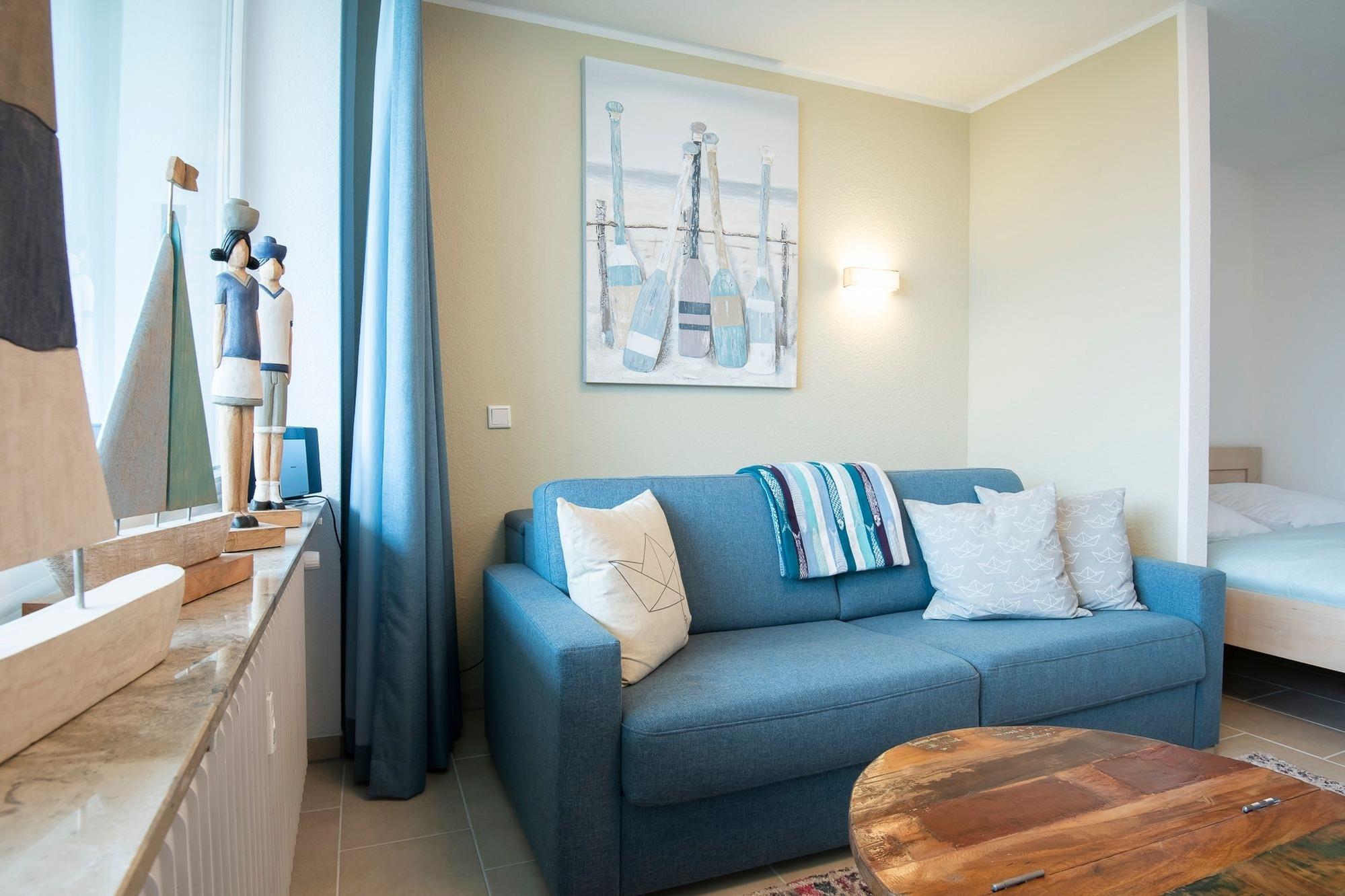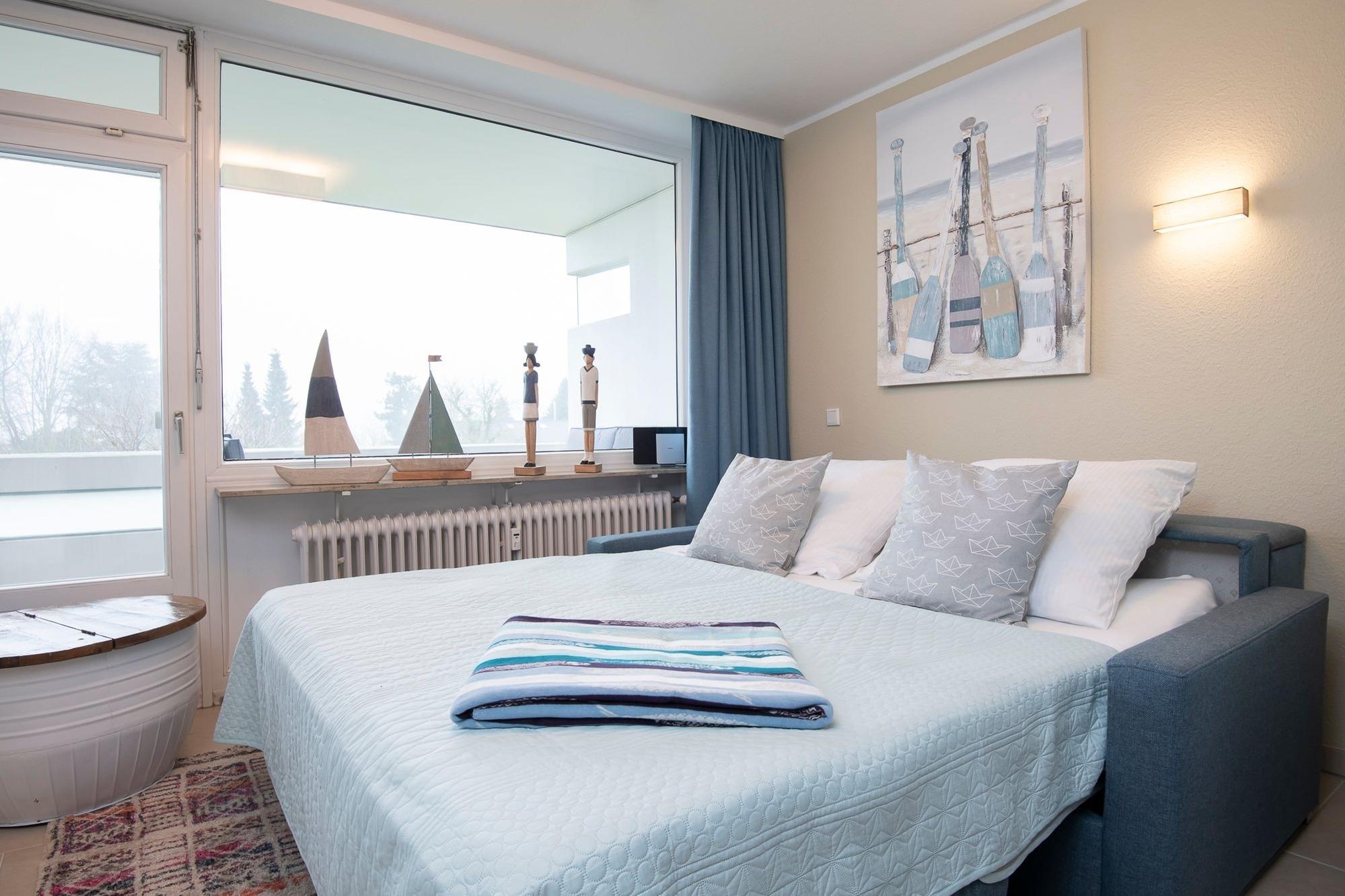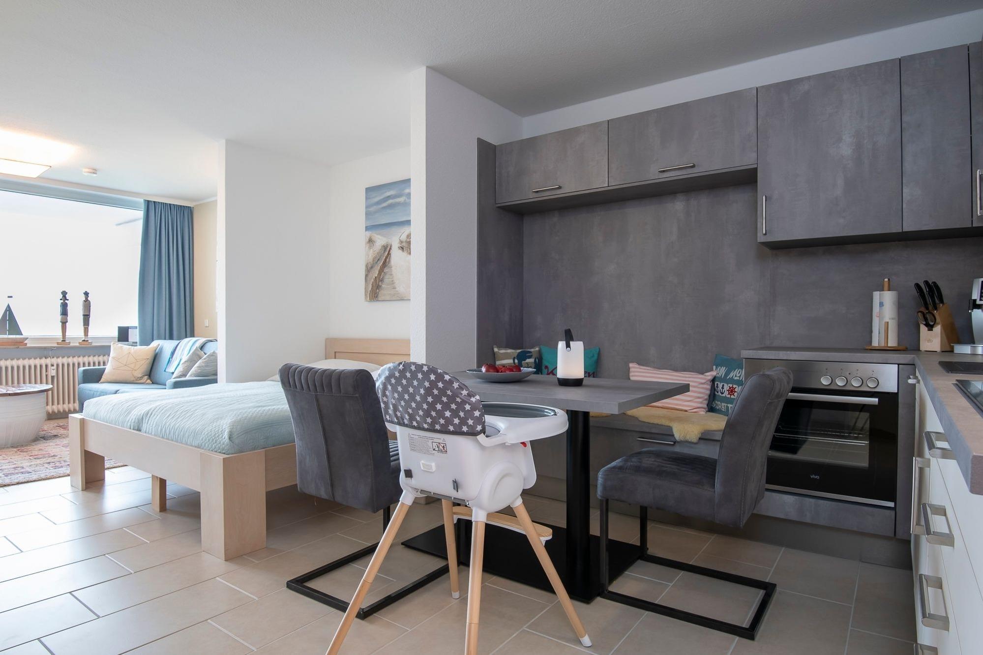 Durch ein geschicktes Einrichtungskonzept ist im offenen Wohn-, Schlaf- und Kochbereich alles komfortabel untergebracht. Tagsüber entspannen Sie auf dem bequemen Sofa, das Sie zur Nacht in eine gemütliche Schlafstätte (ca. 170x200 cm) für 2 Personen verwandeln können. Zusätzlich lädt ein großes Doppelbett (180x200 cm) zum Träumen und Erholen ein. Für Unterhaltung sorgt ein TV-Gerät oder der CD-Player. Verwöhnen Sie sich kulinarisch in der top ausgestatteten Küche mit 4-Kochfeld-Ceranherd, Backofen, Kühlschrank, Spülmaschine, deLonghi Kaffeeautomat, KitchenAid, Waffeleisen, Toaster, Wasserkocher und Sandwichmaker. Auf dem möblierten Balkon mit seitlichem, saisonalen Ostsee-Fernblick können Sie die gute Ostseeluft genießen. Bei Bedarf spendet ein Sonnenschirm Schatten. Ein Bad mit bodentiefer Dusche, Fön und beheizbarem Handtuchhalter komplettiert die Ausstattung dieser schönen Ferienwohnung.