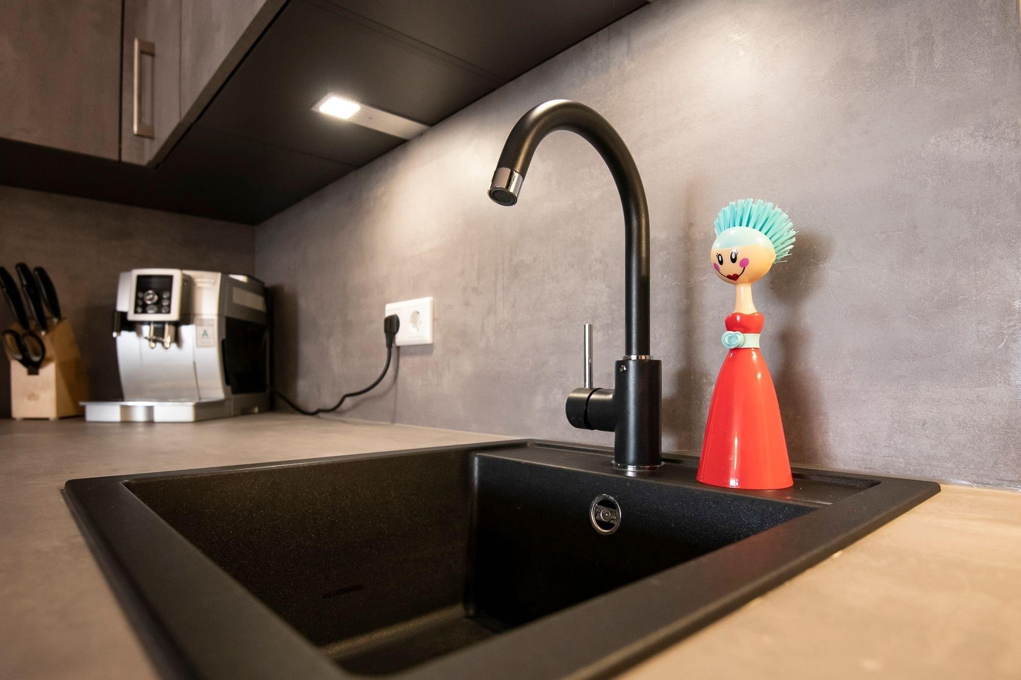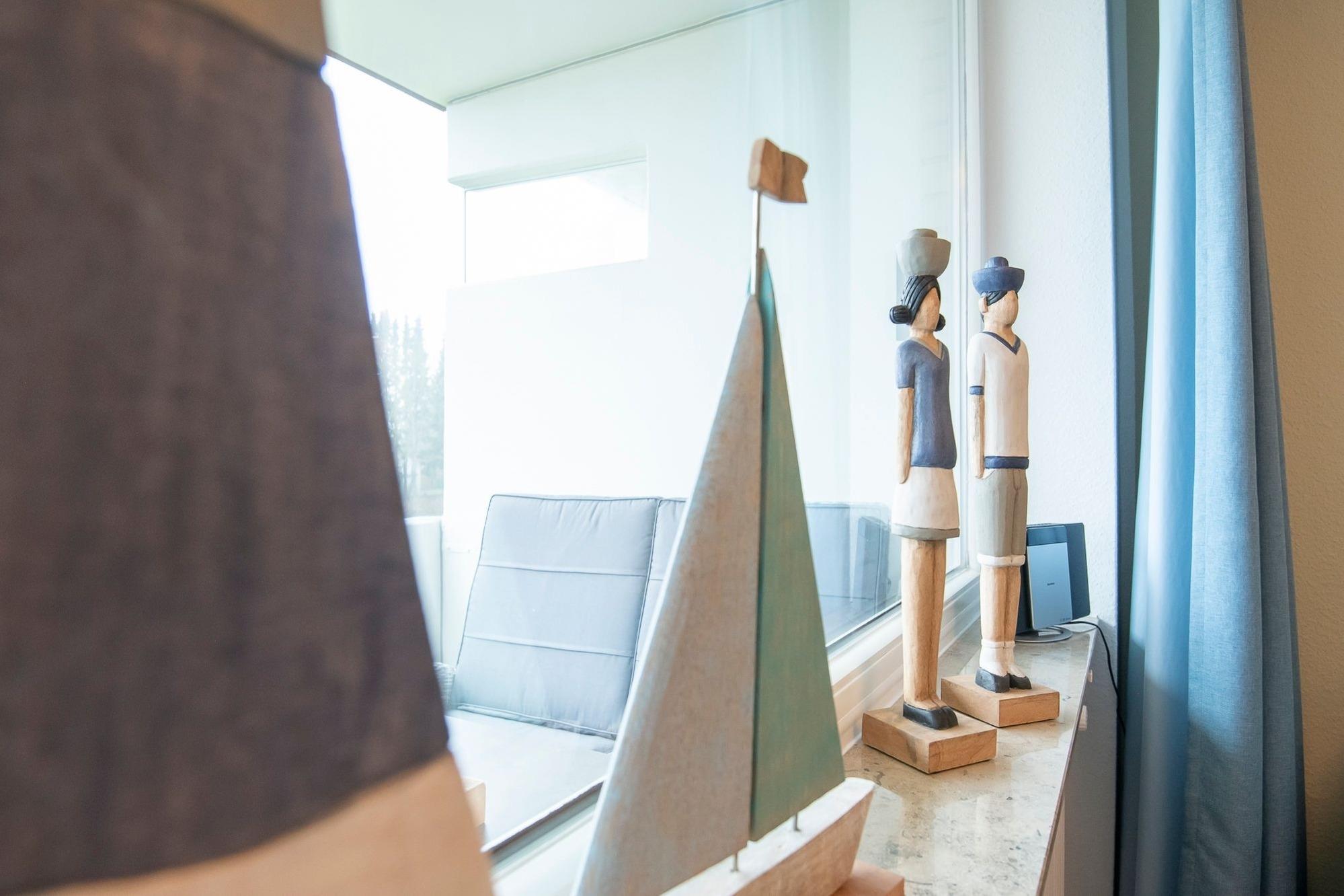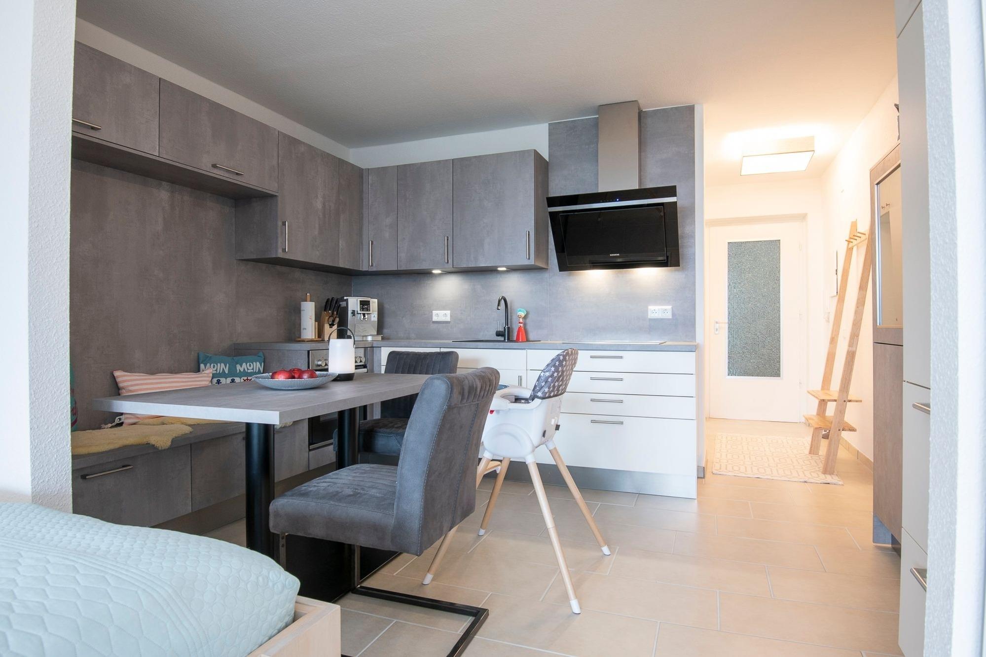 Durch ein geschicktes Einrichtungskonzept ist im offenen Wohn-, Schlaf- und Kochbereich alles komfortabel untergebracht. Tagsüber entspannen Sie auf dem bequemen Sofa, das Sie zur Nacht in eine gemütliche Schlafstätte (ca. 170x200 cm) für 2 Personen verwandeln können. Zusätzlich lädt ein großes Doppelbett (180x200 cm) zum Träumen und Erholen ein. Für Unterhaltung sorgt ein TV-Gerät oder der CD-Player. Verwöhnen Sie sich kulinarisch in der top ausgestatteten Küche mit 4-Kochfeld-Ceranherd, Backofen, Kühlschrank, Spülmaschine, deLonghi Kaffeeautomat, KitchenAid, Waffeleisen, Toaster, Wasserkocher und Sandwichmaker. Auf dem möblierten Balkon mit seitlichem, saisonalen Ostsee-Fernblick können Sie die gute Ostseeluft genießen. Bei Bedarf spendet ein Sonnenschirm Schatten. Ein Bad mit bodentiefer Dusche, Fön und beheizbarem Handtuchhalter komplettiert die Ausstattung dieser schönen Ferienwohnung.
