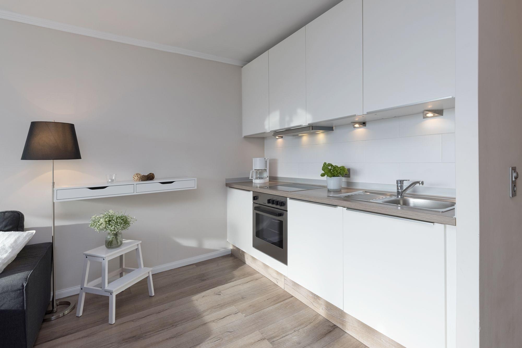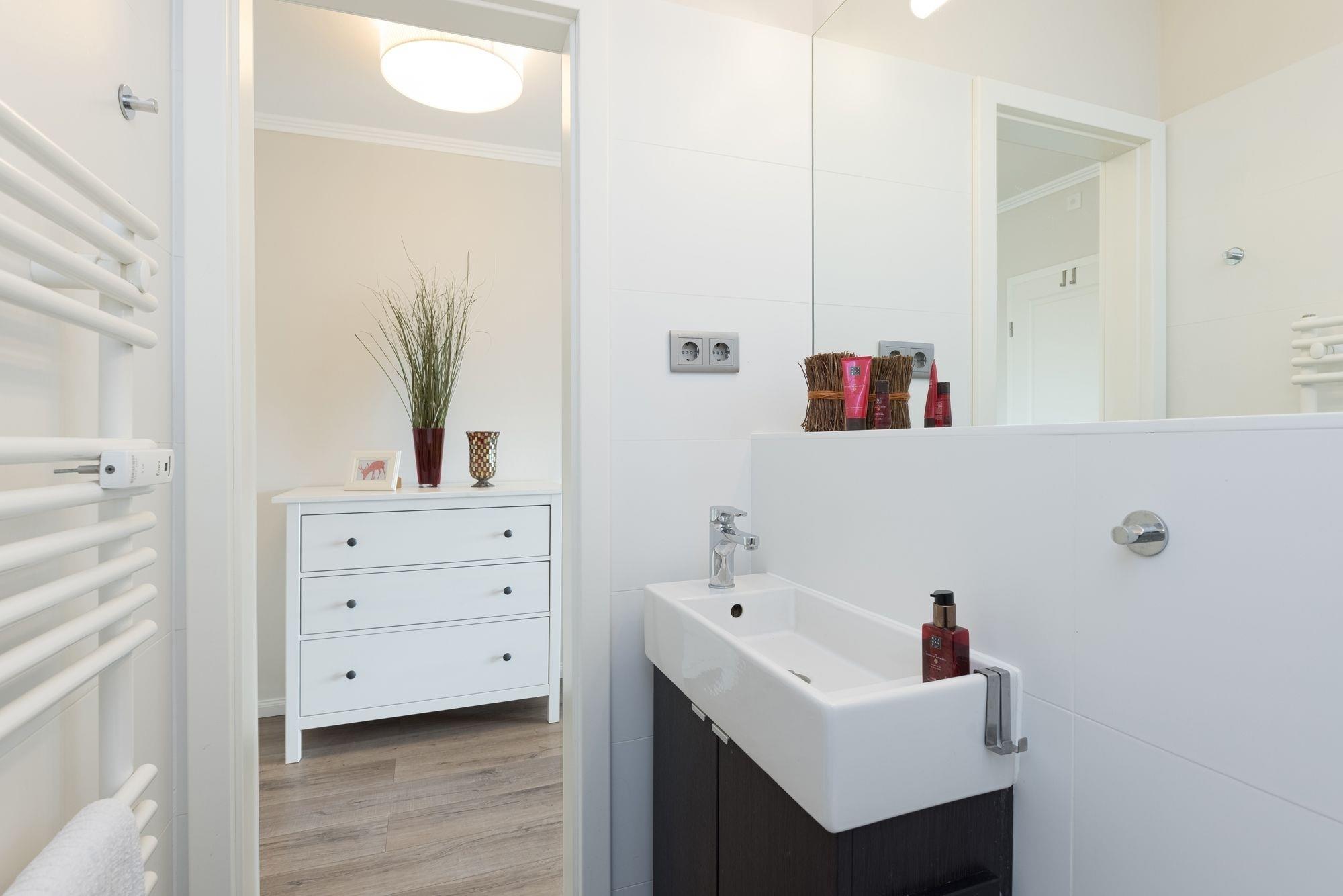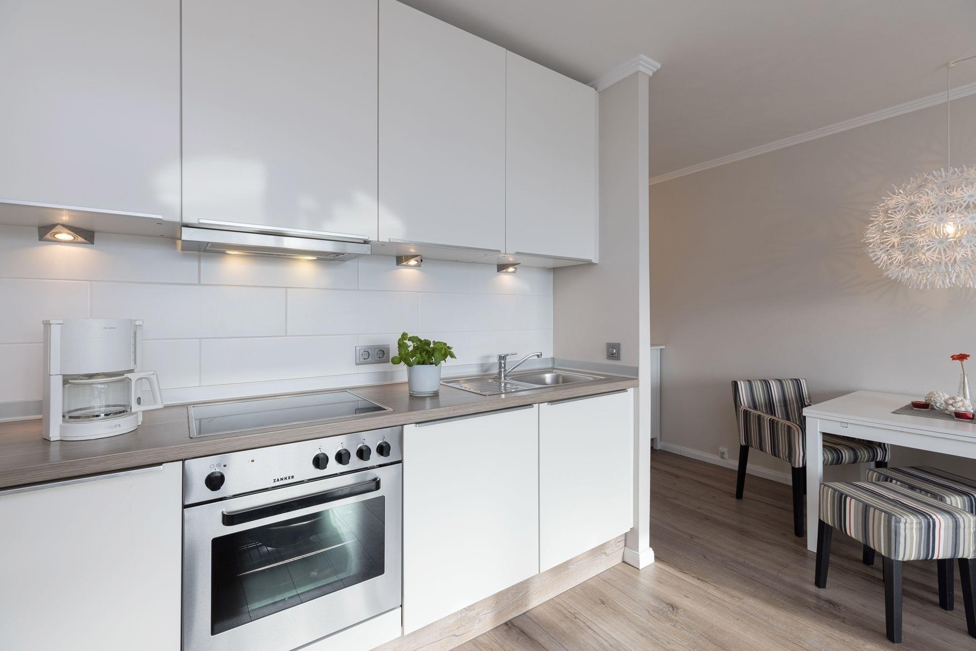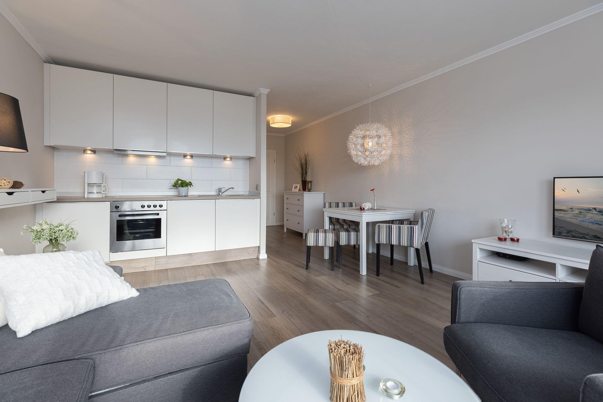 Nachdem Sie im hellen, freundlichen Eingangsbereich Ihre Garderobe aufgehängt haben, eröffnet sich Ihnen ein stilsicherer, maritimer Wohnbereich, der mit einem gemütlichen Sofa zum Relaxen einlädt. Für den 3. Urlaubsgast verwandeln Sie es im Handumdrehen in ein kuscheliges Nachtlager. Ein kleiner Esstisch mit Polsterstühlen steht für ausgiebige Mahlzeiten oder wertvolle Familienzeit bereit. Natürlich können Sie sich auch vom Fernsehprogramm berieseln lassen oder sich über den kostenlosen WLAN-Anschluss mit Ihren Lieben daheim austauschen. Die offene, in den Wohnraum integrierte Küche ist hell und übersichtlich gestaltet und so können Sie auch beim Kochen gemeinsame Zeit verbringen. Von hier haben Sie Zugang auf den möblierten Balkon, auf dem Sie entspannt in einem guten Buch schmökern können. Wenn die Sonne Sie kitzelt, fahren Sie einfach die Markise aus. Im separaten Schlafzimmer können Sie sich auf erholsame Nächte im großen Doppelbett (2x 90x200cm) freuen. In einem Kleiderschrank können Sie Ihre Urlaubsgarderobe verstauen. Das neugestaltete Duschbad mit platzsparendem Waschtisch greift das klare Design der gesamten Wohnung auf und komplettiert dieses schöne Urlaubsdomizil.