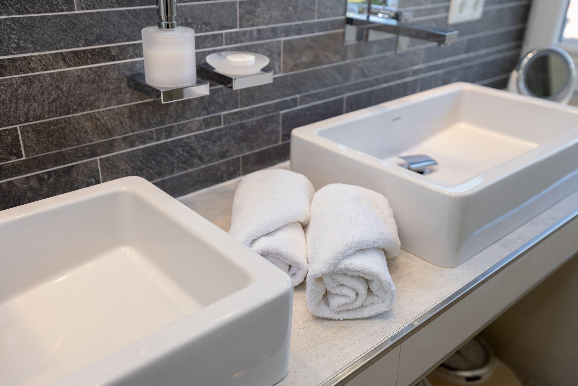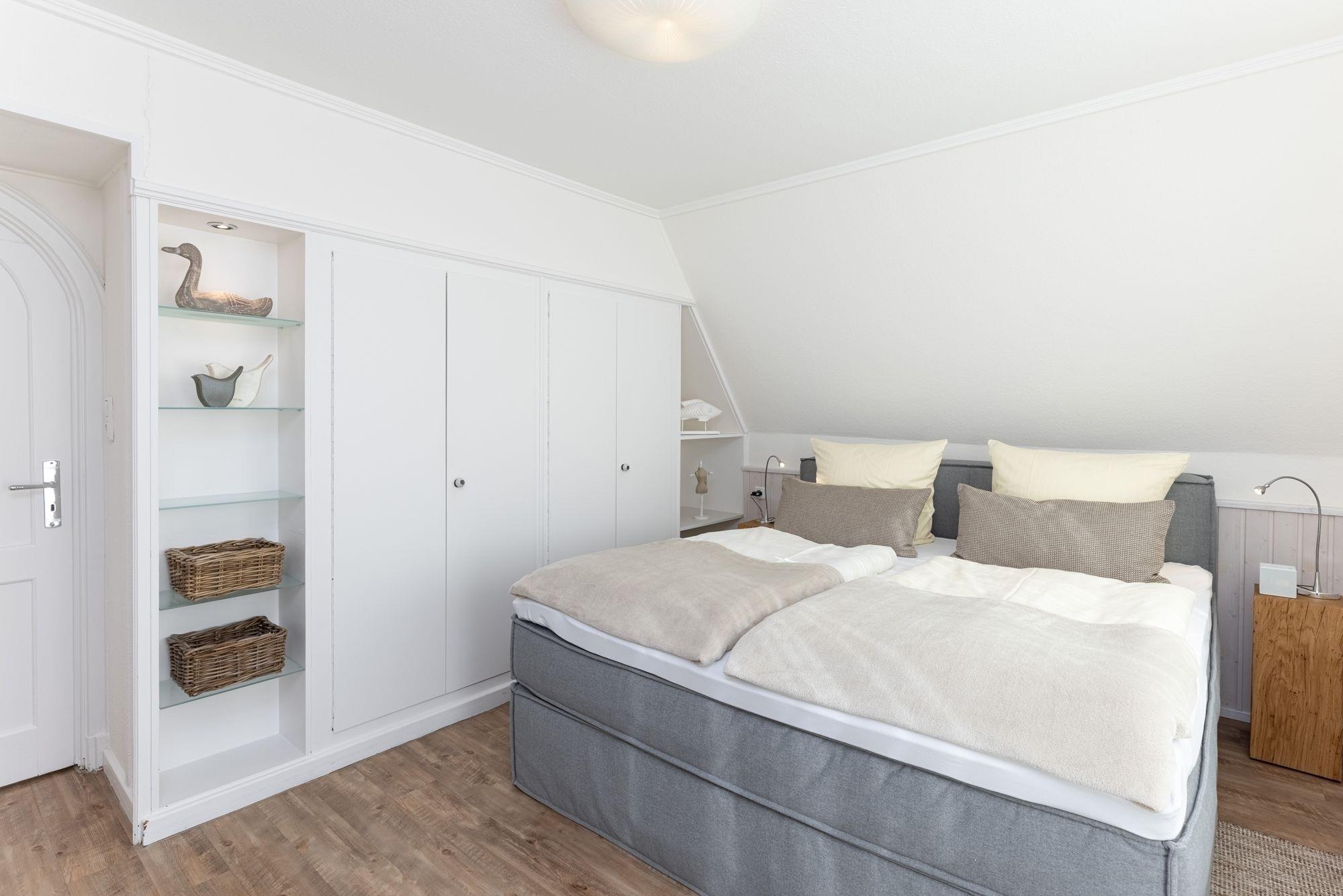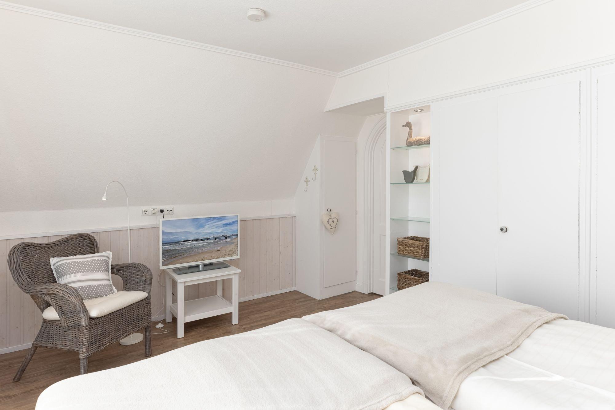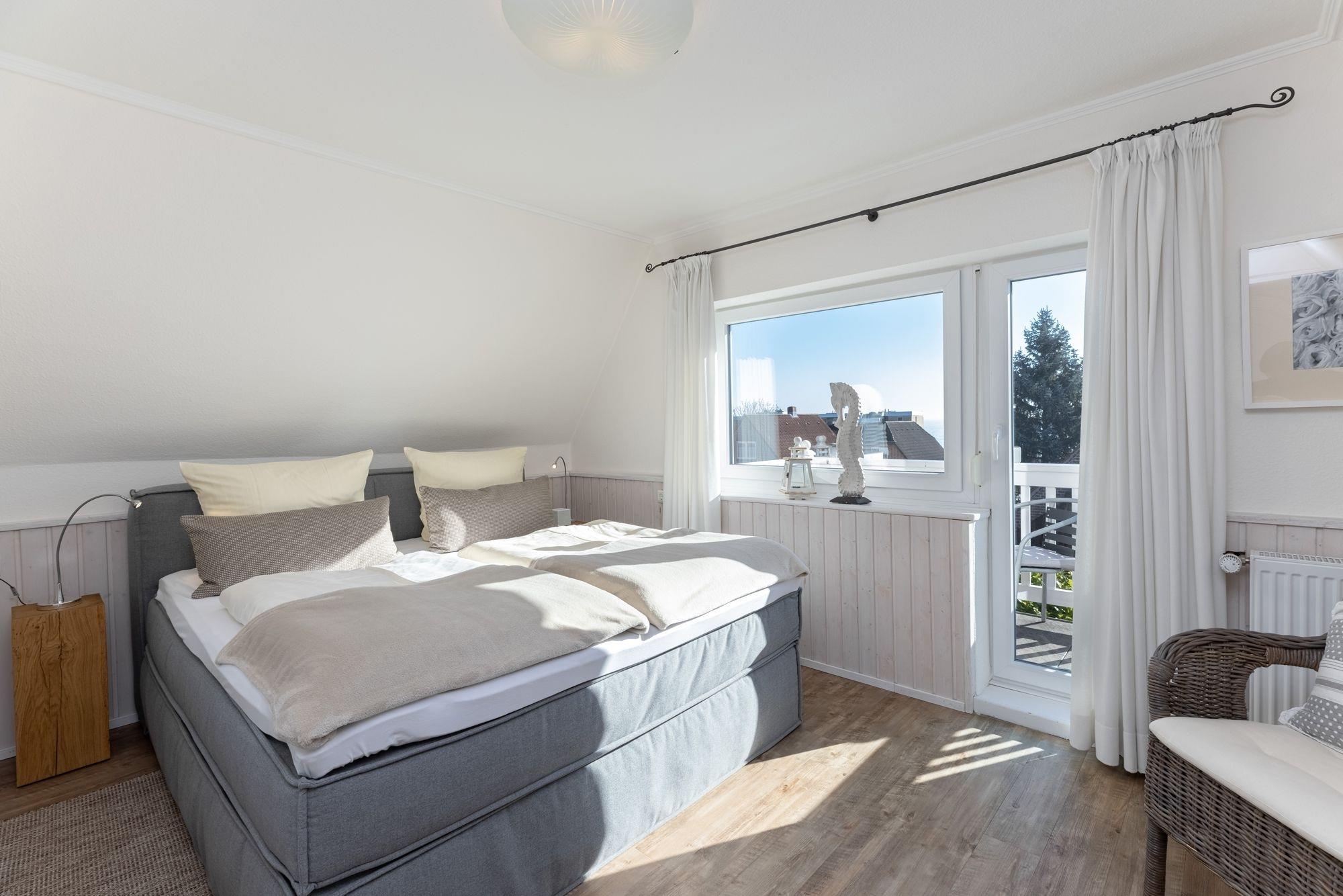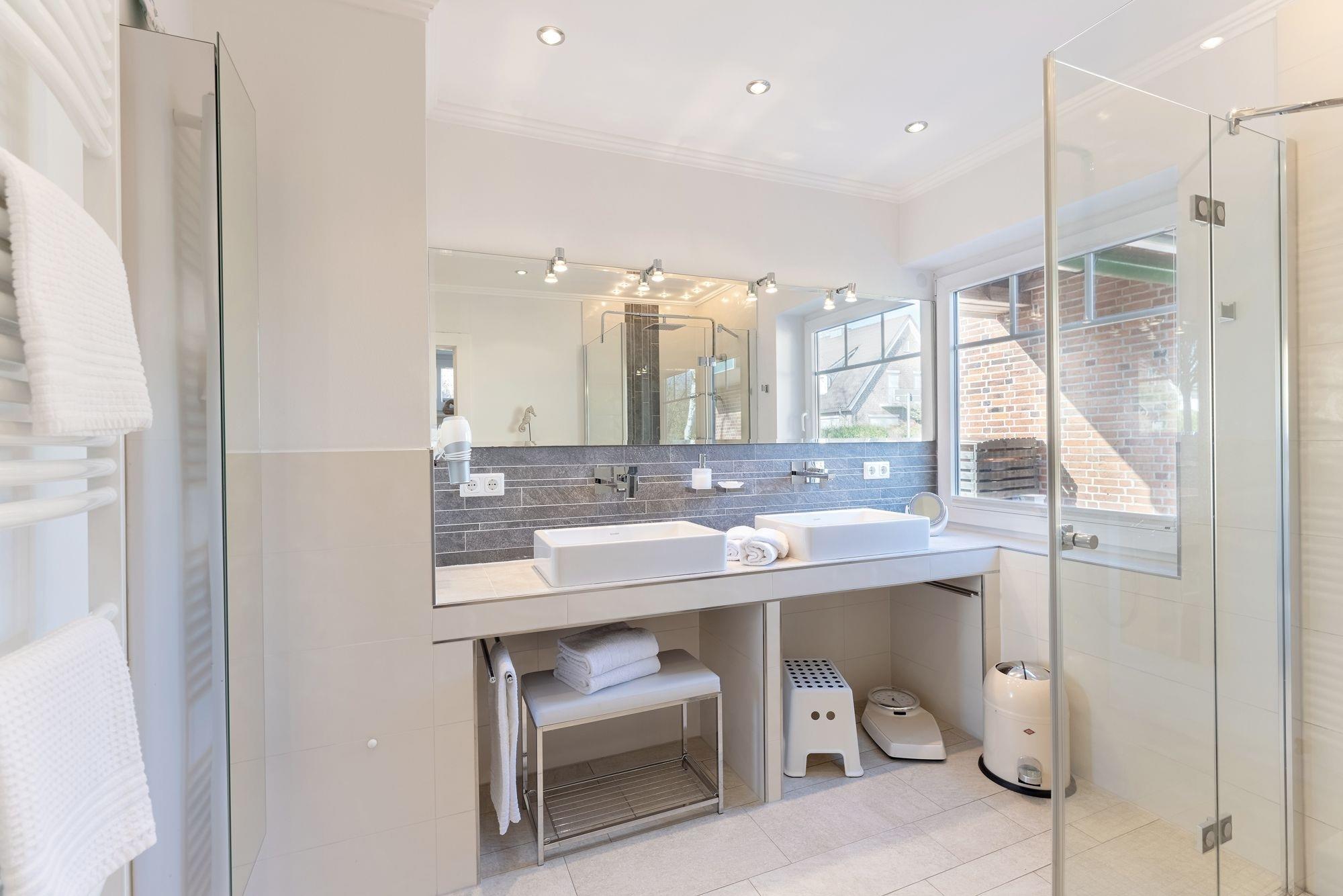 Im großen, separaten Schlafzimmer erwartet Sie ein komfortables Boxspring-Doppelbett (180x200 cm) sowie ein Kleiderschrank und Rolläden zur Verdunklung. Im zweiten Schlafzimmer sind zwei Einzelbetten (2x 90x200 cm) vorhanden sowie ebenfalls ein Kleiderschrank, Rolläden und zusätzlich ein Schreibtisch. Durch das Schlafzimmer mit Doppelbett gelangen Sie auf einen kleinen Balkon mit saisonalem Ostsee-Fernblick. Das Bad mit Fenster ist mit zwei Waschbecken, einer bodentiefen Dusche und einer Handtuch- und Fußbodenheizung eine richtige Wohlfühl-Oase.