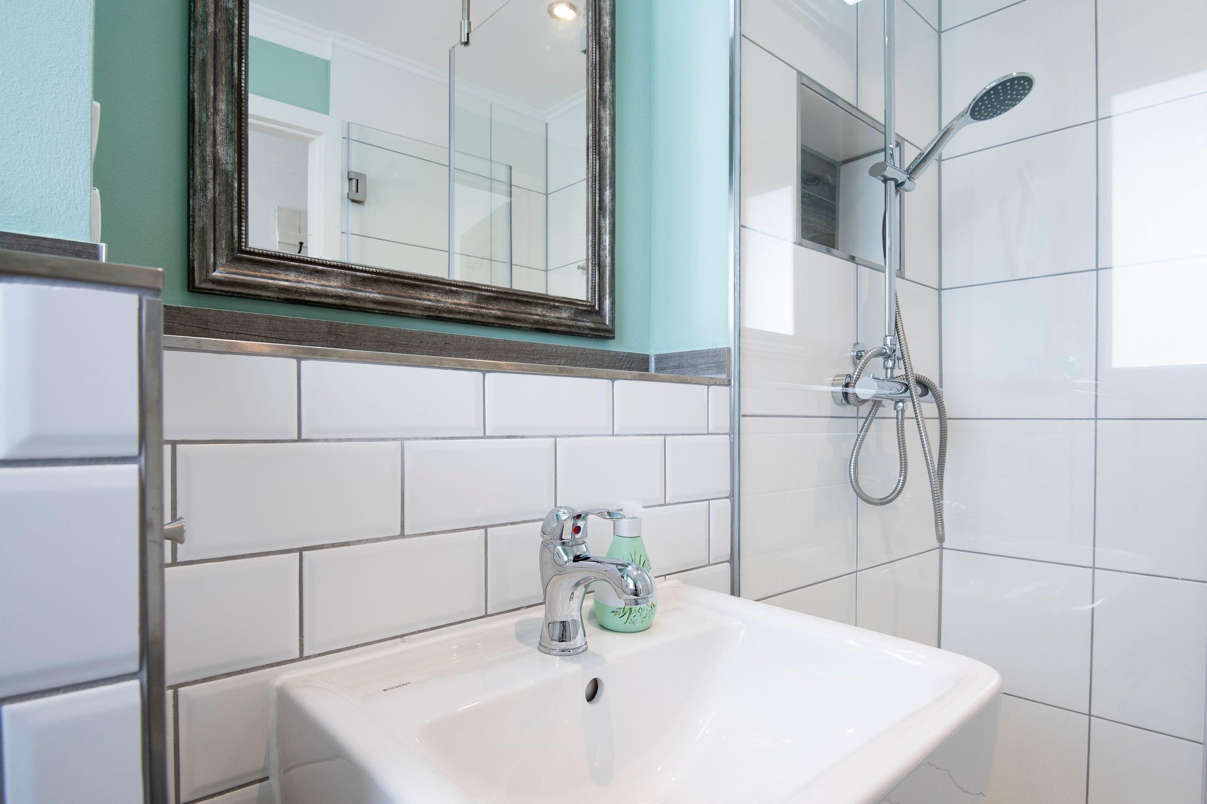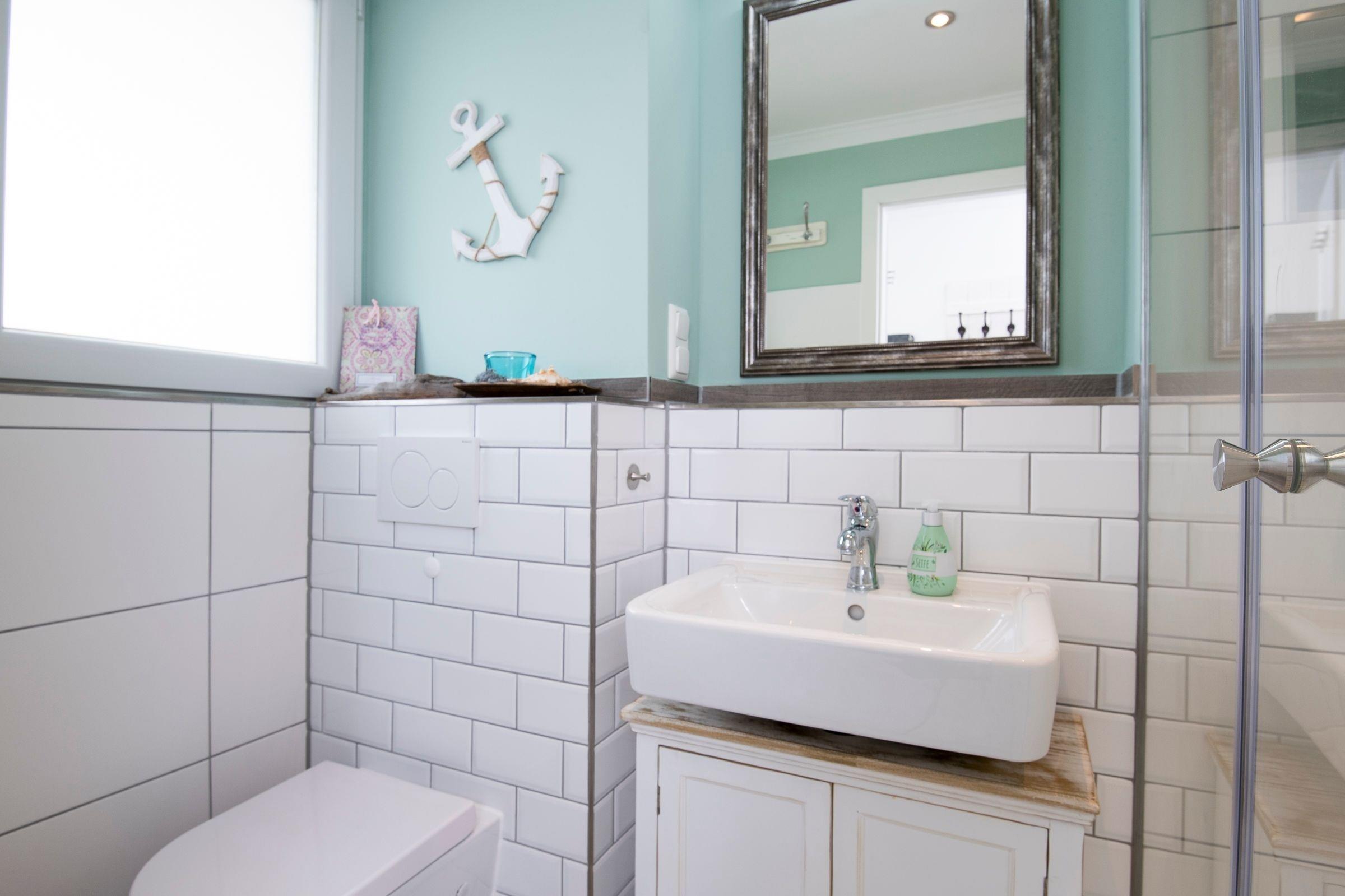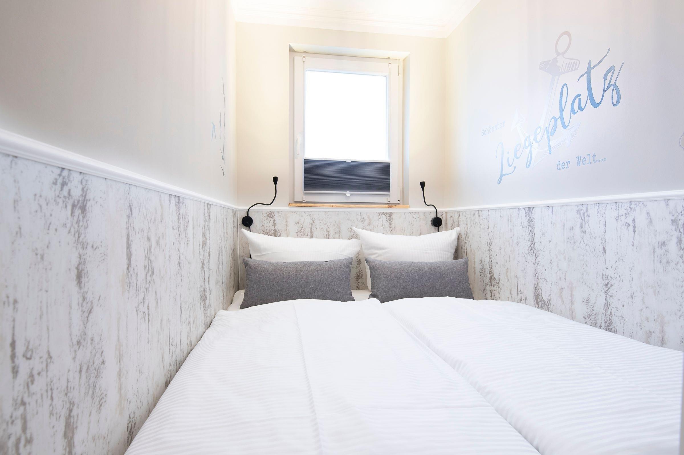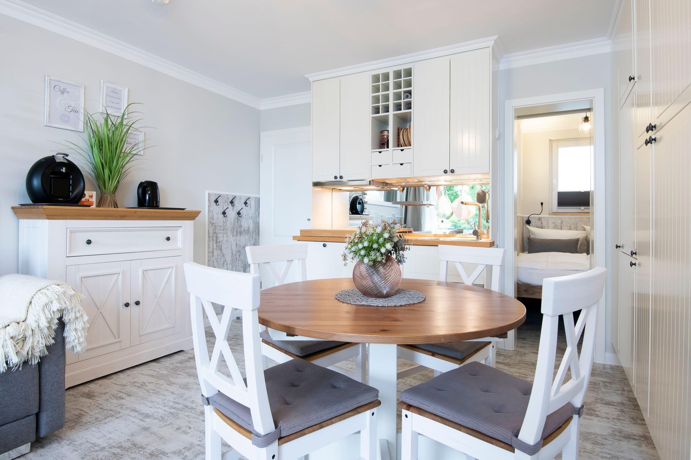 Geradeaus durch den hellen Flur aus gelangen Sie in den geschmackvoll eingerichteten Wohnbereich mit offener, voll ausgestatteter Küche, Esstisch, Schlafcouch (160x200 cm) und einem Flachbildfernseher mit Amazon Fire-TV-Stick. Die hochwertige Boxspring-Schlafcouch bietet eine Schlafmöglichkeit für 2 Personen - von dort aus haben Sie sogar einen saisonalen Teilmeerblick. Es gibt sowohl Verdunklungsvorhänge als auch dünne Gardinen als Sichtschutz. Die zum Wohnbereich offene Küche bietet alles, was Sie benötigen... sogar eine Kapsel-Kaffeemaschine von Dolce Gusto ist vorhanden! Am runden Esstisch können Sie viele gesellige Stunden verbringen. Durch die große Fensterfront ist der gesamte Wohnbereich jederzeit hell und lichtdurchflutet. Im separaten Schlafzimmer finden in der komfortablen Schlafkoje (140x200 cm) 1-2 Personen Platz. Für gemütliche Abende oder zum Fernsehen am Morgen steht Ihnen ein Flachbildfernseher mit Amazon Fire-TV-Stick zur Verfügung. Des Weiteren sind Verdunklungsplissees und eine kleine Garderobe vorhanden. Im kleinen, aber feinen Badezimmer mit Fenster befindet sich eine extra große, bodengleiche Dusche mit Brause und Regendusche. Ebenfalls vorhanden sind ein Waschbecken, ein WC, ein beheizbarer Handtuchhalter und diverse Haken. Auf dem Süd-West-Balkon können Sie es sich in der gemütlichen Sitzecke richtig gut gehen lassen. Hier können Sie windgeschützt die Nachmittags- und Abendsonne genießen, Spiele spielen oder ein gutes Buch lesen. Vom Balkon aus haben Sie einen fantastischen Blick ins Grüne und können sogar etwas das Meer erblicken.