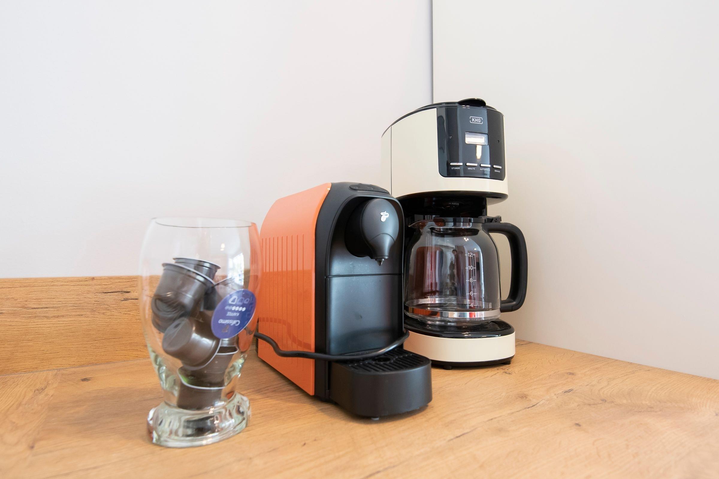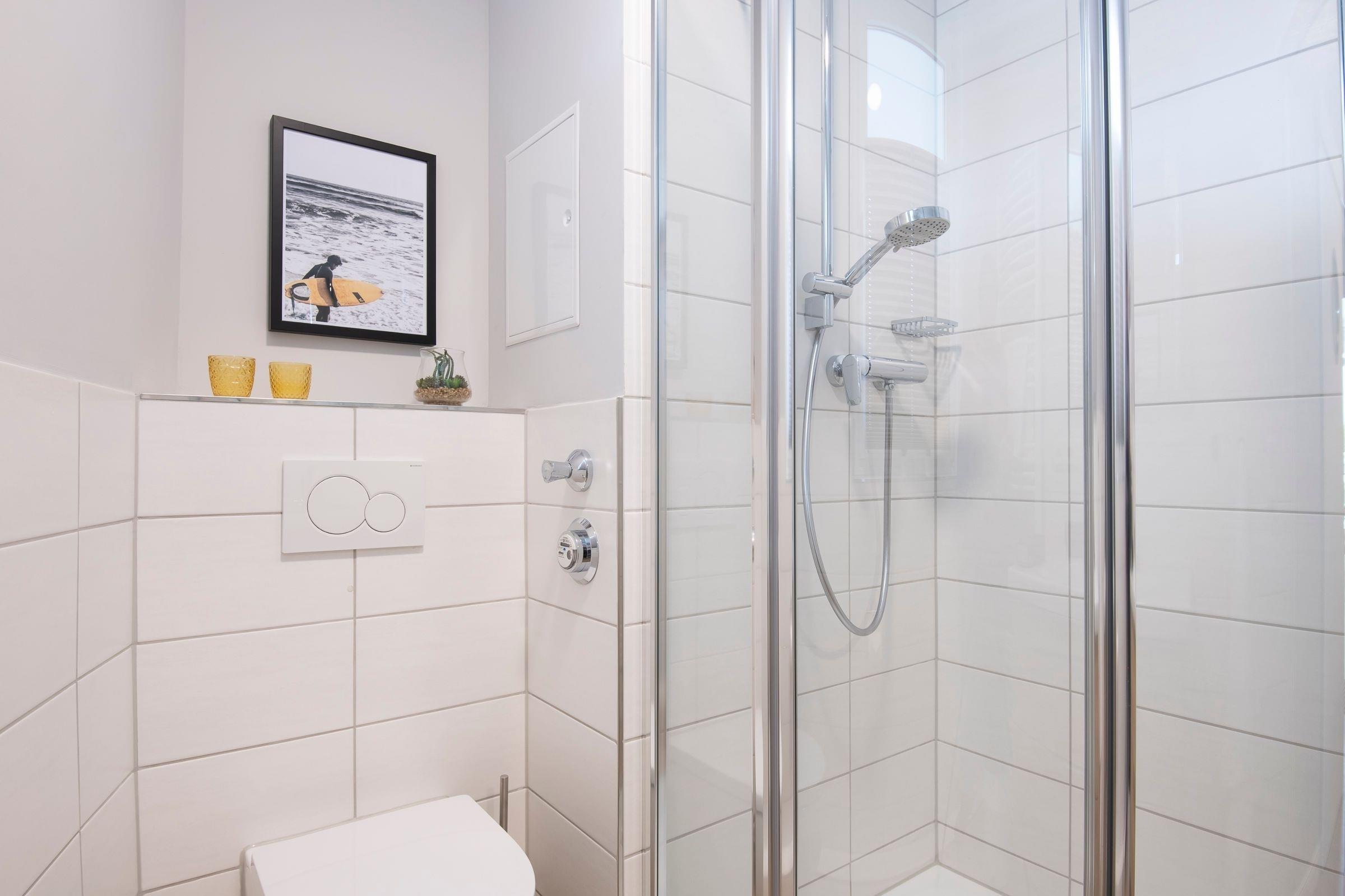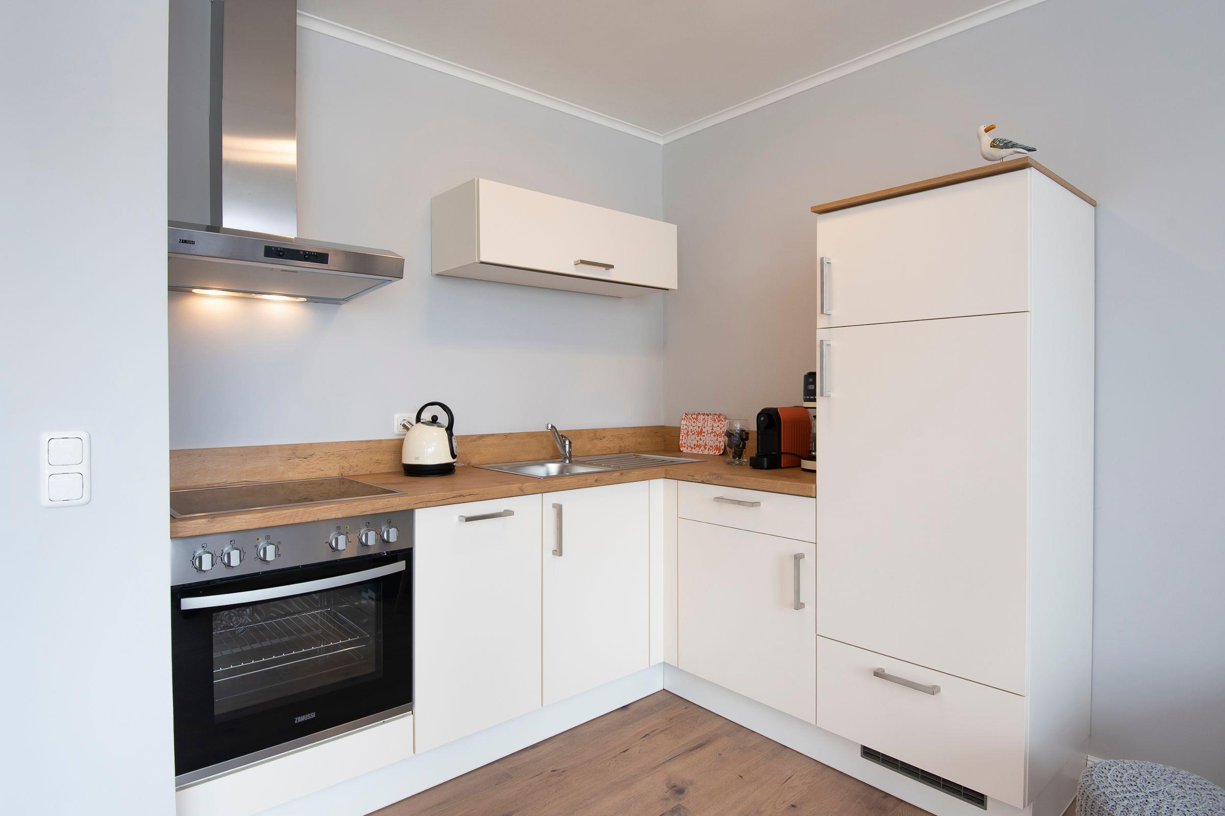 Der kombinierte Wohn- und Essbereich ist modern und freundlich eingerichtet. Farbliche Akzente wie z. B. eine leicht roséfarbene Wand und ein roter Sessel sind echte Hingucker und sorgen für Gemütlichkeit. Weiterhin befindet sich im Wohnbereich eine Schlafcouch (170x200 cm), ein Esstisch und ein Flachbildfernseher. Die Küche ist zum Wohnbereich hin offen und z. B. mit einem Backofen, einem Cerankochfeld, einem Kühlschrank und einem Geschirrspüler gut ausgestattet. Als Highlight in der Küche steht Ihnen eine Kaffee-Kapselmaschine (Cafissimo) zur Verfügung. Das innenliegende Schlafzimmer ist mit einem Doppelbett (140x200 cm) ausgestattet und sorgt mit einer Schiebetür für Ruhe und Komfort in der Nacht. Durch das Schlafzimmer gelangen Sie in das kleine Badezimmer mit WC, Dusche und Fenster. Im Waschbeckenunterschrank können Sie Ihre Badutensilien verstauen. Erholen Sie sich vom Alltag auf dem großen, möblierten Balkon. Der WLAN-Anschluss ist für Sie selbstverständlich kostenfrei.