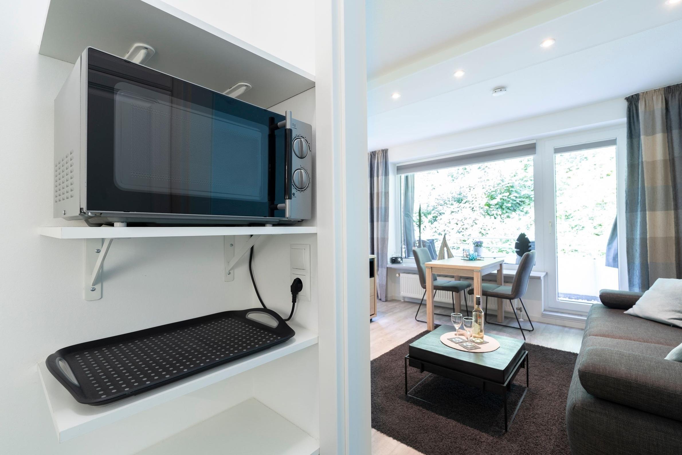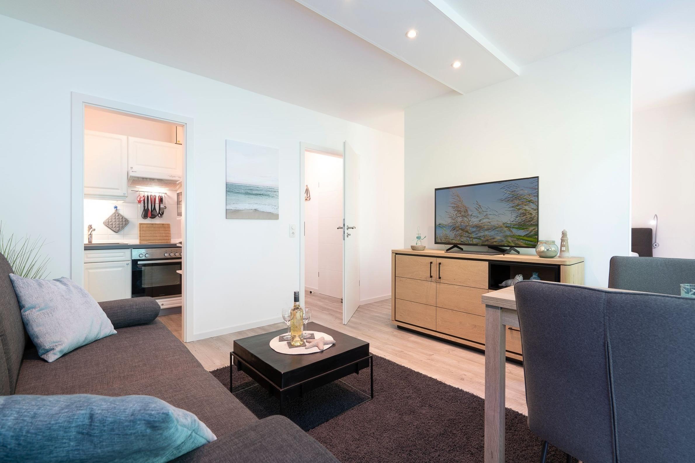 Durch den Flur geradeaus gelangen Sie in den Wohnbereich, der Sie mit einer stilvollen Einrichtung und liebevollen Details begeistern wird. Auf dem komfortablen Sofa können Sie gemütliche Abende vor dem großen Flachbildfernseher verbringen. Der Esstisch für 2 Personen befindet sich direkt am Fenster und lädt zu gemeinsamen Mahlzeiten ein. Vom Wohnbereich räumlich abgetrennt befindet sich der Schlafbereich mit einem Boxspring-Doppelbett (180x200 cm, durchgehende Matratze), einem weiteren Flachbildfernseher, zwei schmalen Kleiderschränken sowie zwei Nachttischen. Plissees sorgen im Wohn- und Schlafbereich für angenehme Verdunkelung in der Nacht. Die offene, gut ausgestattete Küche mit weißen Fronten grenzt an den Wohnbereich. Auf kleinem Raum sind alle notwendigen Küchengeräte wie z. B. ein Backofen, ein Kühlschrank, ein 4-Platten-Cerankochfeld und eine Kaffeemaschine vorhanden. Das innenliegende, hell geflieste Badezimmer verfügt über eine Dusche, ein WC sowie über ein Waschbecken mit Spiegel- und Unterschrank als Stauraum für Ihre Badutensilien. Vom Wohnbereich aus gelangen Sie auf den überdachten, möblierten Balkon. Ein Sicht- und Windschutz sorgt für Privatsphäre und Erholung. Erholen Sie sich dort von einem langen Tag am Strand, von einer großen Fahrradtour oder genießen Sie die Urlaubszeit bei einem guten Buch oder einem Glas Wein.