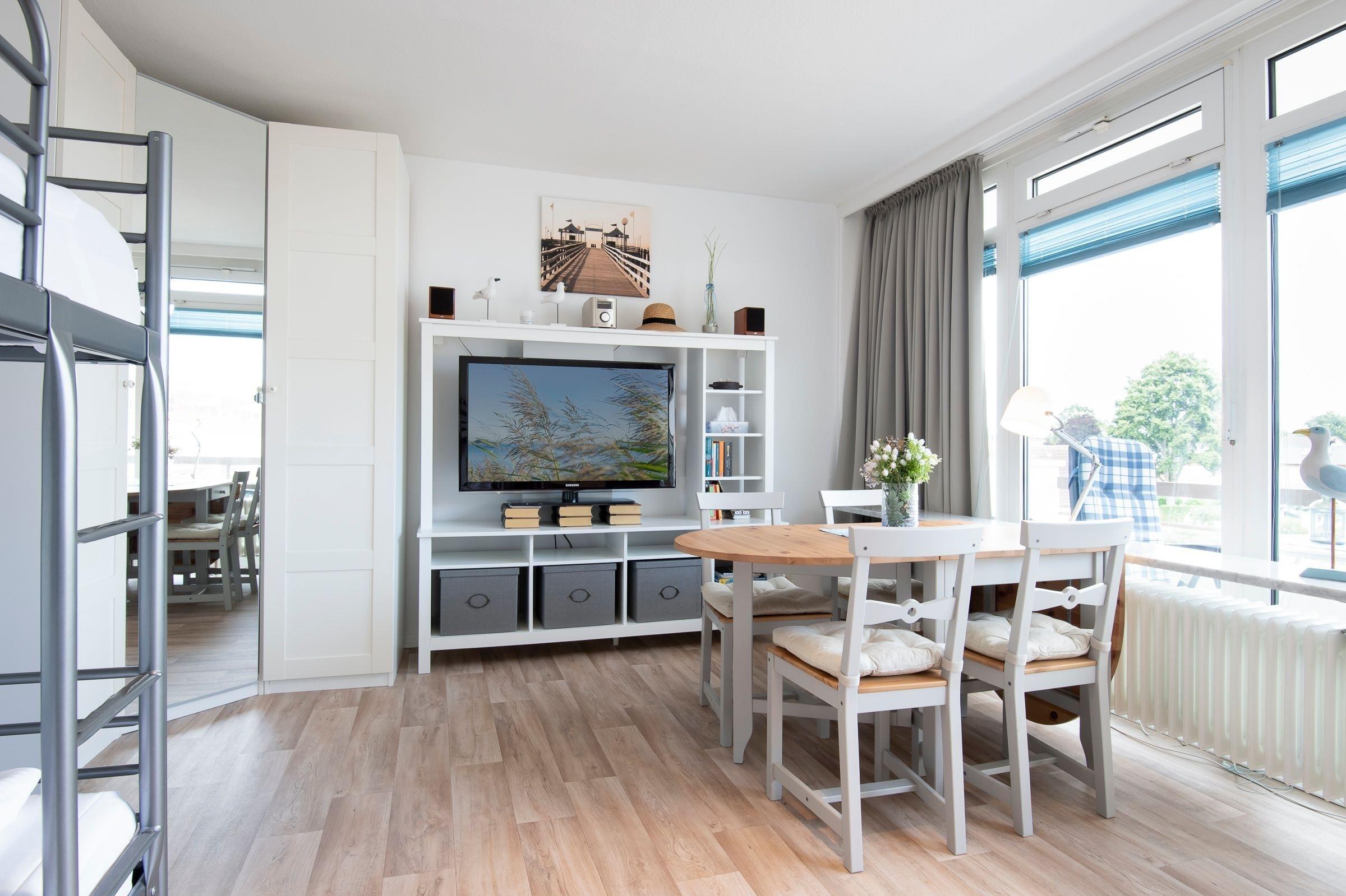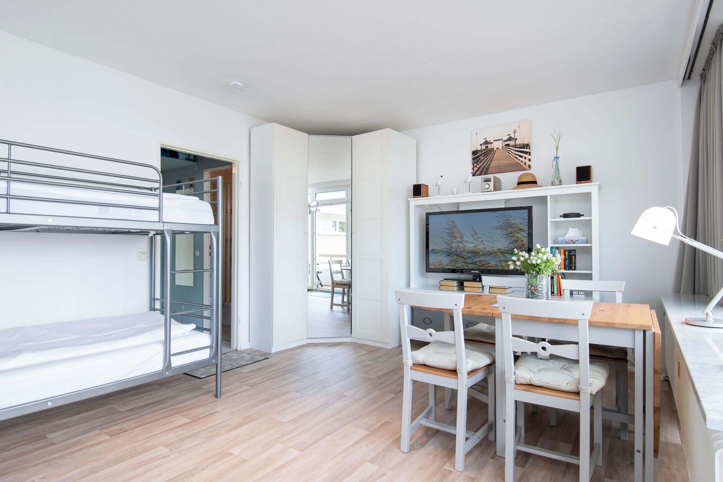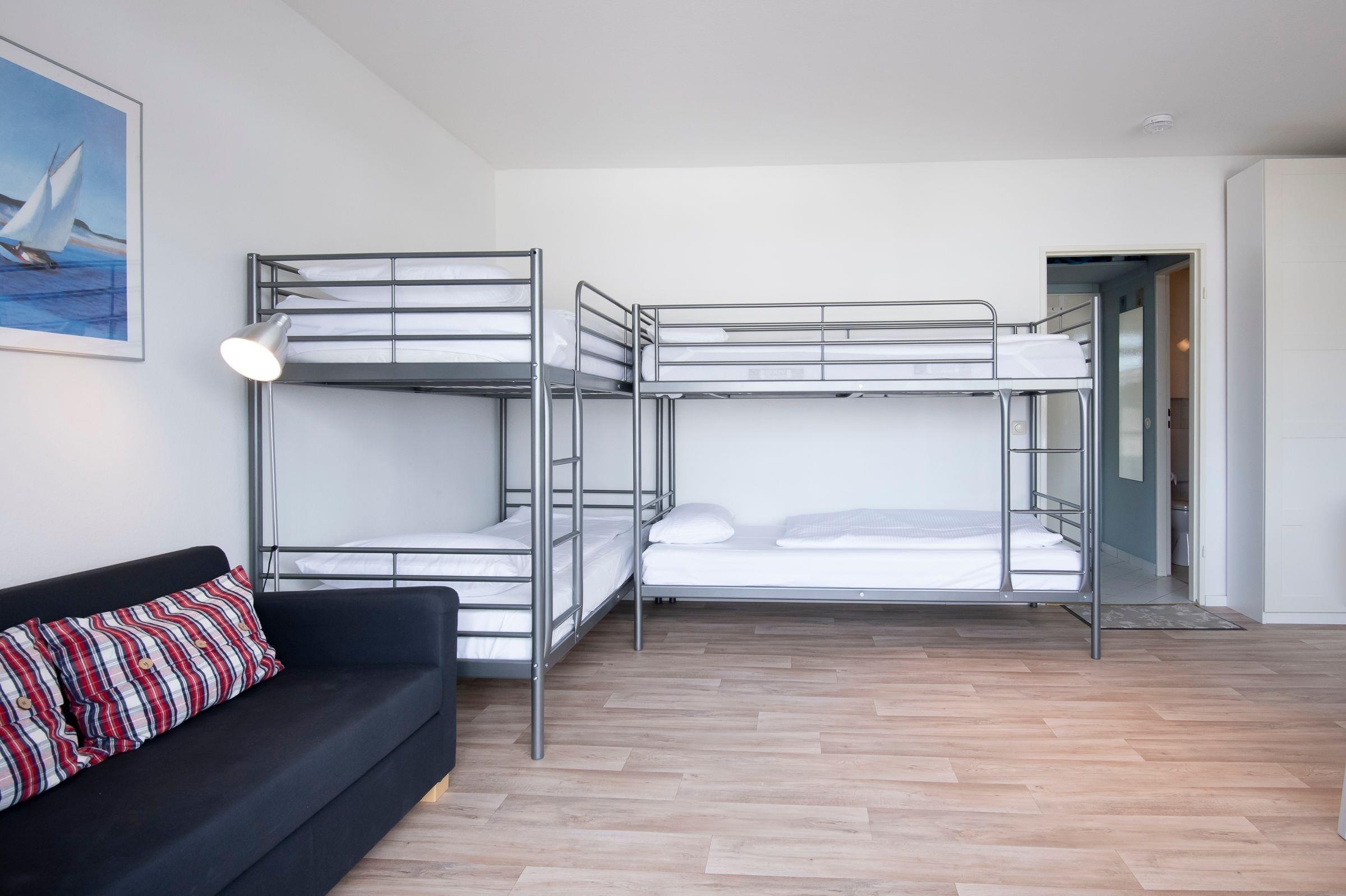 Vom Flur der Wohnung aus gelangen Sie rechts in die Küche, geradeaus in den kombinierten Wohn- und Schlafbereich mit Zugang zum möblierten Balkon und links in das innenliegende Badezimmer. Als Schlafmöglichkeiten im Wohnbereich stehen Ihnen 2 Etagenbetten (je 90x200 cm) zur Verfügung. Weiterhin sind ein Sofa, ein Esstisch mit 4 Stühlen sowie ein Flachbildfernseher vorhanden. Ihre Urlaubsgarderobe können Sie bequem im großen Kleiderschrank verstauen. Die separate Küche ist u. a. mit einem Herd (4 Kochplatten), einem Backofen und einem Kühlschrank mit Gefrierfach ausgestattet. Eine Kaffeemaschine für den Kaffeegenuss am Morgen oder am Nachmittag steht Ihnen selbstverständlich auch zur Verfügung. Das innenliegende Badezimmer verfügt über eine Dusche. Erholsame Stunden können Sie auf dem überdachten, möblierten Balkon verbringen.