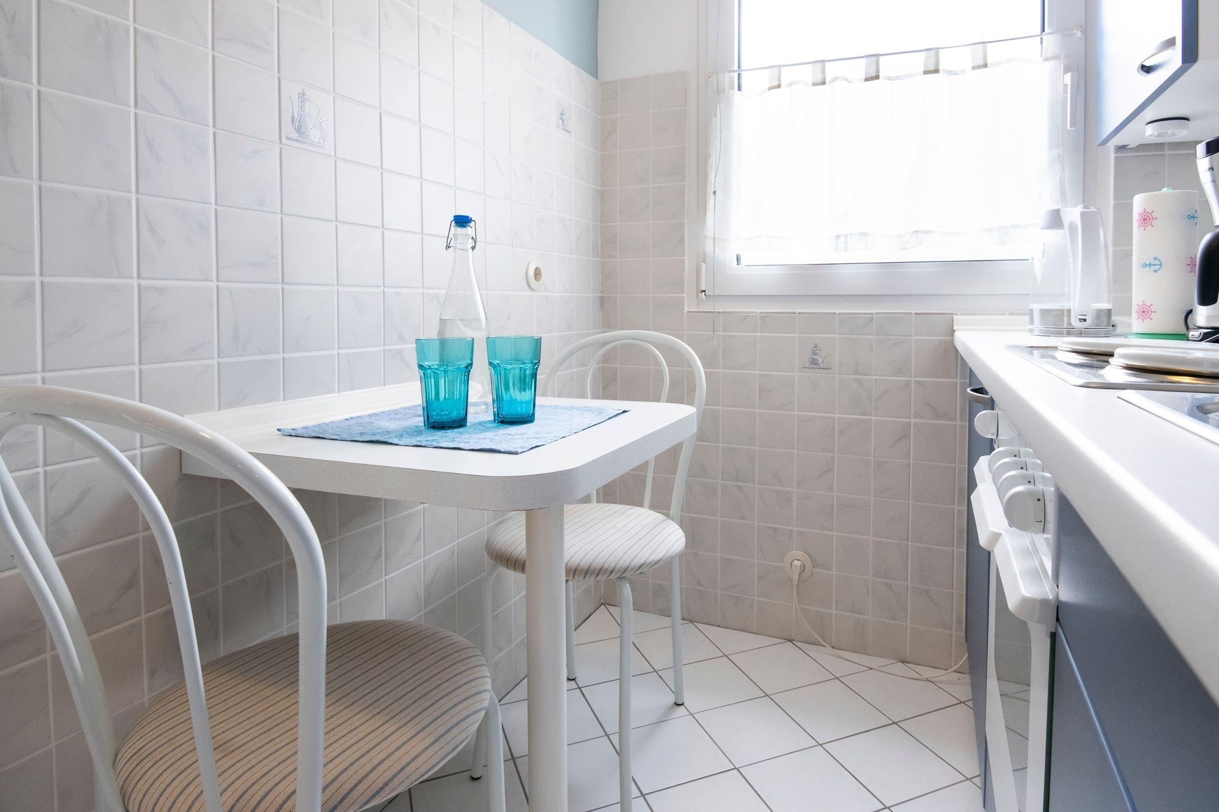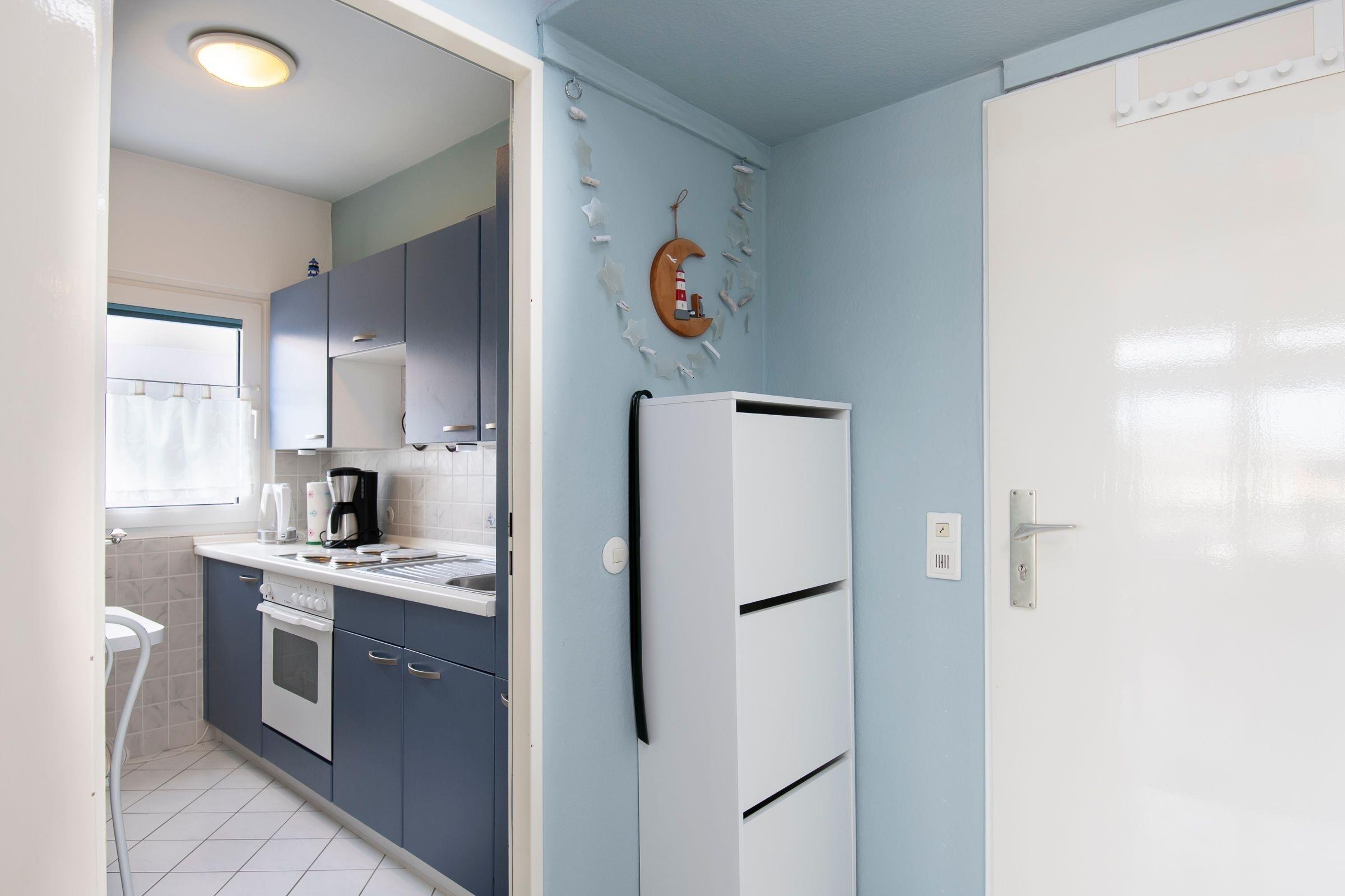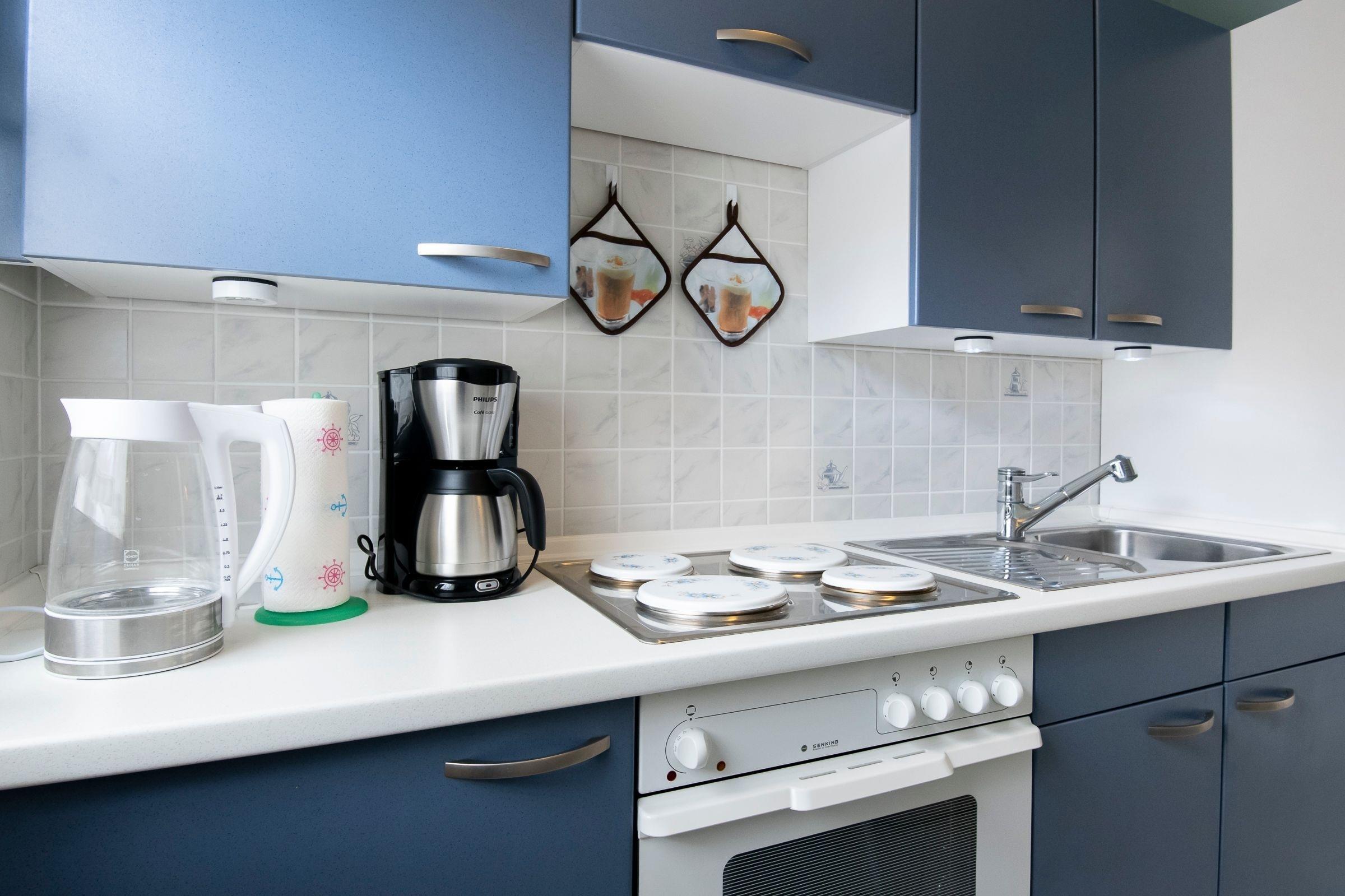 Vom Flur der Wohnung aus gelangen Sie rechts in die Küche, geradeaus in den kombinierten Wohn- und Schlafbereich mit Zugang zum möblierten Balkon und links in das innenliegende Badezimmer. Als Schlafmöglichkeiten im Wohnbereich stehen Ihnen 2 Etagenbetten (je 90x200 cm) zur Verfügung. Weiterhin sind ein Sofa, ein Esstisch mit 4 Stühlen sowie ein Flachbildfernseher vorhanden. Ihre Urlaubsgarderobe können Sie bequem im großen Kleiderschrank verstauen. Die separate Küche ist u. a. mit einem Herd (4 Kochplatten), einem Backofen und einem Kühlschrank mit Gefrierfach ausgestattet. Eine Kaffeemaschine für den Kaffeegenuss am Morgen oder am Nachmittag steht Ihnen selbstverständlich auch zur Verfügung. Das innenliegende Badezimmer verfügt über eine Dusche. Erholsame Stunden können Sie auf dem überdachten, möblierten Balkon verbringen.