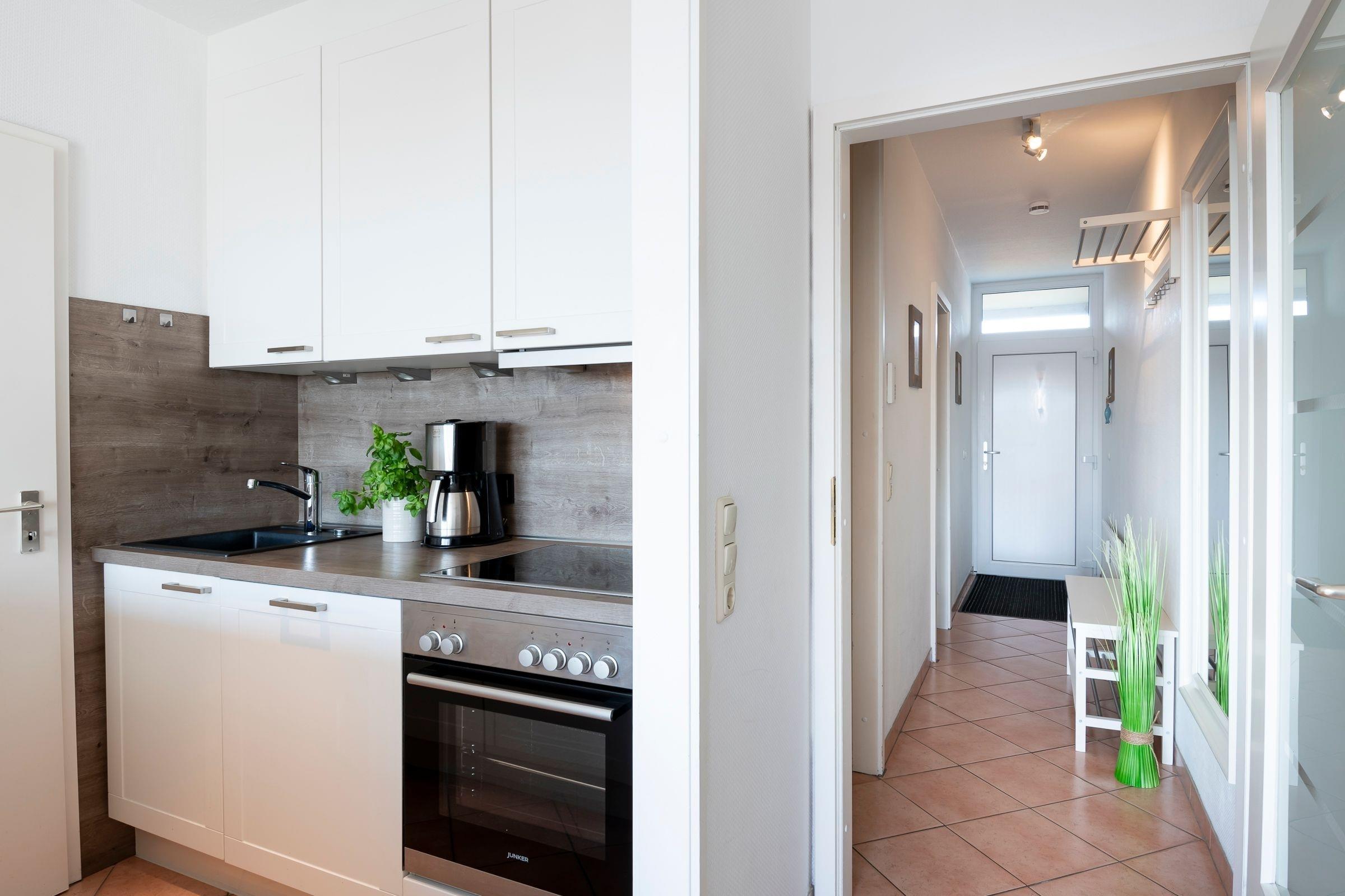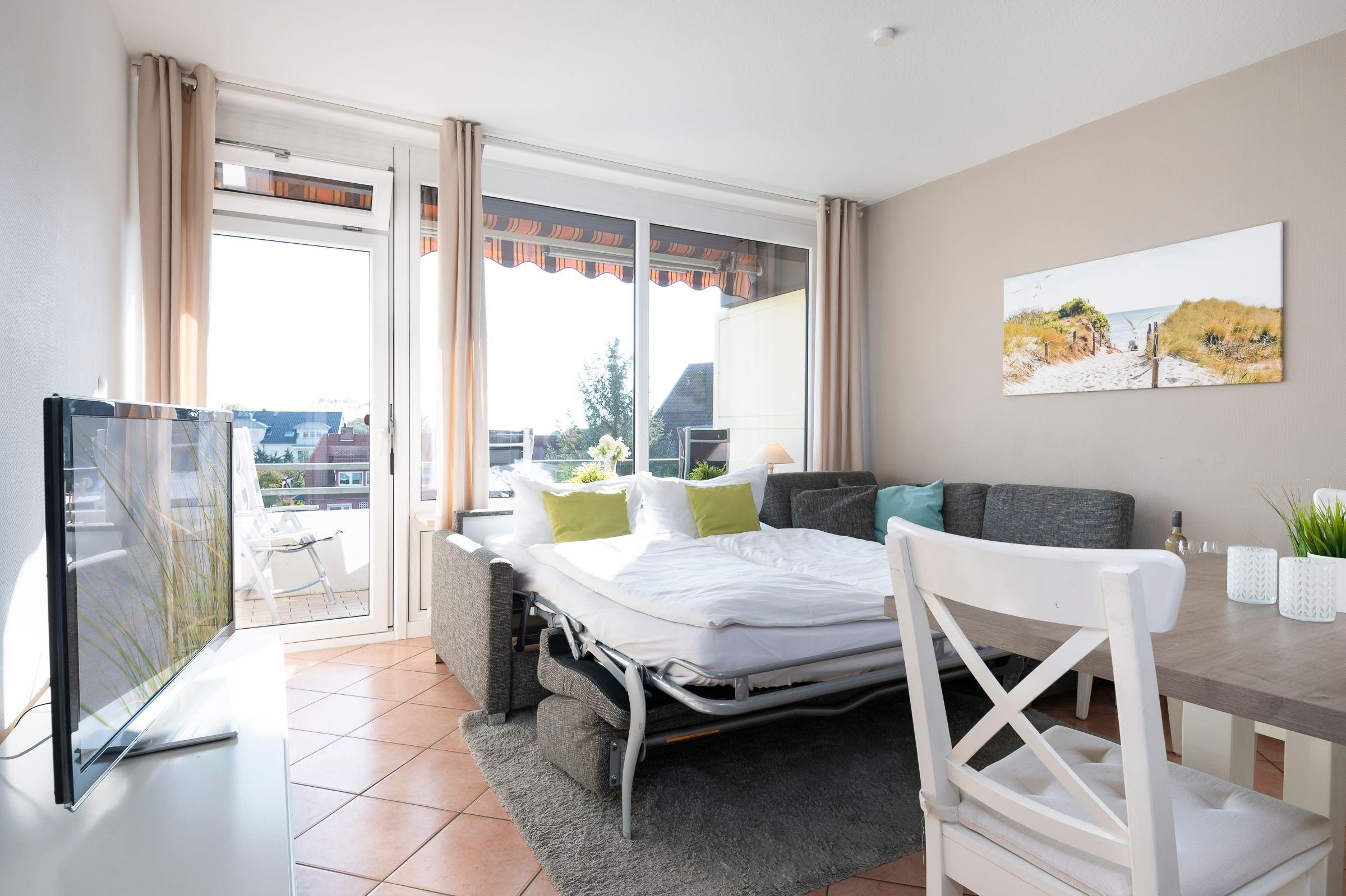 Die Wohnung verfügt über einen hellen Wohn-Schlafraum mit großer Schlafcouch und elektrischen Rollläden zur Verdunklung, sowie einen 42-Flachbildfernseher mit 3D-Technik. Zudem befindet sich im Wohnbereich der Esstisch mit vier Sitzgelegenheiten und eine offene, voll ausgestattet Wohnküche mit Spülmaschine. Vom Wohnzimmer aus gelangen Sie auf den Balkon mit Südost-Ausrichtung und saisonalem Ostsee-Fernblick. Genießen Sie ruhige Nächte im Schlafzimmer mit bequemen Doppelbett (2x90x200 cm), 32-Flachbildfernseher und Rollläden. Das Badezimmer ist gradlinig und modern gehalten und ausgestattet mit einer Dusche und WC. Über den kostenfreien WLAN-Zugang können Sie nicht nur bequem die Urlaubsbilder mit Freunden teilen - Sie können auch über das Internet-Radio mit USB und Bluetooth eine Wohlfühlatmosphäre schaffen.