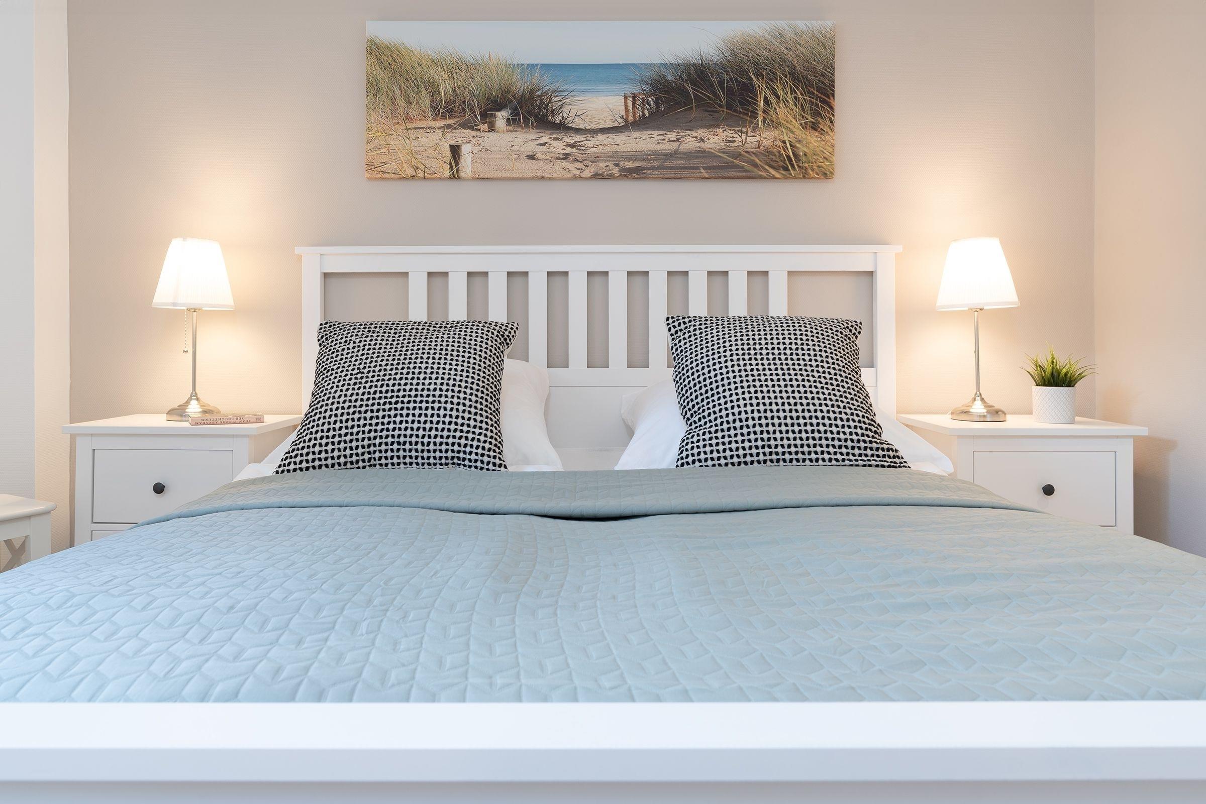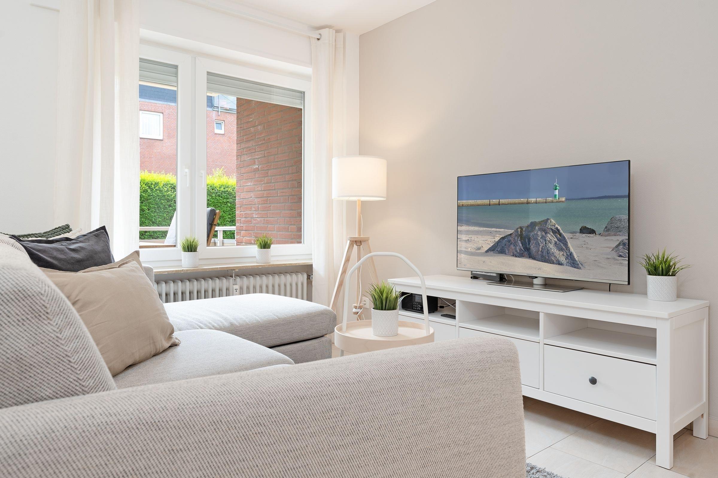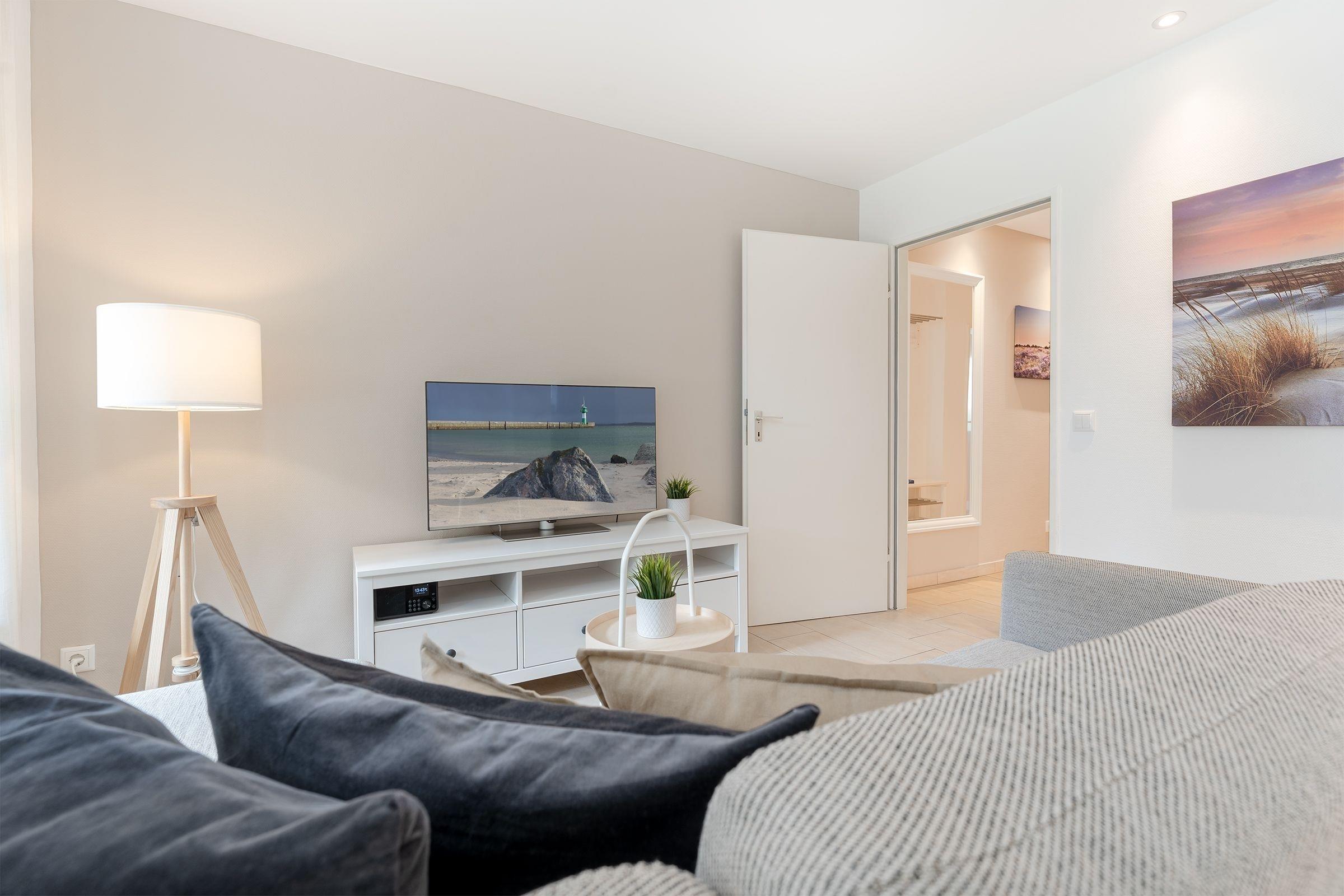 Herzlich willkommen in der Wohnung Küstenkind - hier trifft Moderne auf guten Geschmack. Der helle und großzügige Wohn-Essraum mit bequemer Couch und 43-Flachbildfernseher sowie integrierter, sehr gut ausgestatteter Küche lädt zu geselligen Abenden ein. Von hier gelangen Sie auf den Balkon mit Südwest-Ausrichtung. Lassen Sie den Urlaubstag gemütlich bei einem Glas Wein ausklingen, während Ihnen die frische Meeresluft um die Nase weht. Die beiden separaten Schlafzimmer verfügen jeweils über ein Doppelbett (2x 90x200 cm bzw. Boxspringbett mit 140x200 cm) sowie einen Kleiderschrank bzw. eine Kommode. In beiden Schlafzimmern befindet sich zudem ein 32-Flachbildfernseher. Das moderne Duschbad ist hell gefliest.