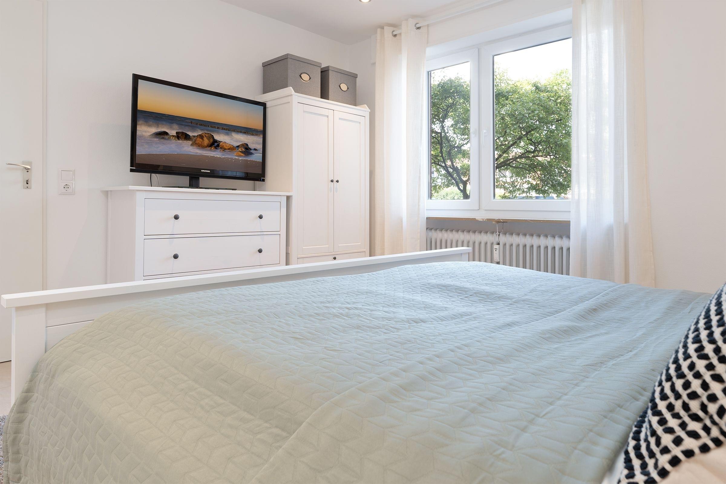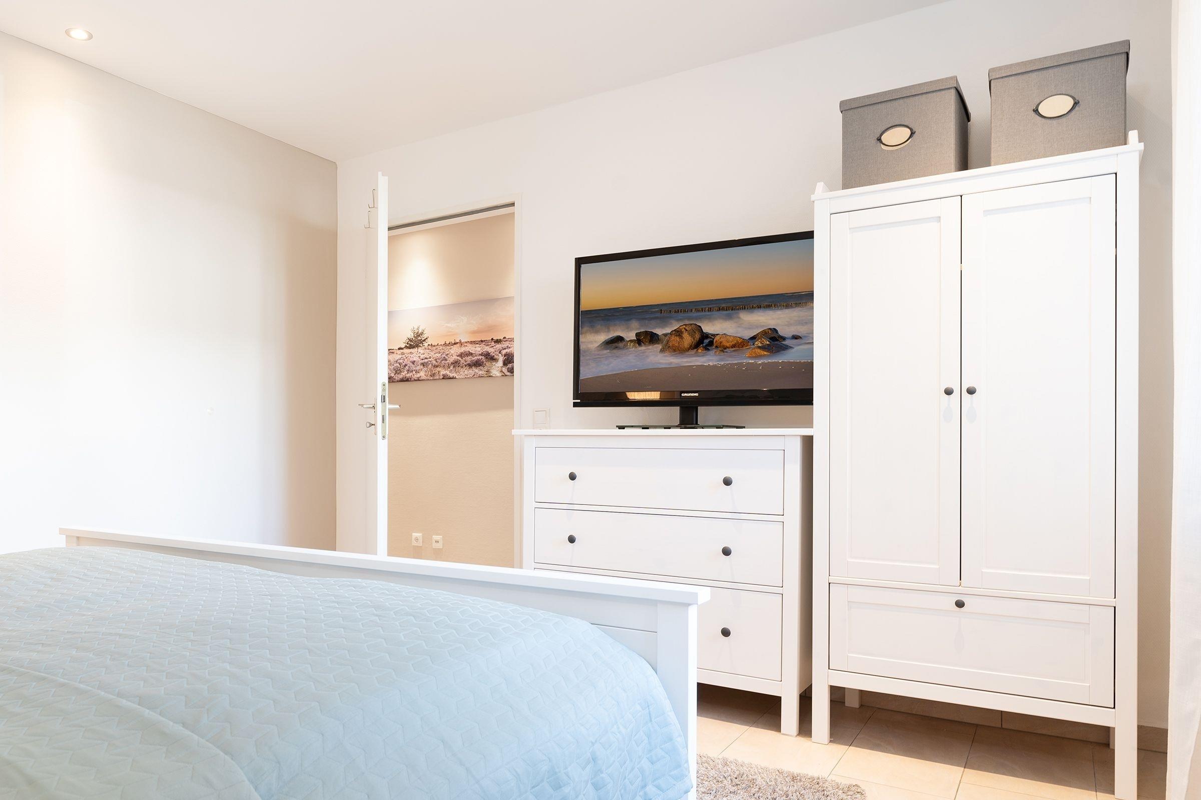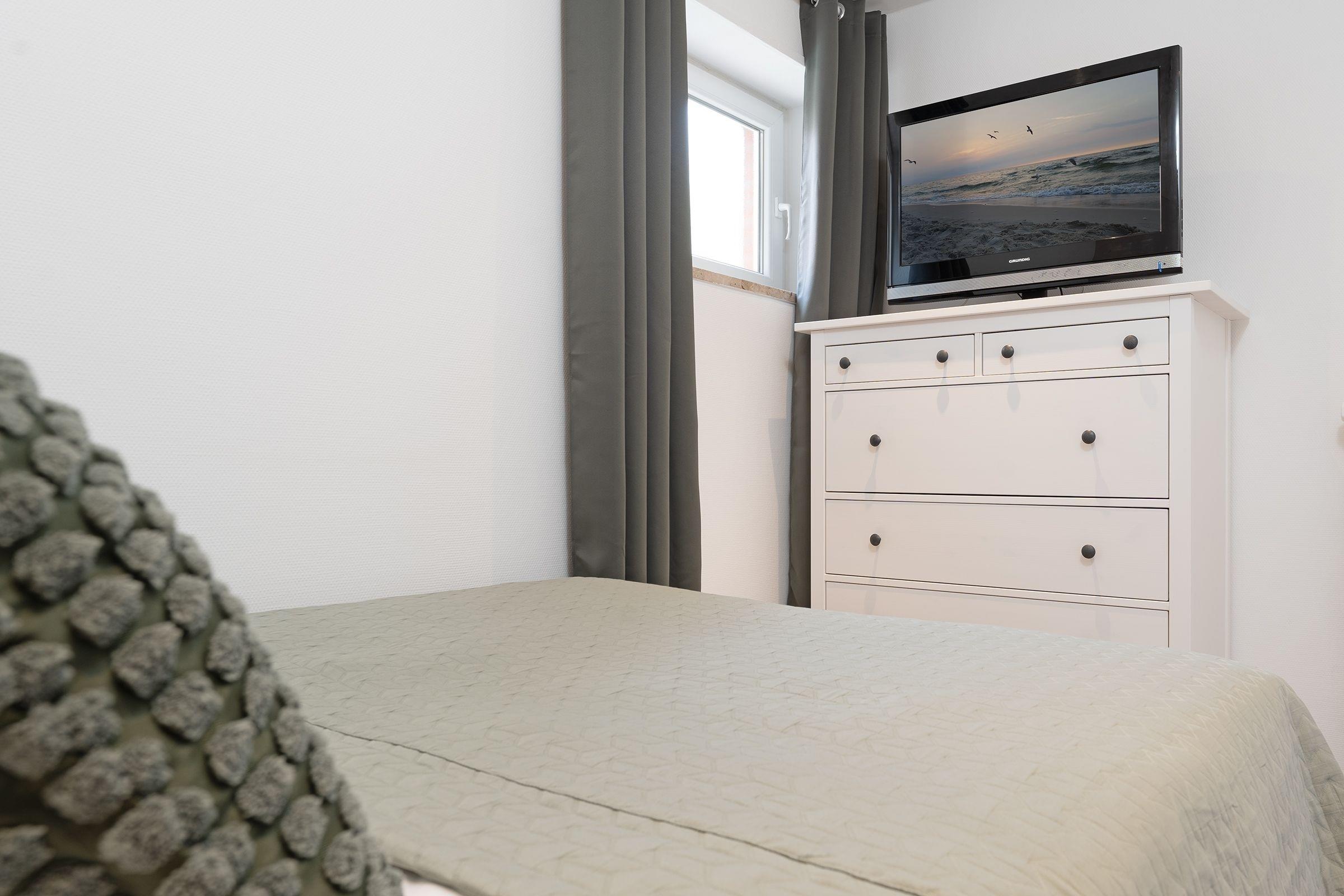 Schlafzimmer 2: 1 Französisches Boxspringbett (140x200 cm), TV, Kommode, Gardinen zur Verdunklung, kein Platz für ein Babybett