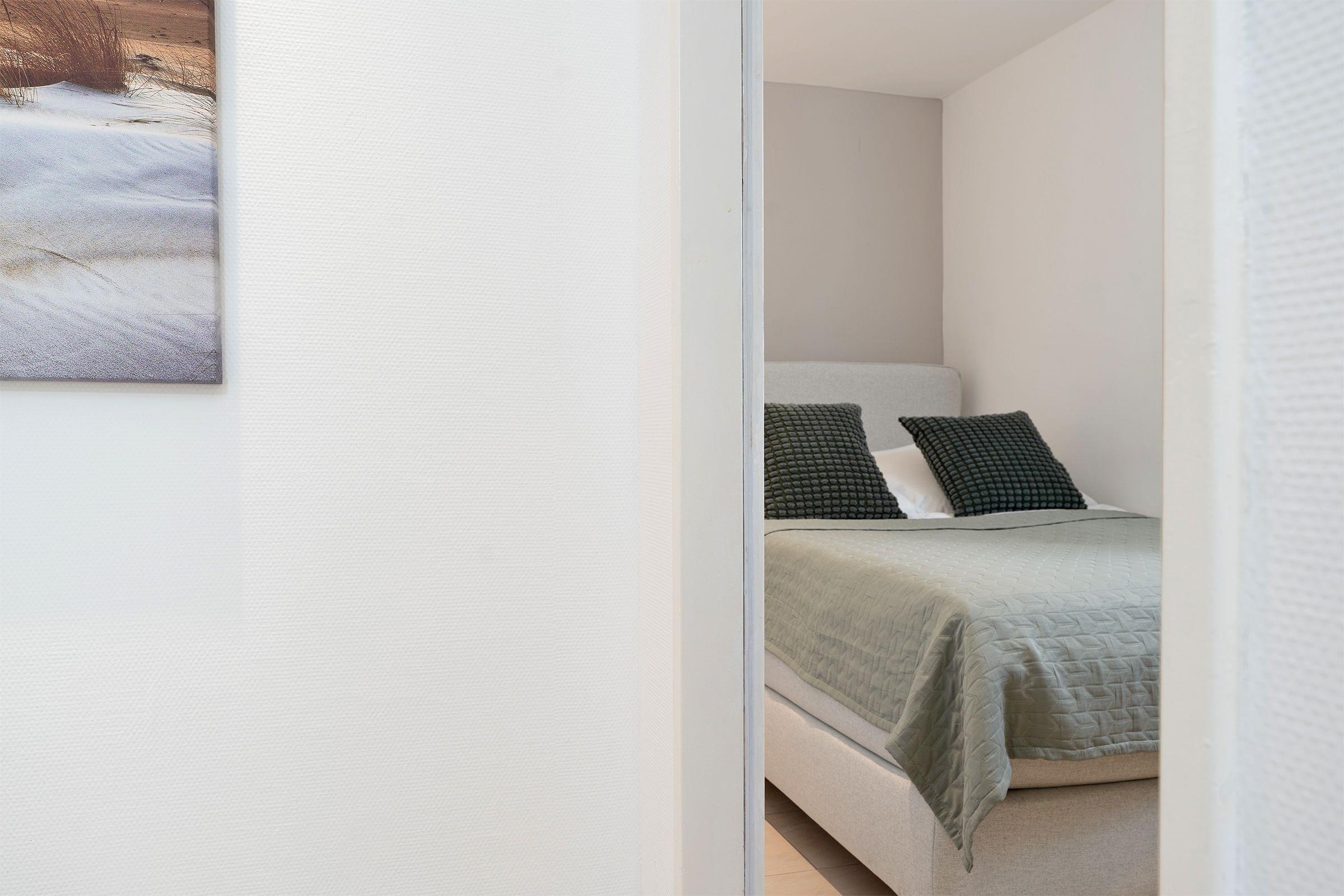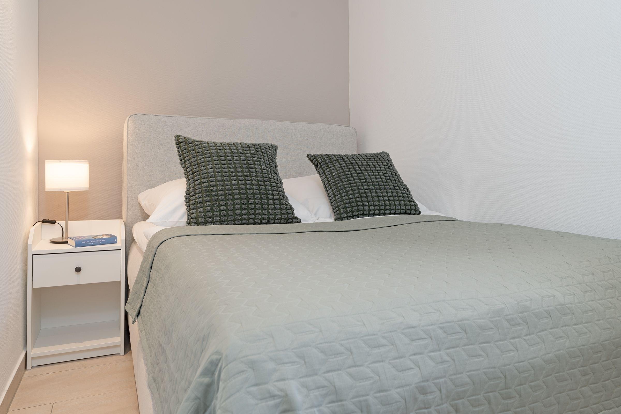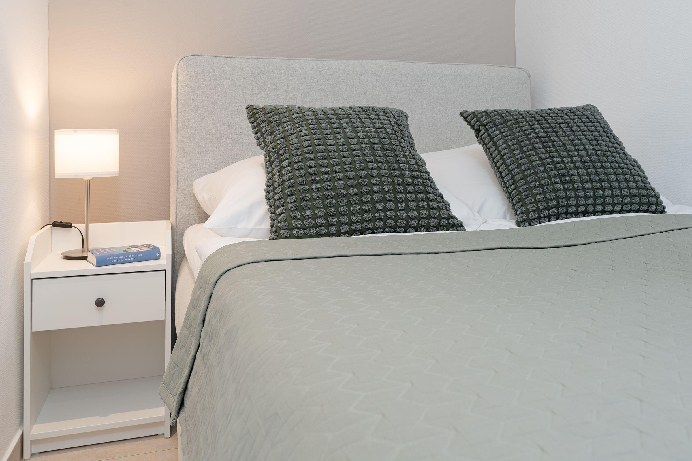 Schlafzimmer 2: 1 Französisches Boxspringbett (140x200 cm), TV, Kommode, Gardinen zur Verdunklung, kein Platz für ein Babybett