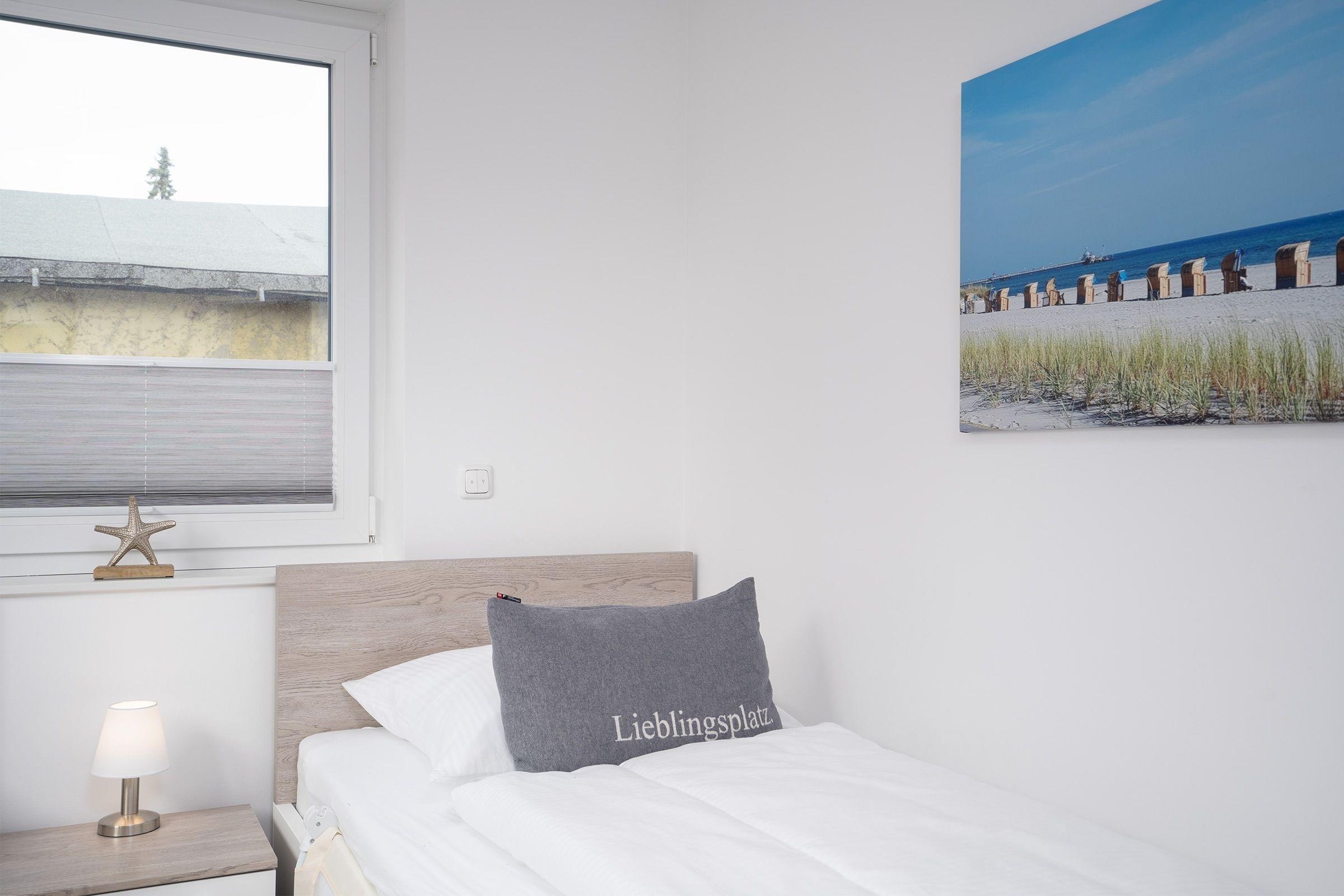 Schlafzimmer 2: 2 Einzelbetten (je 90x200 cm), Verdunkelung (Rollos), TV, Platz für Kinderbett