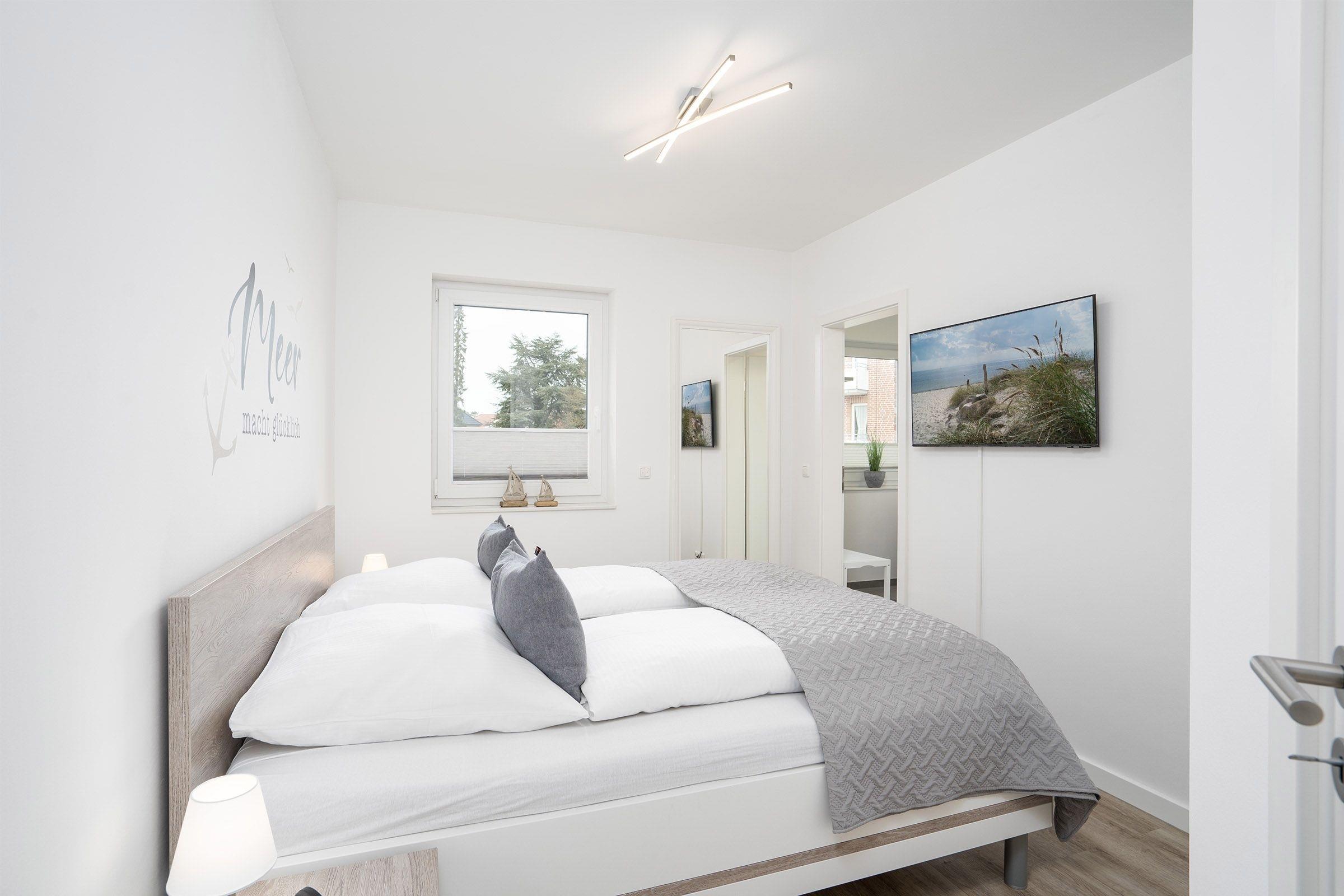 Schlafzimmer 1: 1 Doppelbett (2x 90x200 cm), Verdunkelung (Rollos), TV, kein Platz für Kinderbett