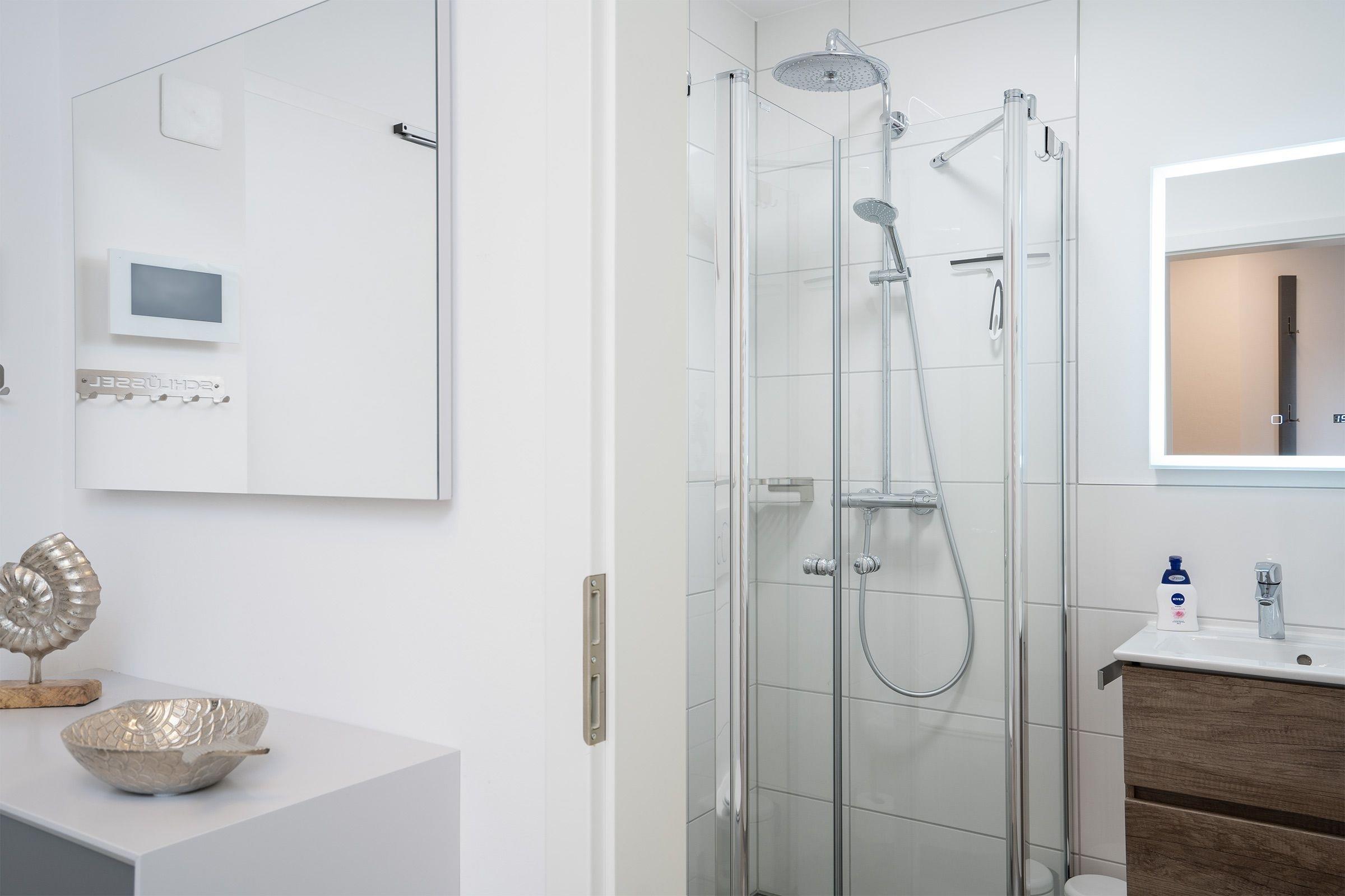 Der lichtdurchflutete Wohn- und Essbereich erwartet Sie mit einem komfortablen Sofa, einem Flachbildfernseher und Zugang zum Balkon. Die voll ausgestattete Küche grenzt offen an den Wohnbereich und bietet Ihnen Annehmlichkeiten wie z. B. einen Backofen in komfortabler Arbeitshöhe, eine Mikrowelle, Kühlschrank, Geschirrspüler sowie eine Cafissimo-Kapselmaschine für den besonderen Kaffeegenuss. In den zwei separaten Schlafzimmern erwarten Sie ein Doppelbett (2x 90x200 cm) bzw. zwei Einzelbetten (je 90x200 cm, eins davon mit Rausfallschutz). Alle Fenster lassen sich durch Außenrollos angenehm abdunkeln, außerdem wurde an allen Fenstern und an der Balkontür jeweils Fliegengitter angebracht. Für weiteren Komfort sorgen ein Badezimmer mit WC und Dusche sowie ein größeres Badezimmer mit Doppelwaschbecken, WC und Dusche. Der möblierte Balkon mit Süd-Ausrichtung lädt Sie zu vielen Sonnenstunden ein.