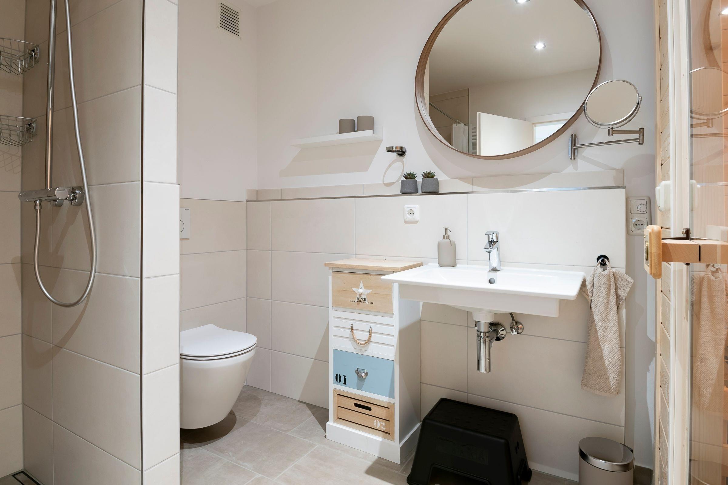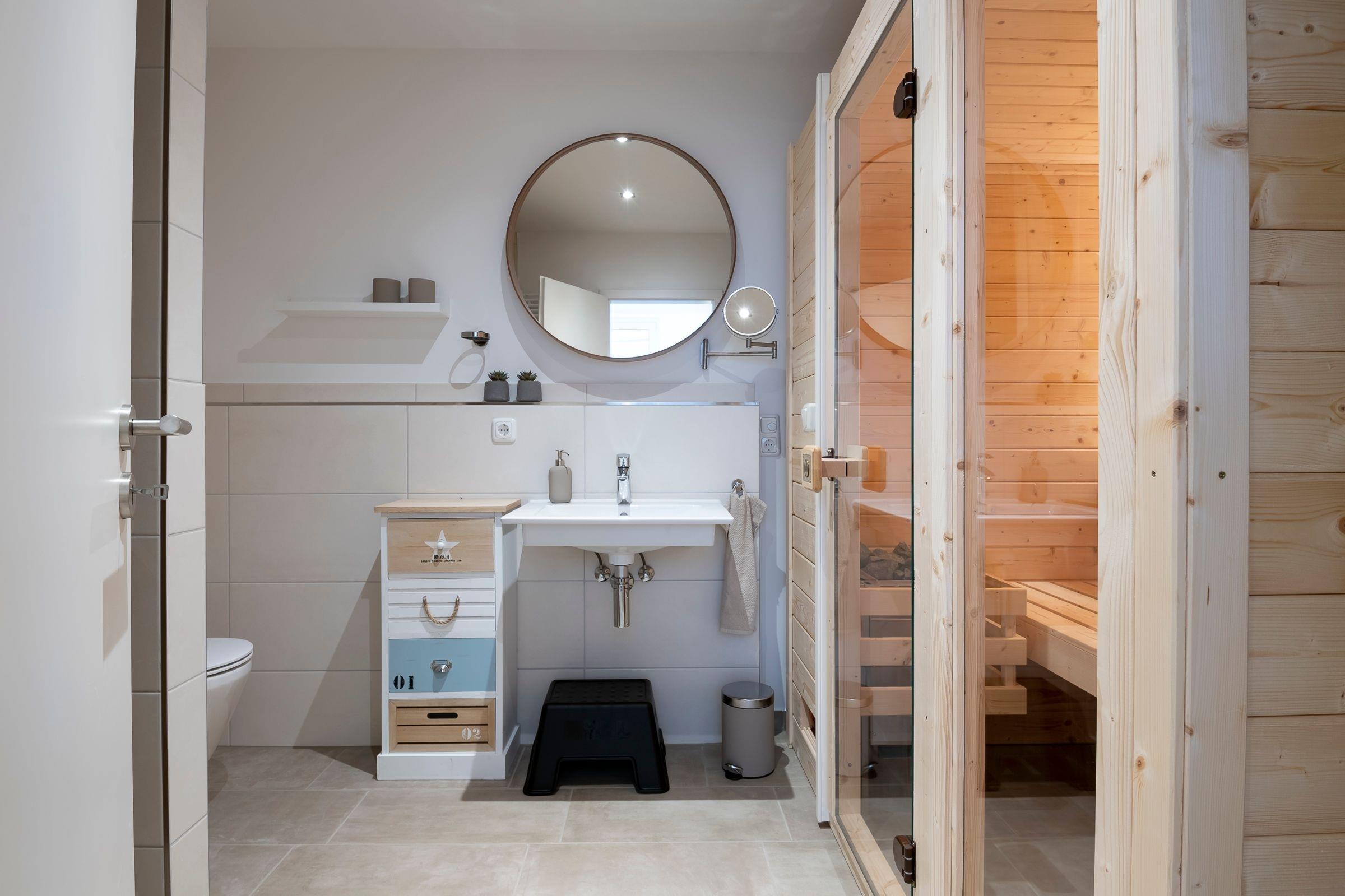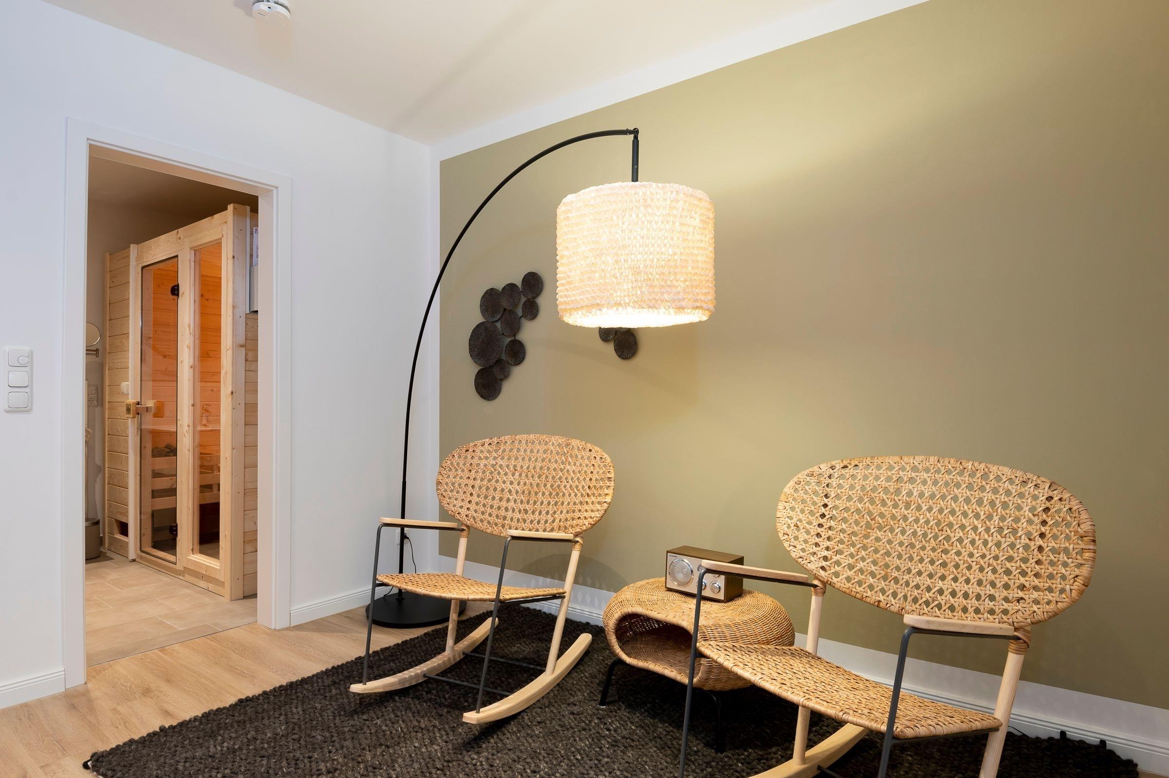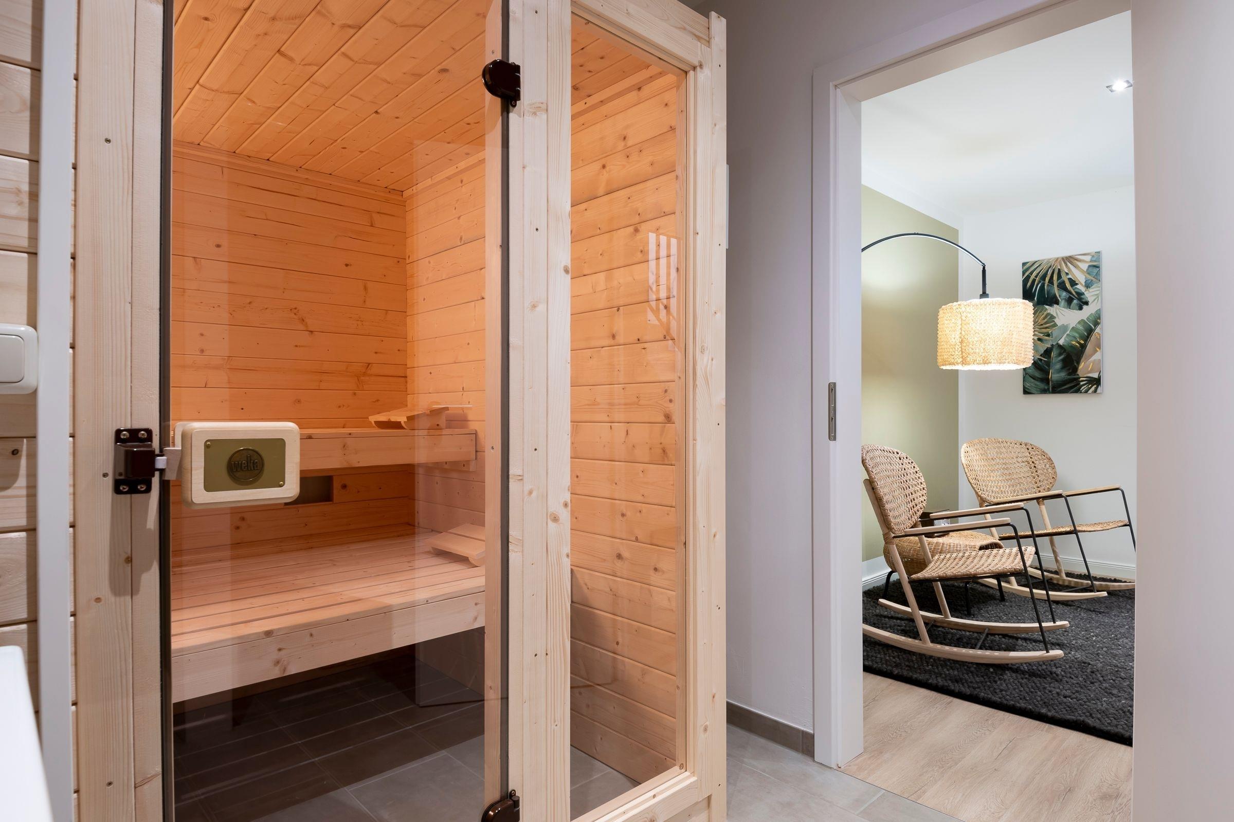 Geradeaus durch den hell und freundlich gestalteten Flur mit Garderobe erreichen Sie das Herzstück dieser Wohnung: den kombinierten Wohn- und Essbereich mit Zugang zum großen, teilüberdachten Balkon mit Süd-West-Ausrichtung. Im Wohnbereich erwartet Sie ein gemütliches Sofa (Liegefläche 140x200 cm), ein Sessel sowie ein Flachbildfernseher. Entspannten Abenden steht hier nichts im Wege! Die angrenzende, offene Küche ist voll ausgestattet und lädt am runden Esstisch zu gemeinsamen Mahlzeiten ein. Das separate Schlafzimmer mit Doppelbett (2x 90x200 cm) ist mit einem Kleiderschrank und einem Fernseher ausgestattet. Auf dieser Ebene befindet sich ein Badezimmer mit WC, Dusche und Waschtisch. Im Souterrain erwartet Sie ein weiteres Zimmer als Rückzugsort mit Sofa, Kleiderschrank und Fernseher. Ein großzügiges Badezimmer mit WC und bodengleicher Dusche sowie eine eigene Sauna (1€ / 20 Minuten) und ein angrenzender Ruheraum mit gemütlichen Schaukelstühlen erwarten Sie ebenfalls im Souterrain.