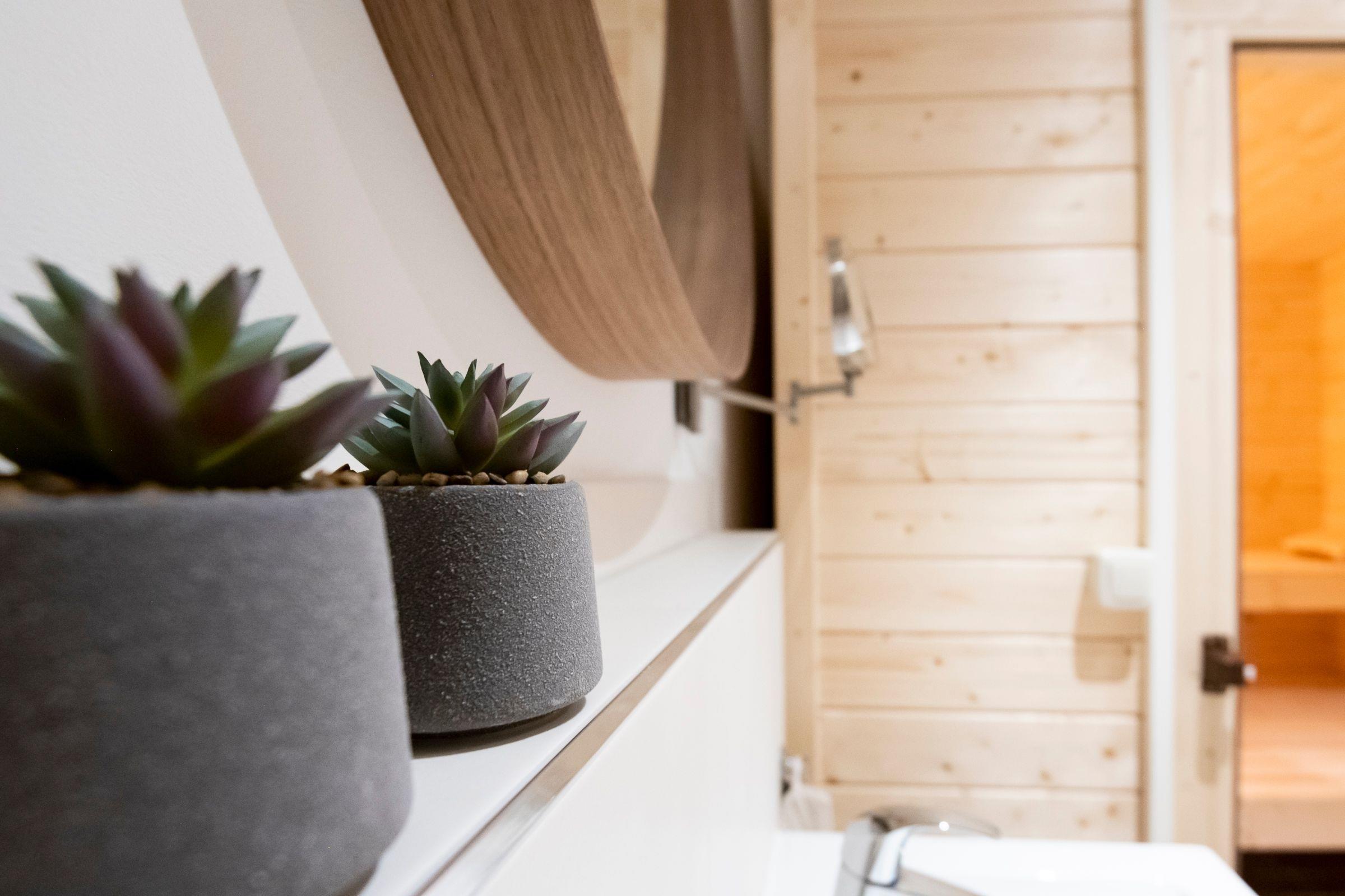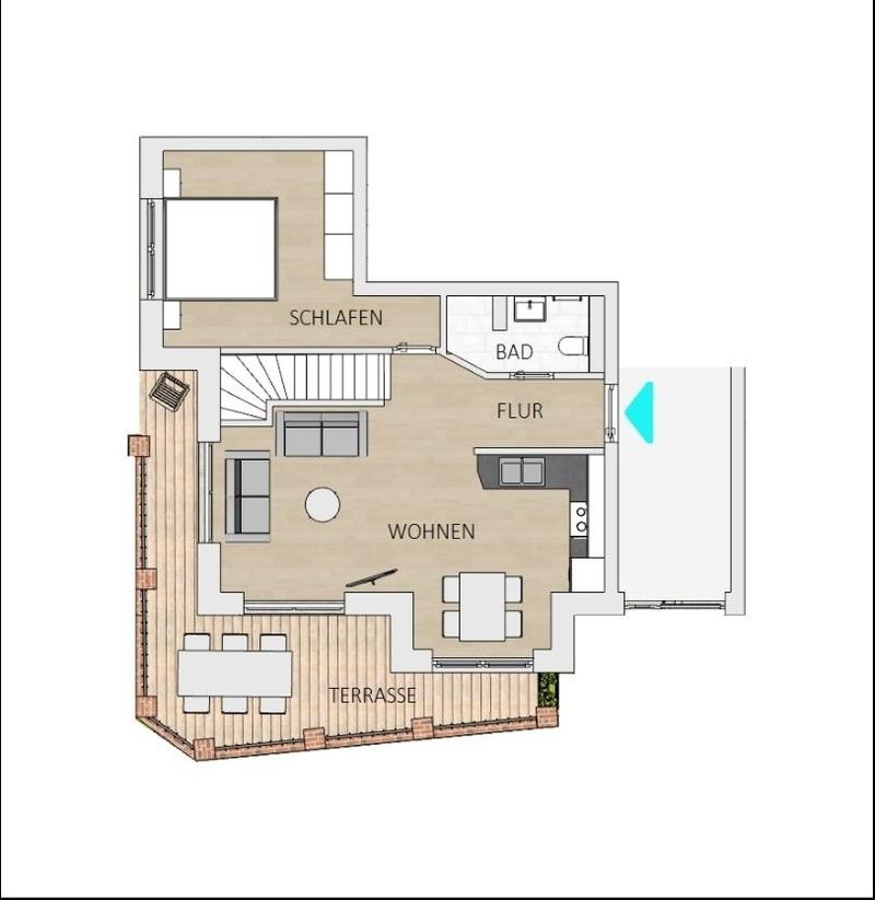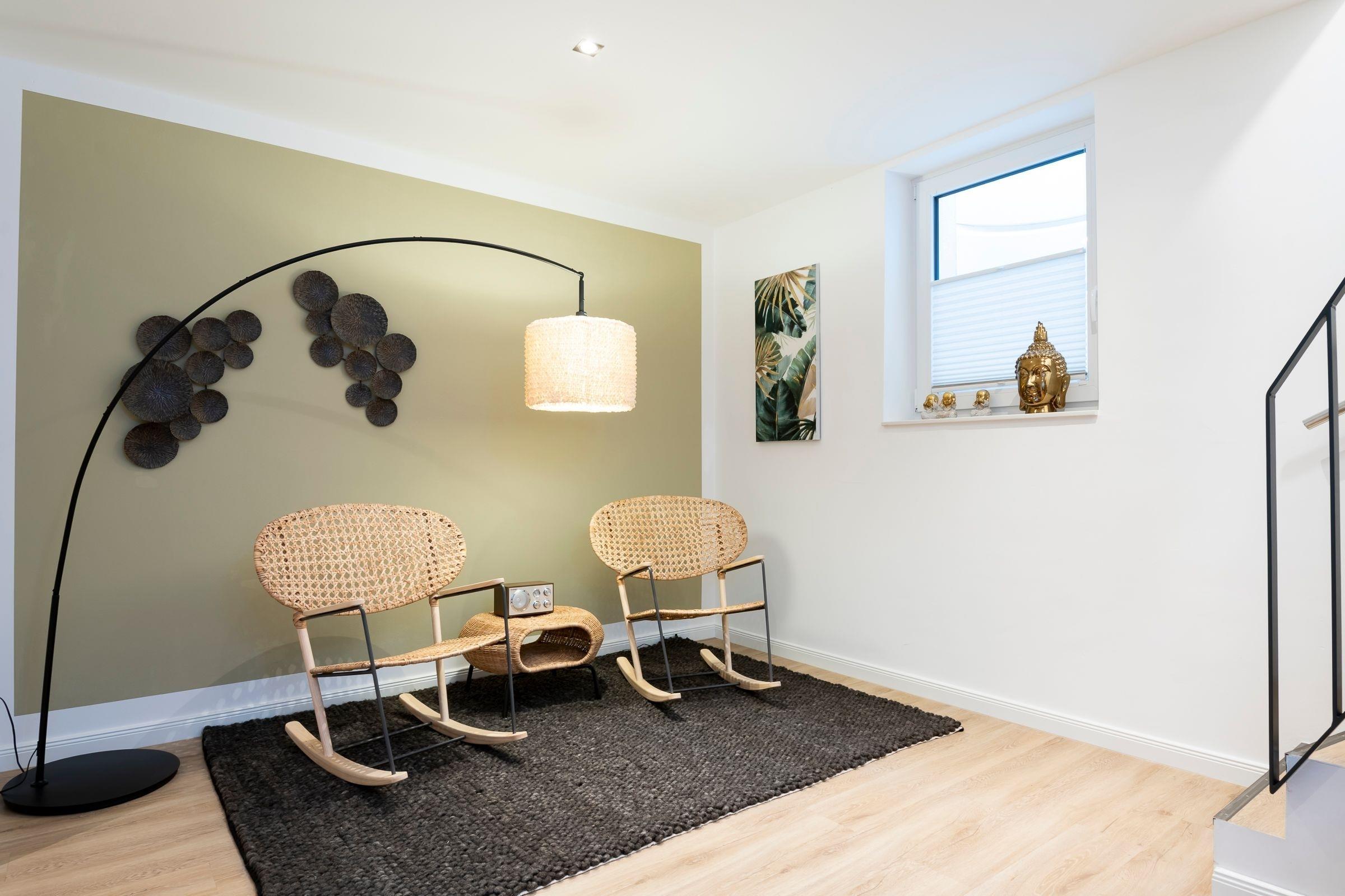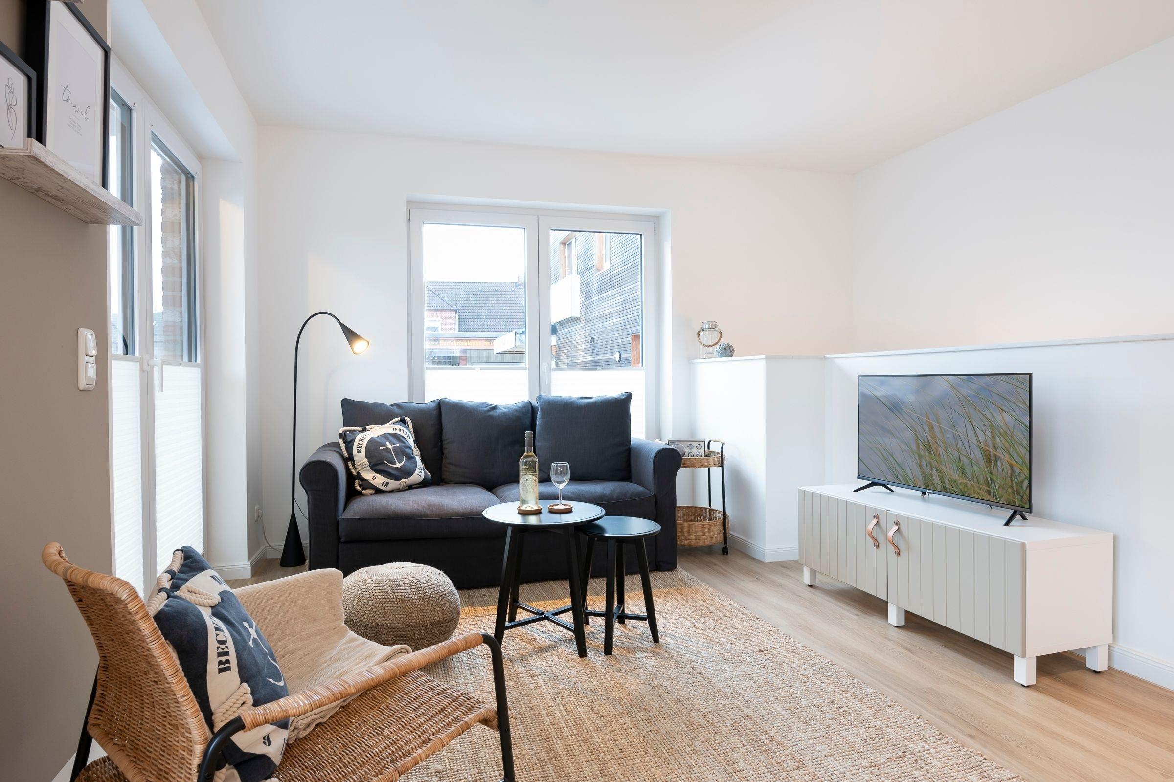 Geradeaus durch den hell und freundlich gestalteten Flur mit Garderobe erreichen Sie das Herzstück dieser Wohnung: den kombinierten Wohn- und Essbereich mit Zugang zum großen, teilüberdachten Balkon mit Süd-West-Ausrichtung. Im Wohnbereich erwartet Sie ein gemütliches Sofa (Liegefläche 140x200 cm), ein Sessel sowie ein Flachbildfernseher. Entspannten Abenden steht hier nichts im Wege! Die angrenzende, offene Küche ist voll ausgestattet und lädt am runden Esstisch zu gemeinsamen Mahlzeiten ein. Das separate Schlafzimmer mit Doppelbett (2x 90x200 cm) ist mit einem Kleiderschrank und einem Fernseher ausgestattet. Auf dieser Ebene befindet sich ein Badezimmer mit WC, Dusche und Waschtisch. Im Souterrain erwartet Sie ein weiteres Zimmer als Rückzugsort mit Sofa, Kleiderschrank und Fernseher. Ein großzügiges Badezimmer mit WC und bodengleicher Dusche sowie eine eigene Sauna (1€ / 20 Minuten) und ein angrenzender Ruheraum mit gemütlichen Schaukelstühlen erwarten Sie ebenfalls im Souterrain.