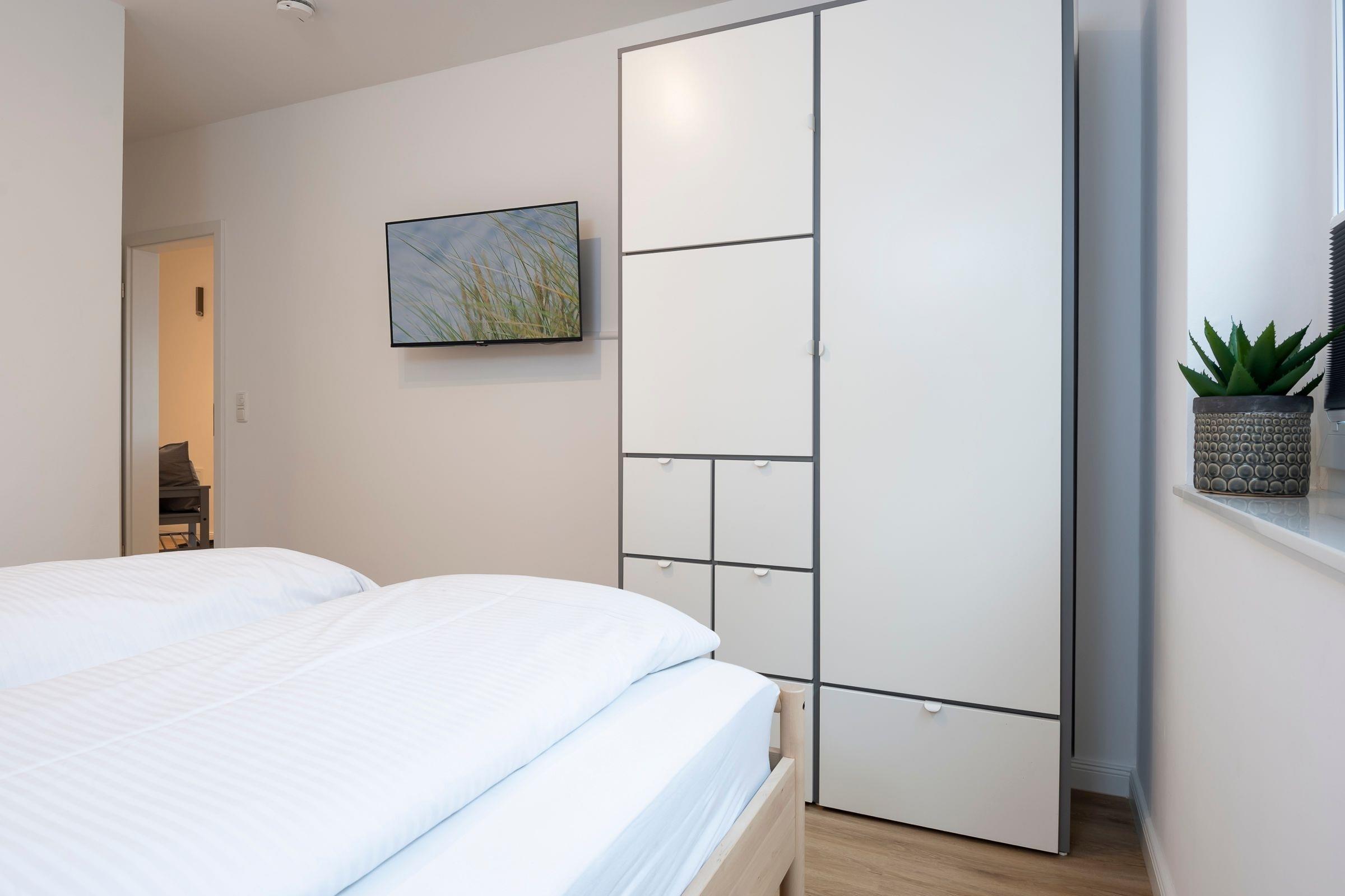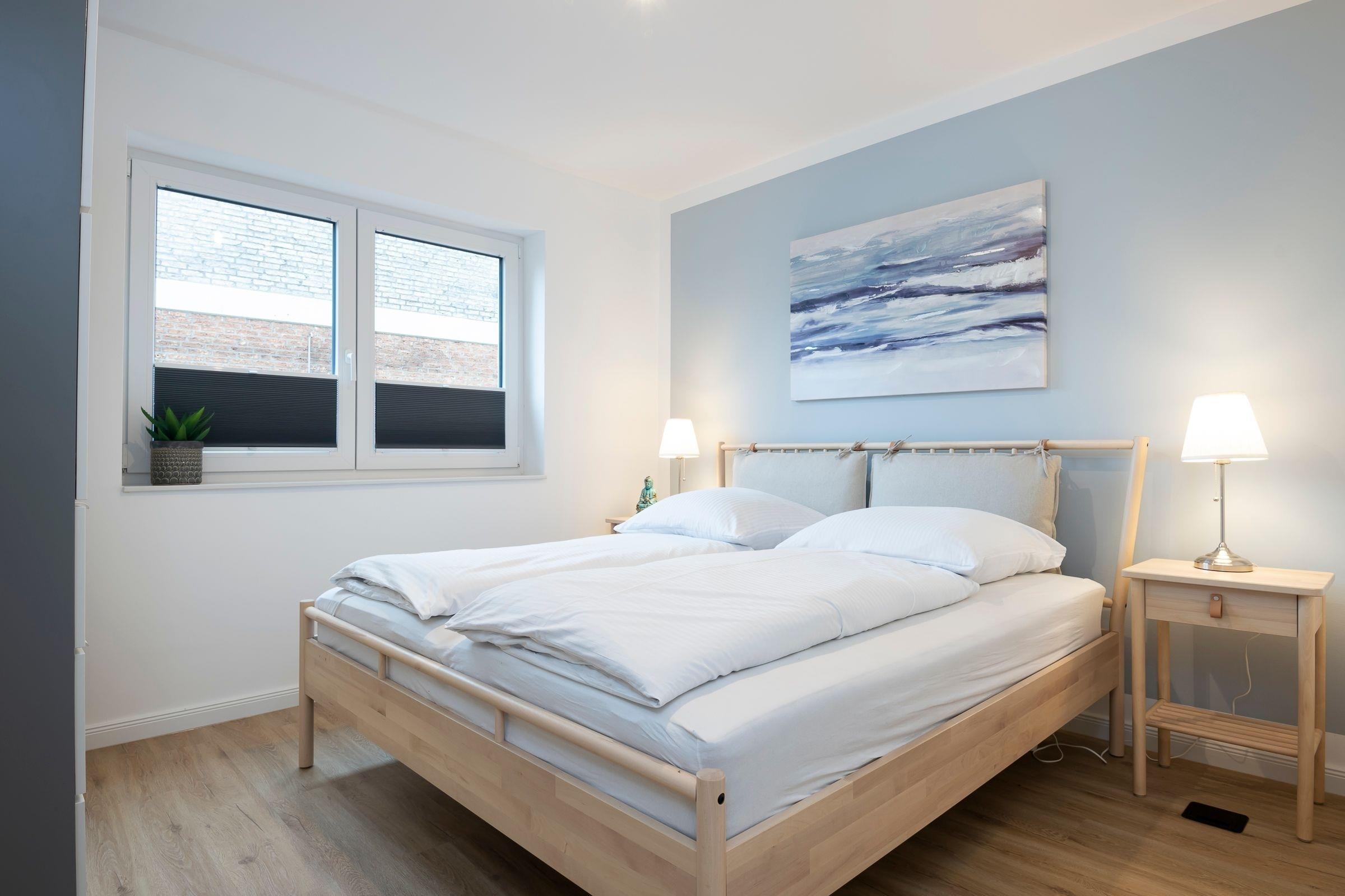 Schlafzimmer 1: 1 Doppelbett (2x 90x200 cm), Kleiderschrank, TV, Verdunkelungsplissees, Platz für Babybett