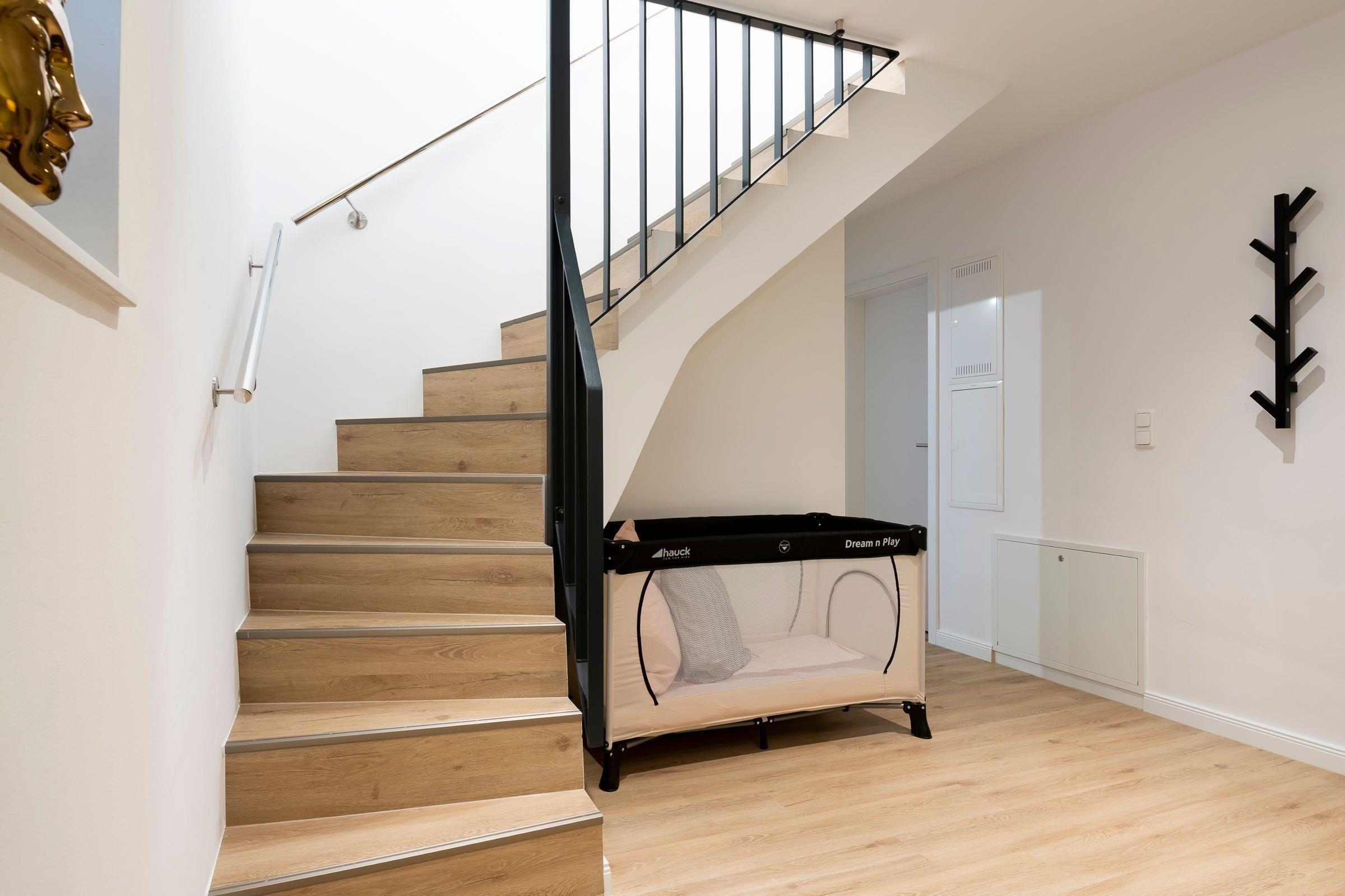 Ein PKW-Außenstellplatz (Maße: ca. 2,5 m x 5,2 m) ist für Sie reserviert. Eine Waschmaschine steht Ihnen zur Eigennutzung zur Verfügung. Ein Kinderhochstuhl, ein Kinderreisebett und ein Treppenschutzgitter gehören ebenfalls zur Grundausstattung.