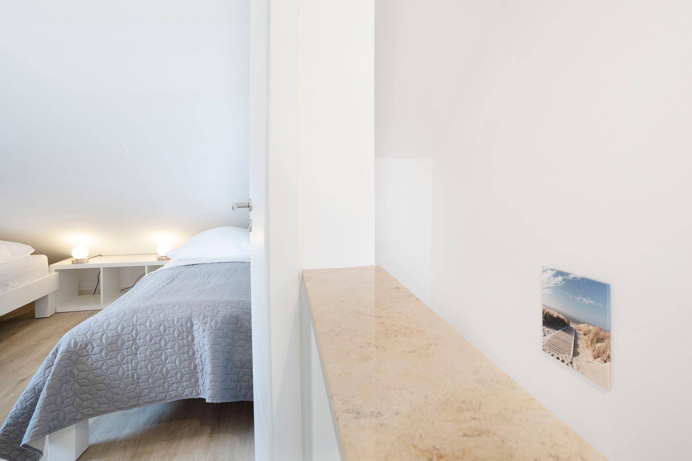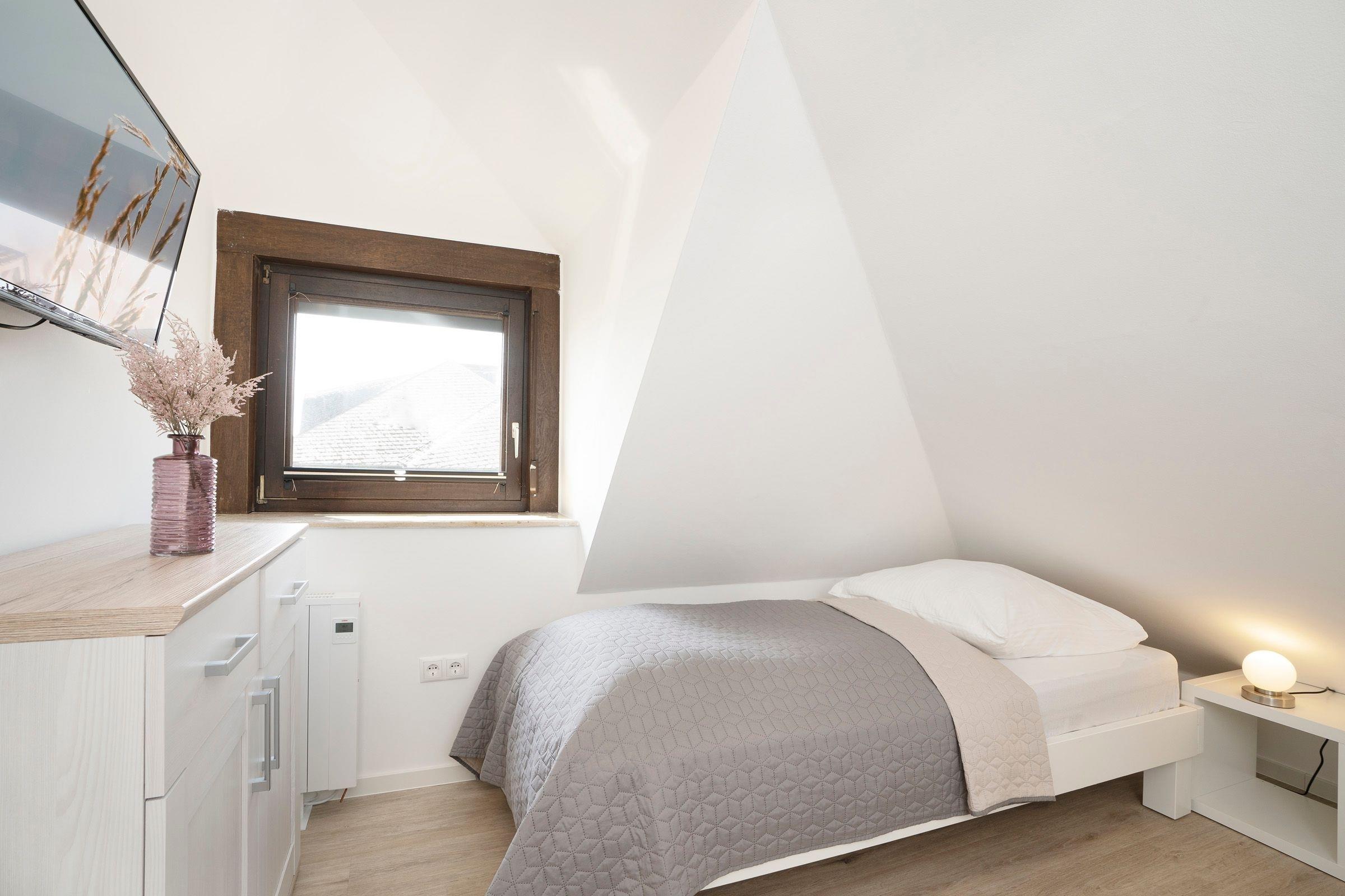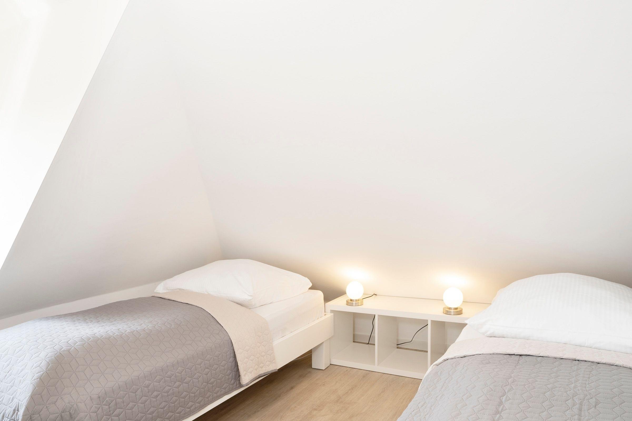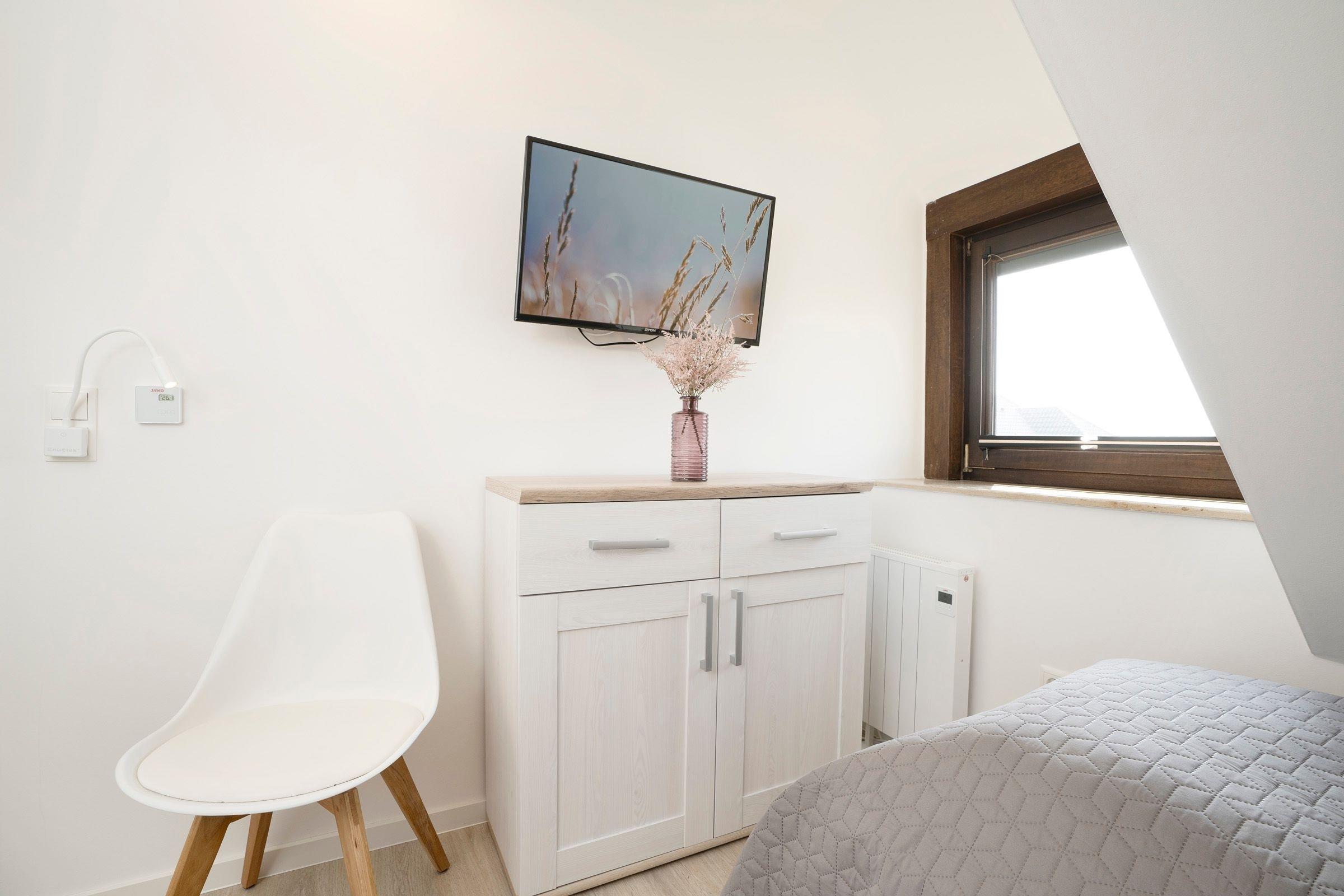 Schlafzimmer 2 (OG): 2 Einzelbetten (je 90x200cm) mit man. verstellbarem Lattenrost (Kopf- und Fußende), Kleiderschrank, TV, Verdunkelung (Außenjalousien)