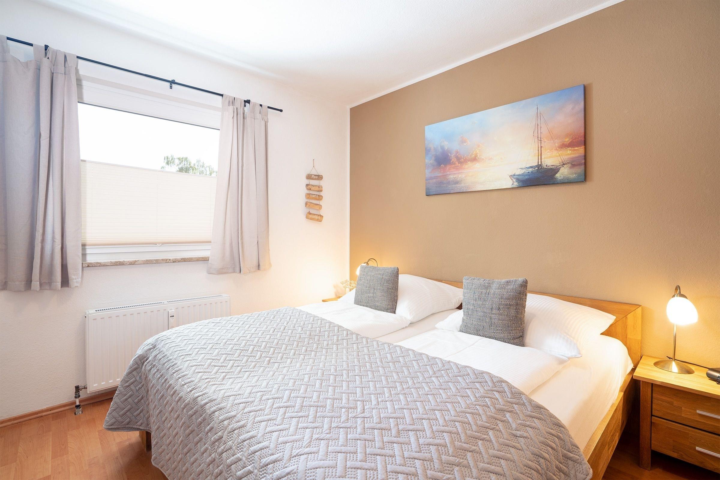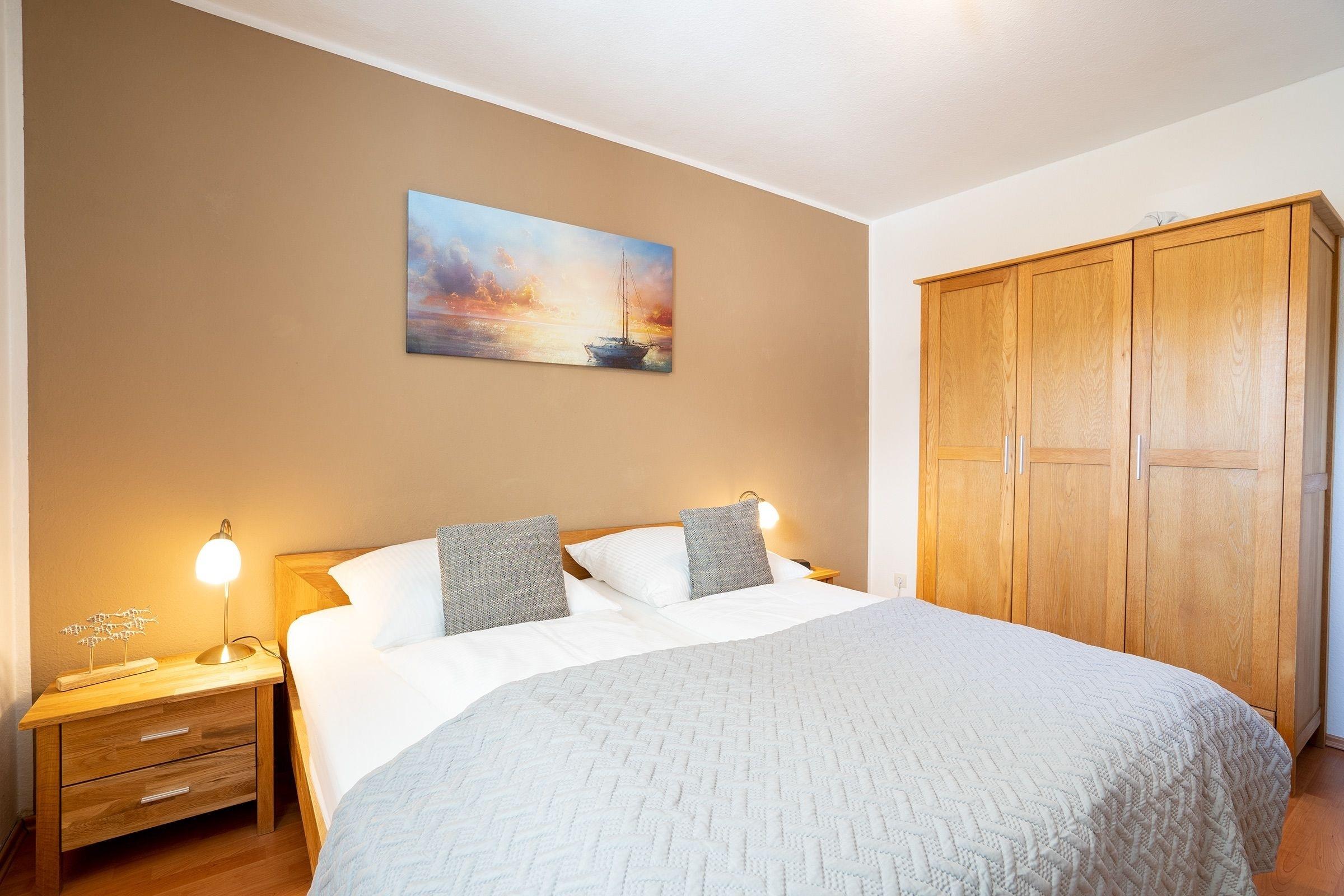 Schlafzimmer: 1 Doppelbett (2 x 90x200cm), Kleiderschrank, TV, Verdunkelung: Gardine & Plissee, Platz für Babybett vorhanden