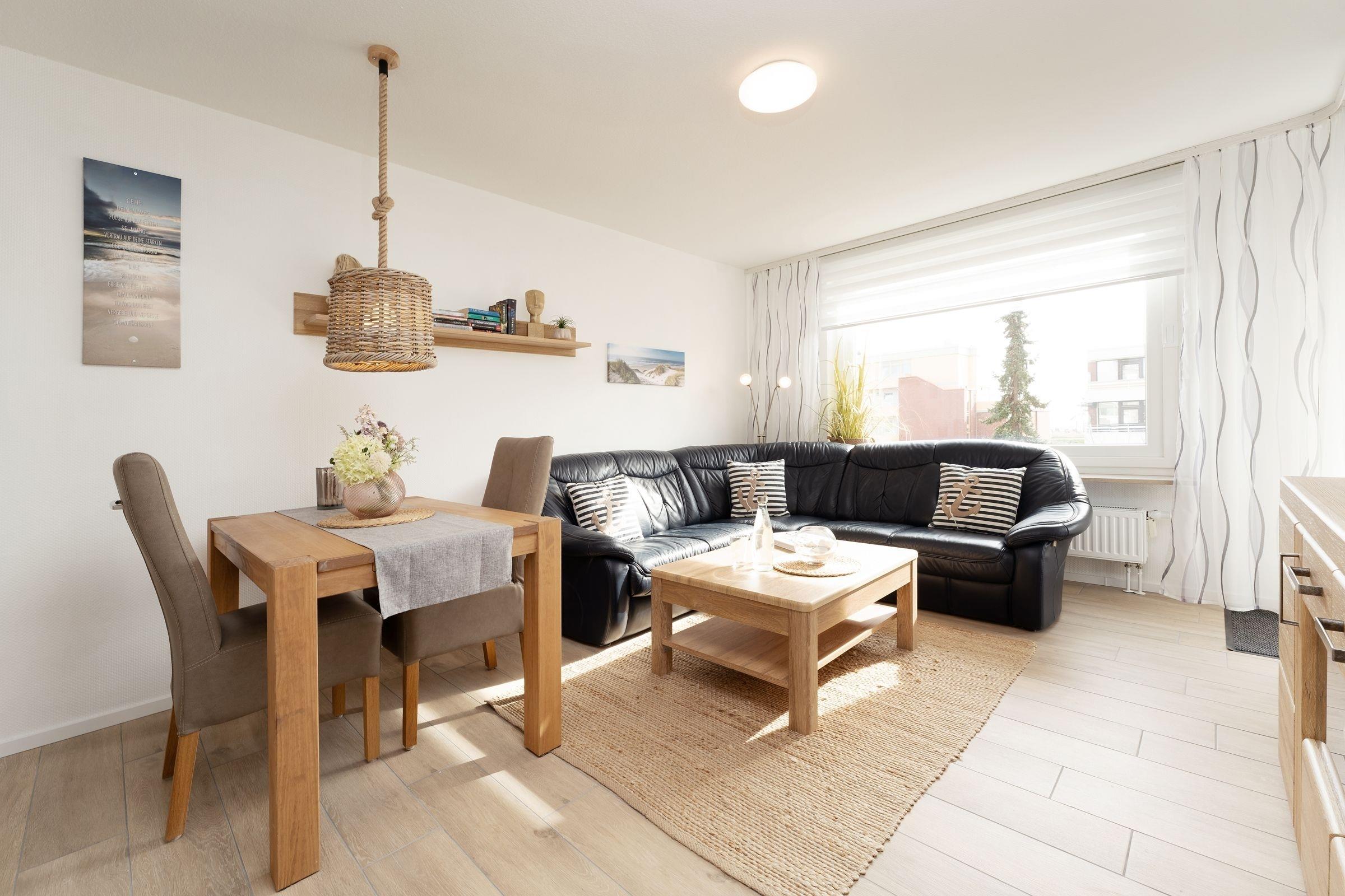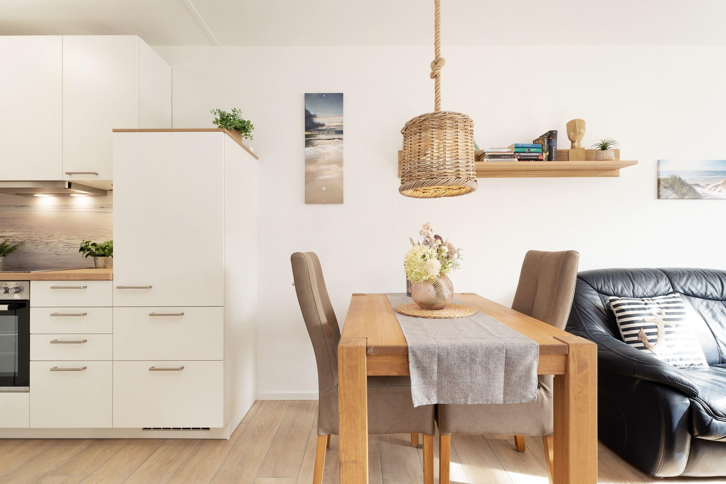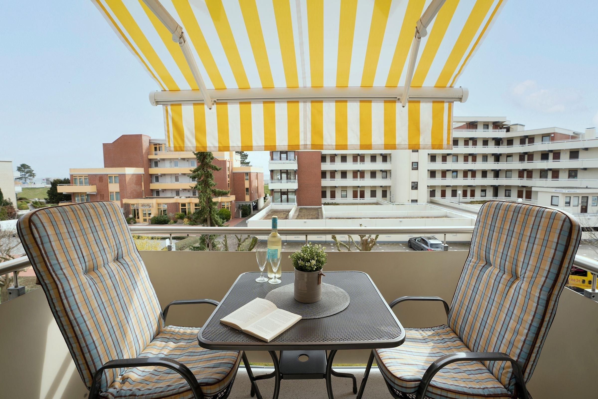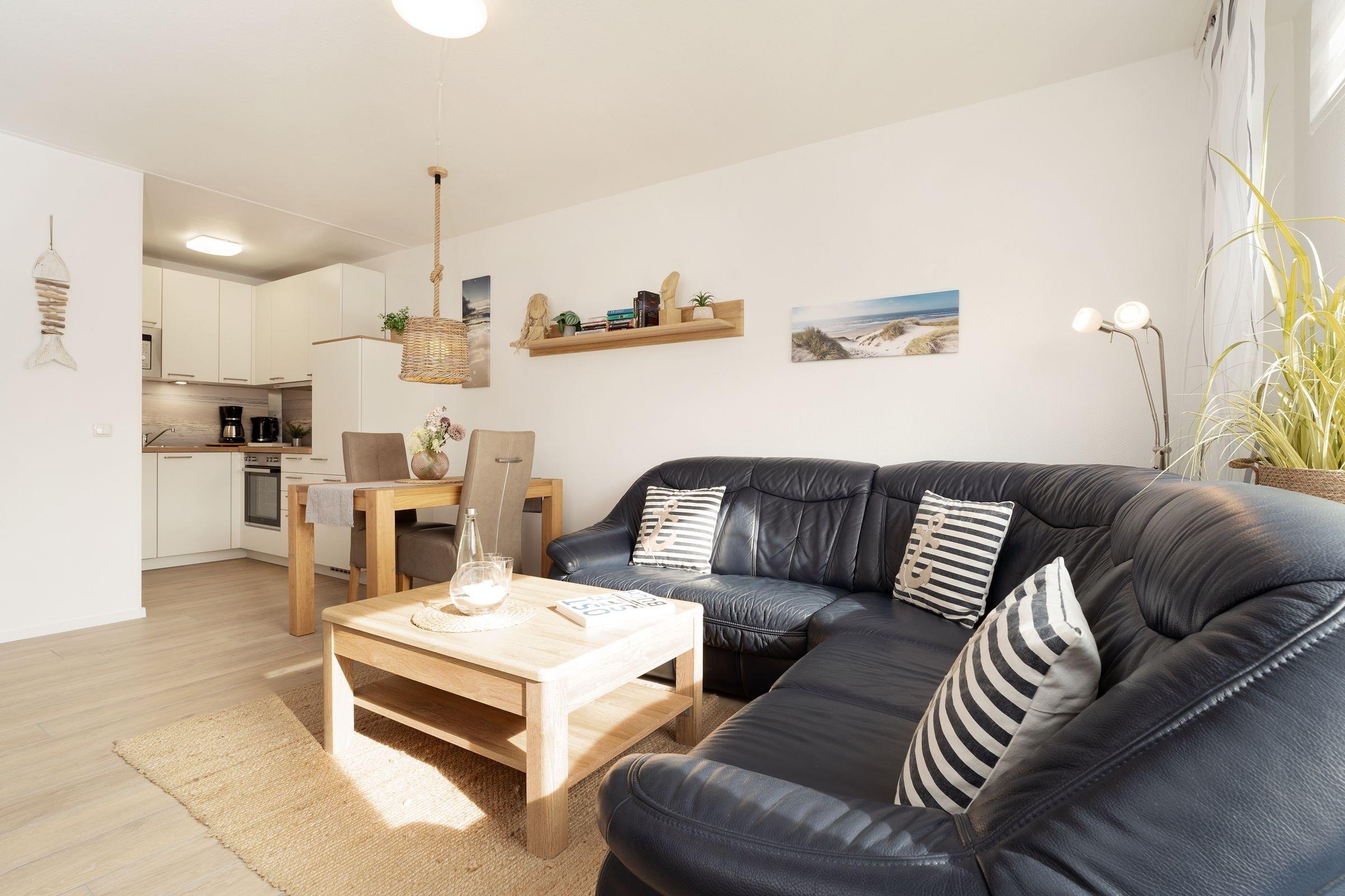 Mit dem Fahrstuhl gelangen Sie bequem in die 2. Etage und erreichen Ihr Urlaubsdomizil. Im Wohnbereich können Sie es sich auf der Couch oder dem Sessel vor dem Flachbildfernseher so richtig gemütlich machen. Von dem möblierten Südbalkon mit elektrischer Markise können Sie zwischen den Häusern sogar einen Blick auf die Ostsee erhaschen. Die moderne Küche ist mit vielen Annehmlichkeiten ausgestattet, hier können Sie Ihre Mahlzeiten zubereiten und am Esstisch gemeinsam einnehmen. Das separate Schlafzimmer ist mit einem komfortablen Doppelbett (2x 90x200 cm) sowie einem Kleiderschrank. Zur Nacht lässt sich das Fenster angenehm abdunkeln. Das innenliegende Badezimmer erwartet Sie mit einer Dusche, Föhn sowie einem beheizbaren Handtuchhalter.