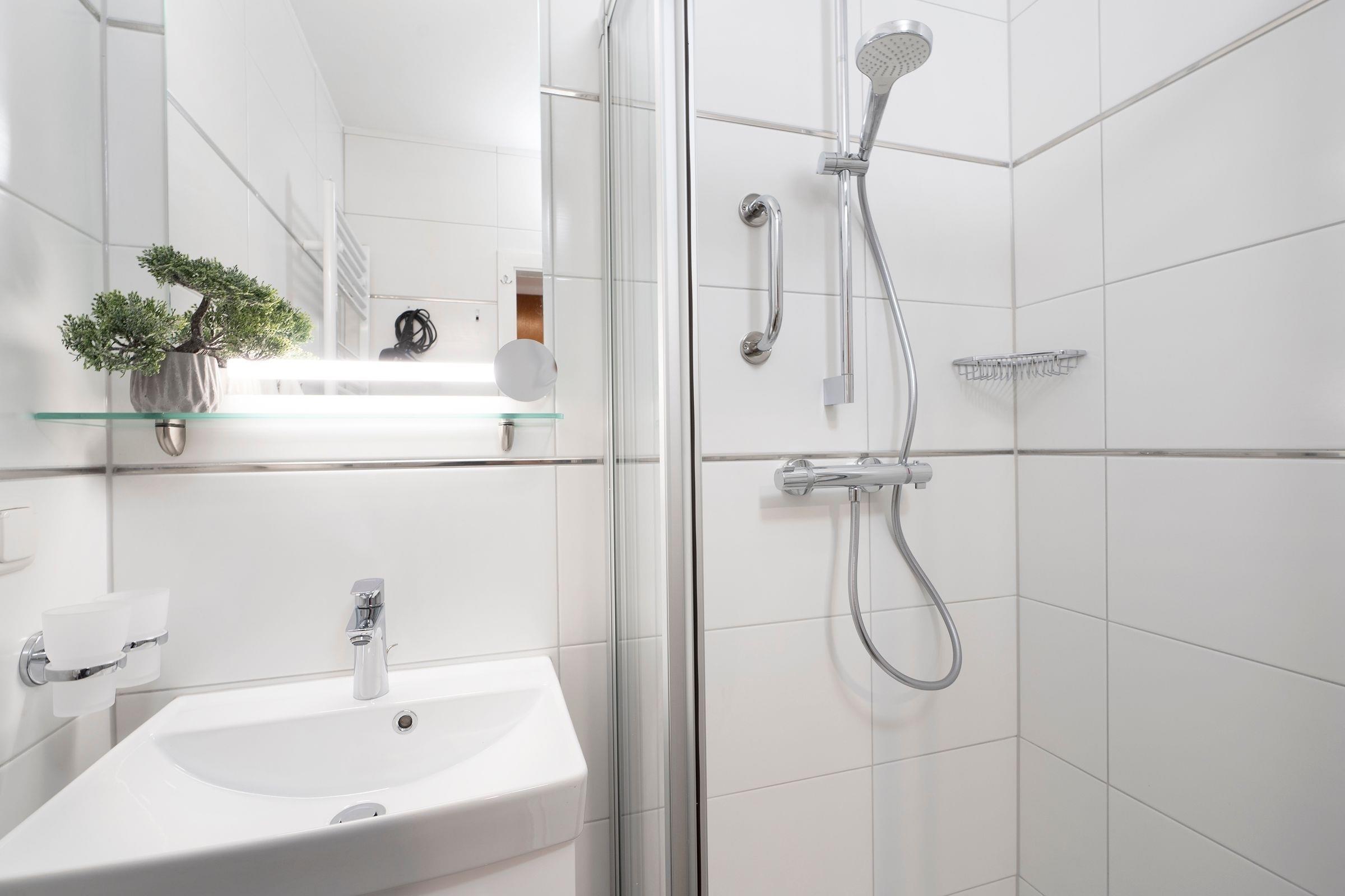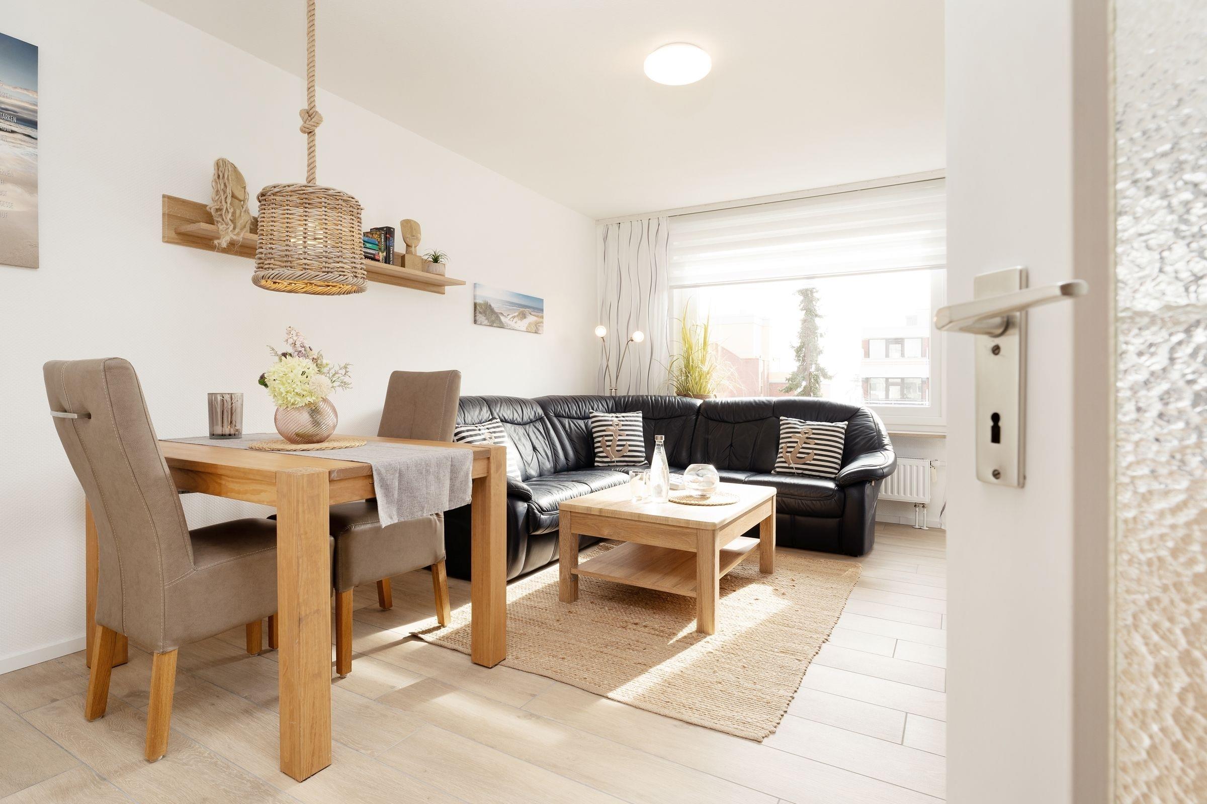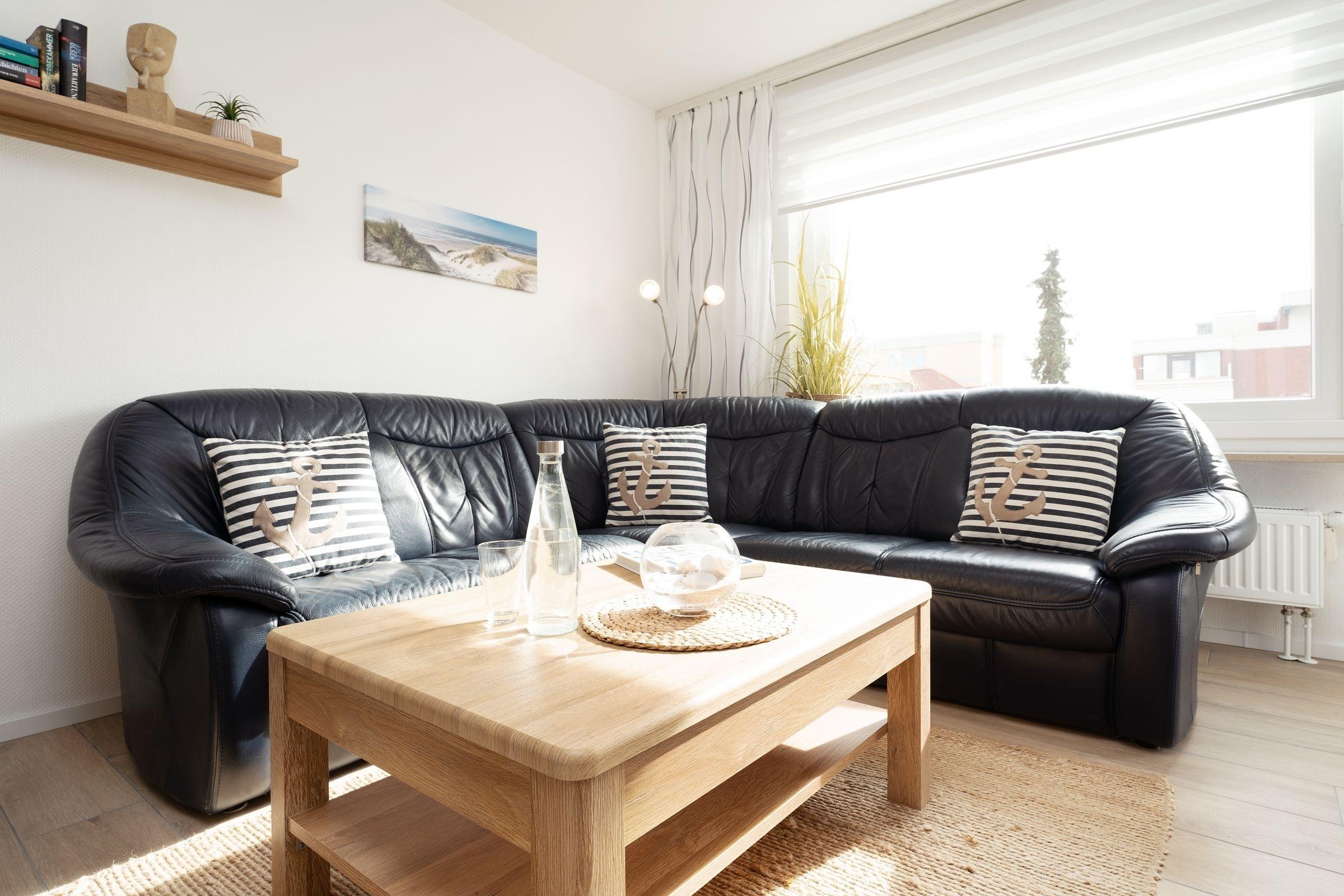 Mit dem Fahrstuhl gelangen Sie bequem in die 2. Etage und erreichen Ihr Urlaubsdomizil. Im Wohnbereich können Sie es sich auf der Couch oder dem Sessel vor dem Flachbildfernseher so richtig gemütlich machen. Von dem möblierten Südbalkon mit elektrischer Markise können Sie zwischen den Häusern sogar einen Blick auf die Ostsee erhaschen. Die moderne Küche ist mit vielen Annehmlichkeiten ausgestattet, hier können Sie Ihre Mahlzeiten zubereiten und am Esstisch gemeinsam einnehmen. Das separate Schlafzimmer ist mit einem komfortablen Doppelbett (2x 90x200 cm) sowie einem Kleiderschrank. Zur Nacht lässt sich das Fenster angenehm abdunkeln. Das innenliegende Badezimmer erwartet Sie mit einer Dusche, Föhn sowie einem beheizbaren Handtuchhalter.