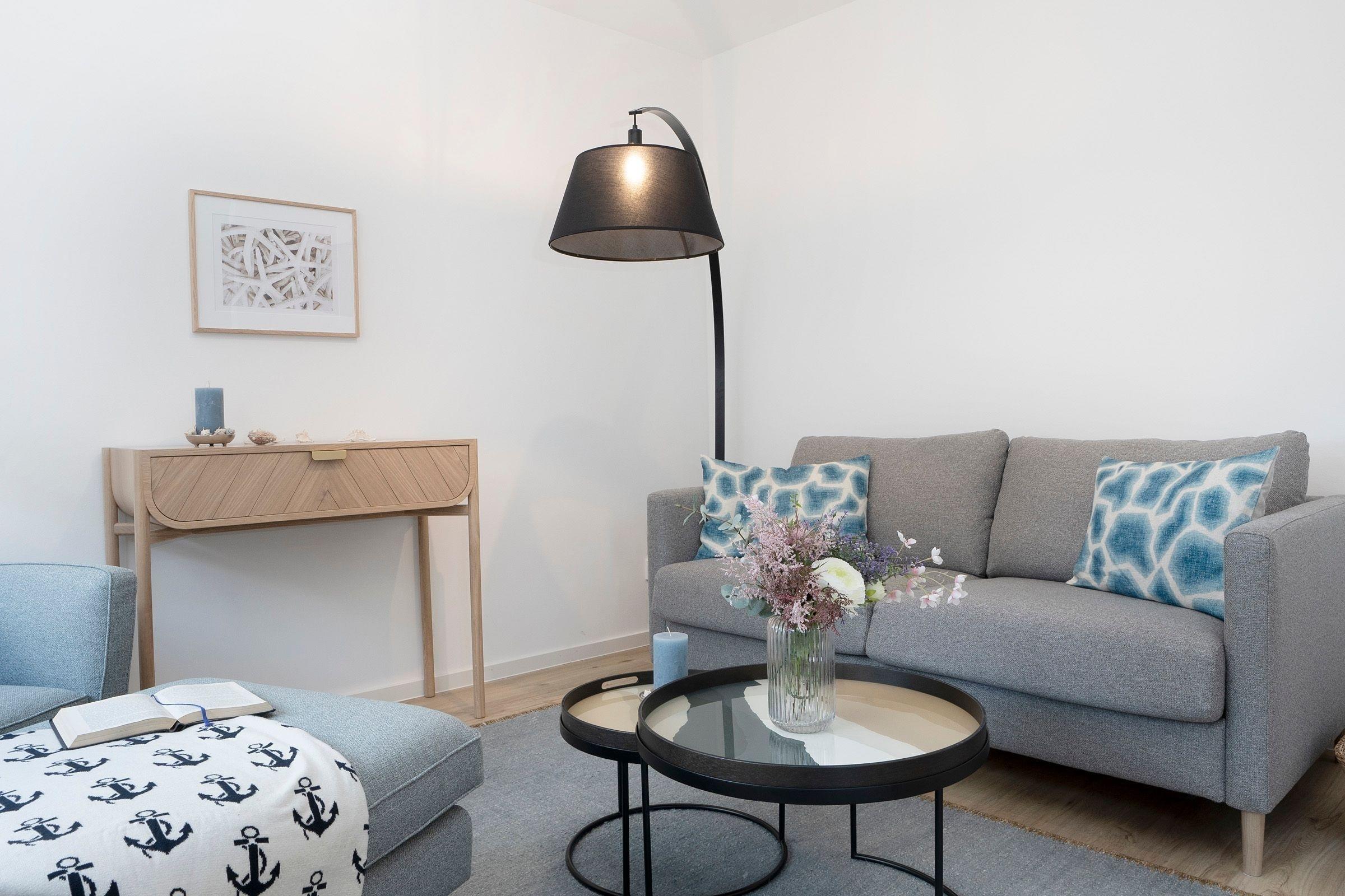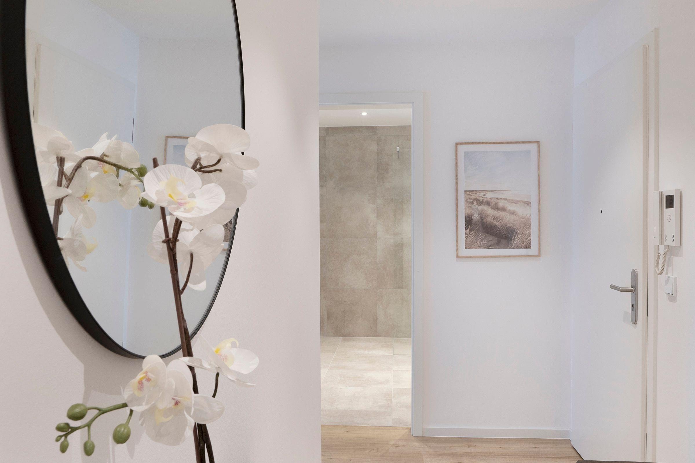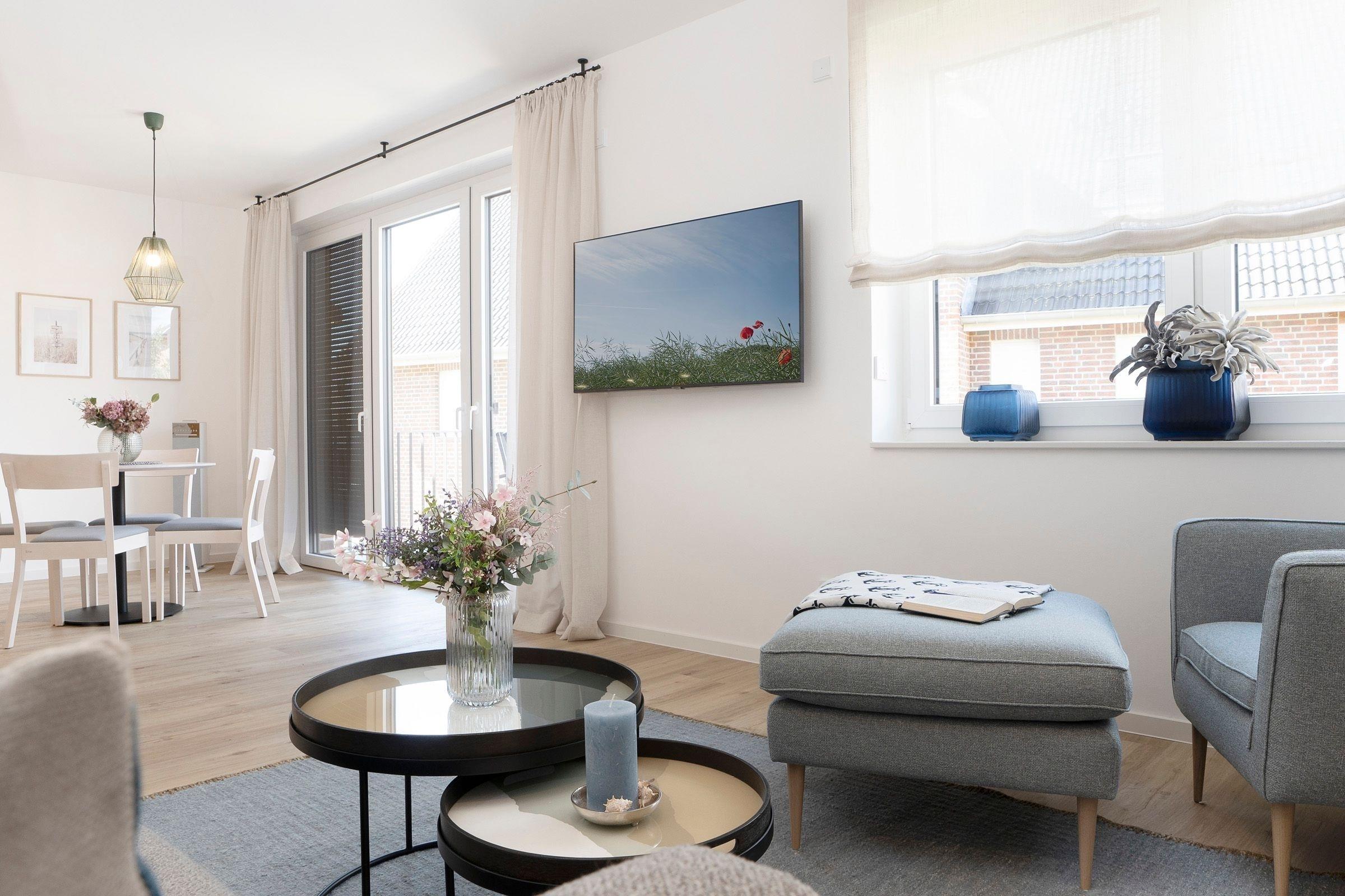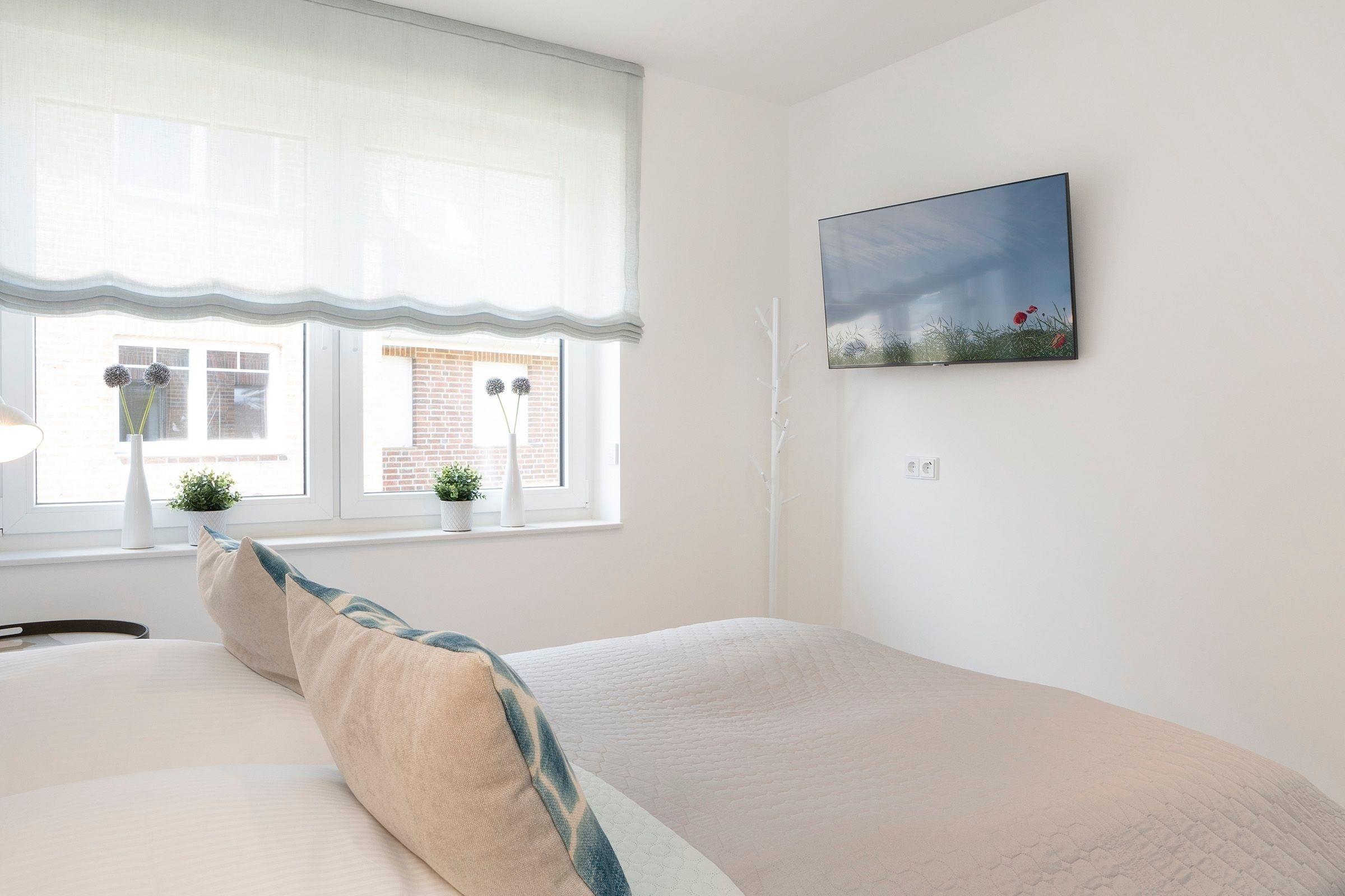 Das separate Schlafzimmer ist mit einem gemütlichen Boxspring-Doppelbett (180x200 cm) sowie einem Kleiderschrank ausgestattet. Das moderne Badezimmer erwartet Sie mit einer bodengleichen Dusche, Föhn sowie einem beheizbaren Handtuchhalter. Für Unterhaltung sorgen die Smart-TVs in Wohn- und Schlafzimmer, ein Bluetooth-Radio sowie der vorhandene WLAN-Anschluss. Eine Fußbodenheizung sorgt auch in der kalten Jahreszeit für angenehme Temperaturen. Die gesamte Wohnung lässt sich durch elektrische Außenjalousien angenehm abdunkeln.