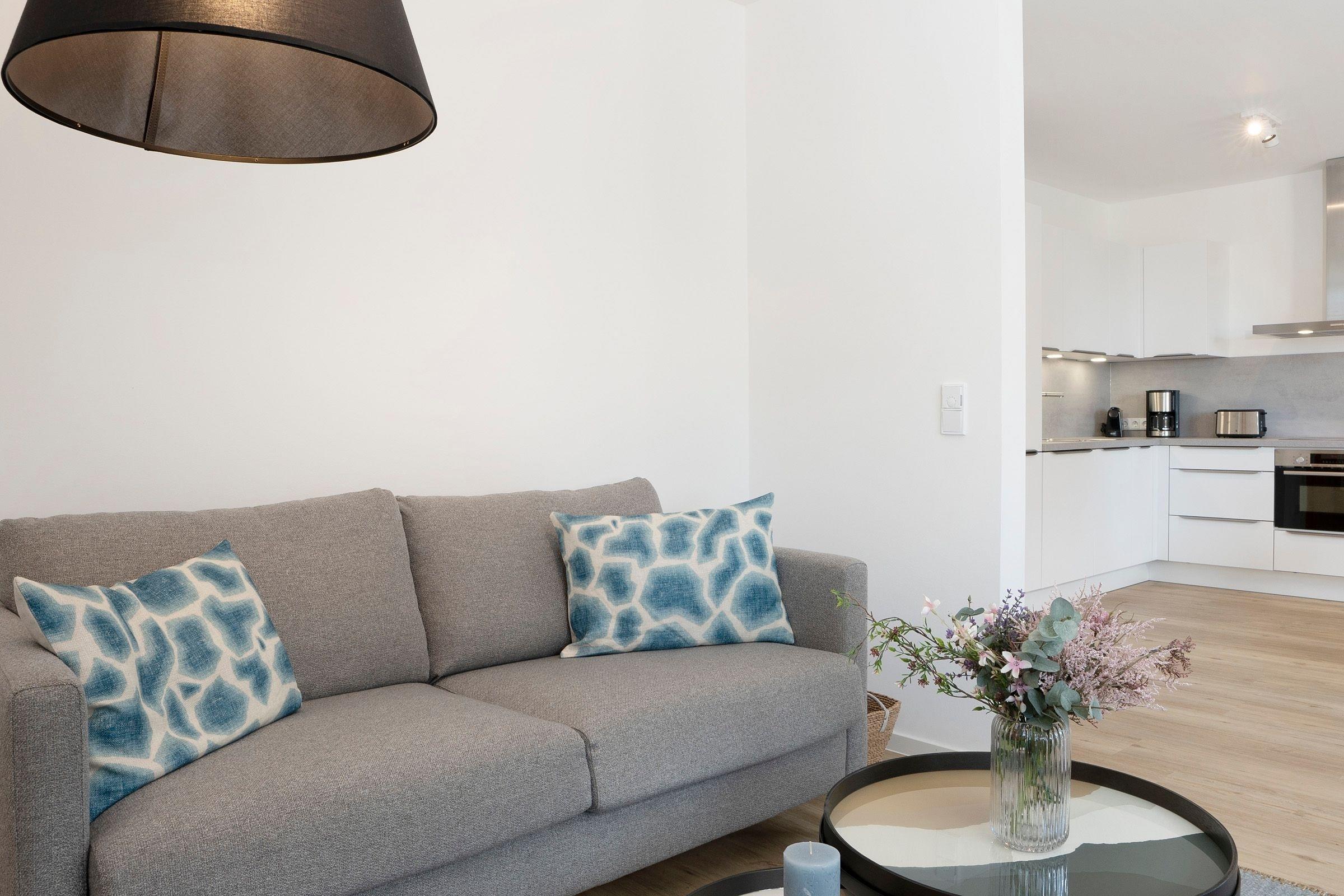 Mit dem Fahrstuhl erreichen Sie bequem Ihr Urlaubsdomizil in der 1. Etage. Vom Flur aus gelangen Sie in den hellen Wohn-/Essbereich mit gemütlicher Schlafcouch (140x200 cm) und Zugang auf den möblierten Südwest-Balkon mit elektrischer Markise. Die zum Wohnzimmer offen gestaltete Küche ist mit nahezu allen Annehmlichkeiten ausgestattet, am angrenzenden Esstisch können Sie Ihre Mahlzeiten gemeinsam einnehmen.