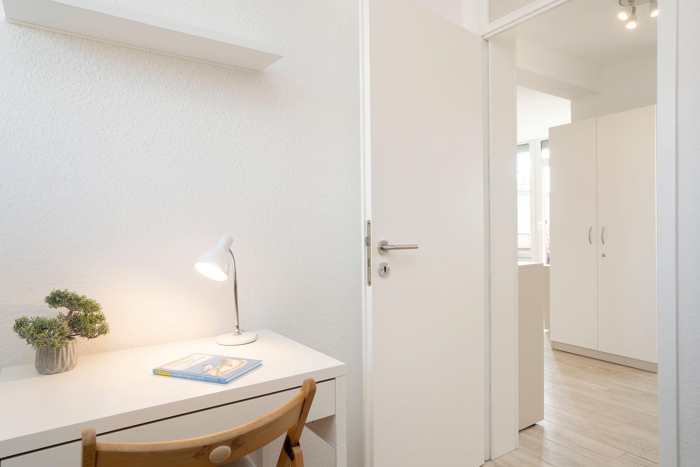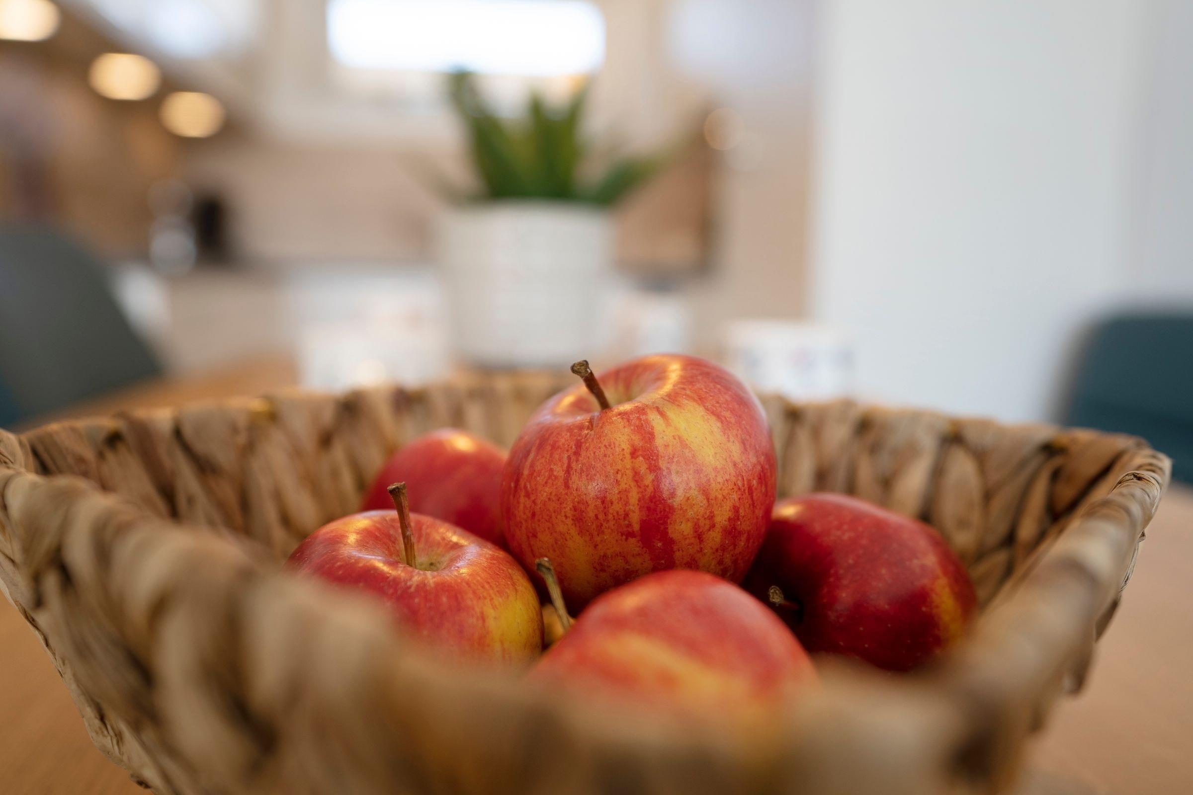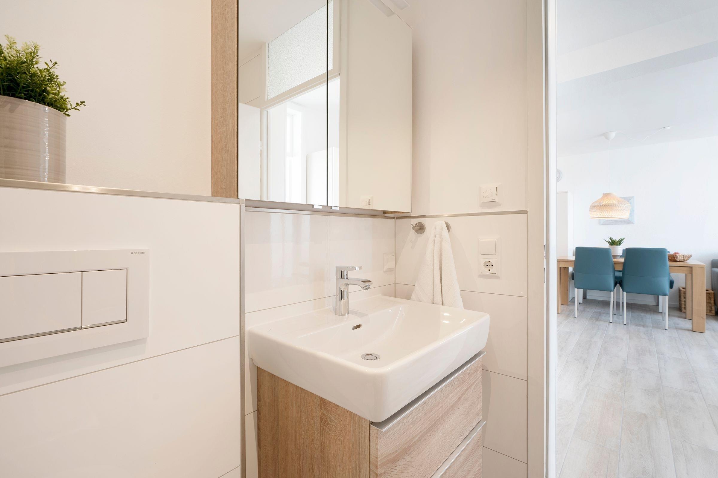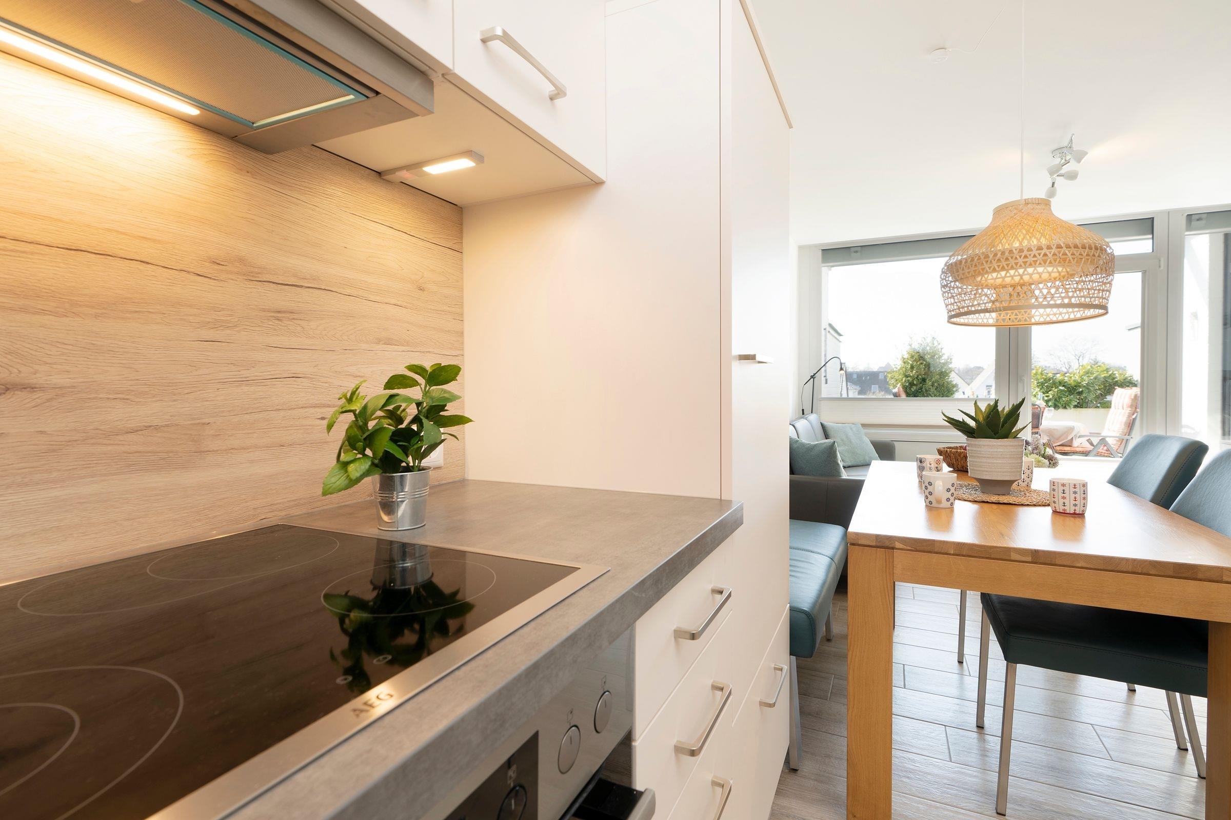Der stilvoll eingerichtete, lichtdurchflutete Wohnbereich bildet das Herzstück der Wohnung und umfasst neben der voll ausgestatteten Küche auch einen gemütlichen Essplatz, der nicht nur zum gemeinsamen Einnehmen der Mahlzeiten einlädt, sondern sich auch hervorragend für gesellige Spiele-Abende mit Familie oder Freunden eignet. Das gemütliche Sofa bietet viel Platz zum Erholen und Entspannen vor dem Fernseher und auf dem großzügigen, möblierten Balkon können Sie viel Zeit an der frischen Luft verbringen.