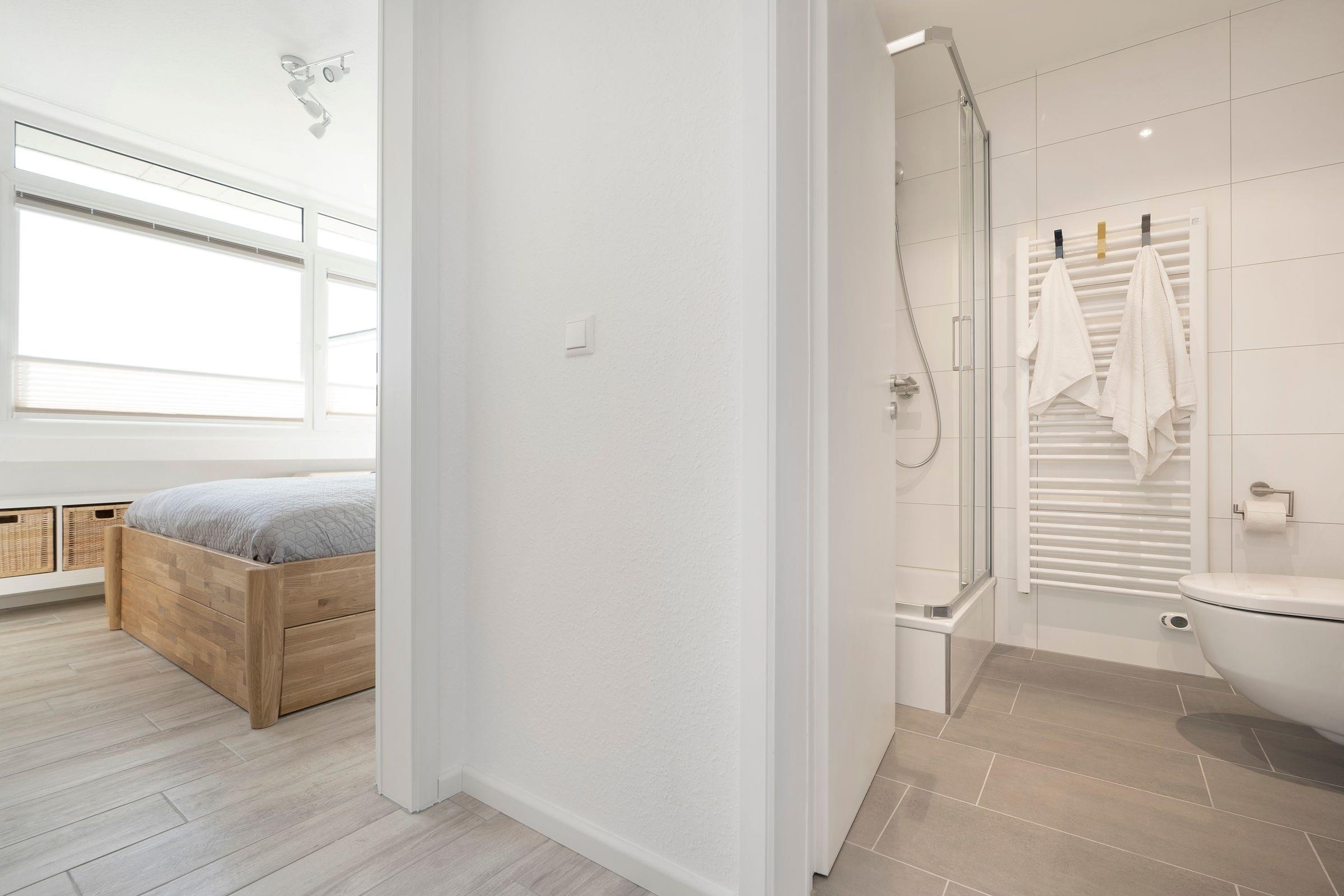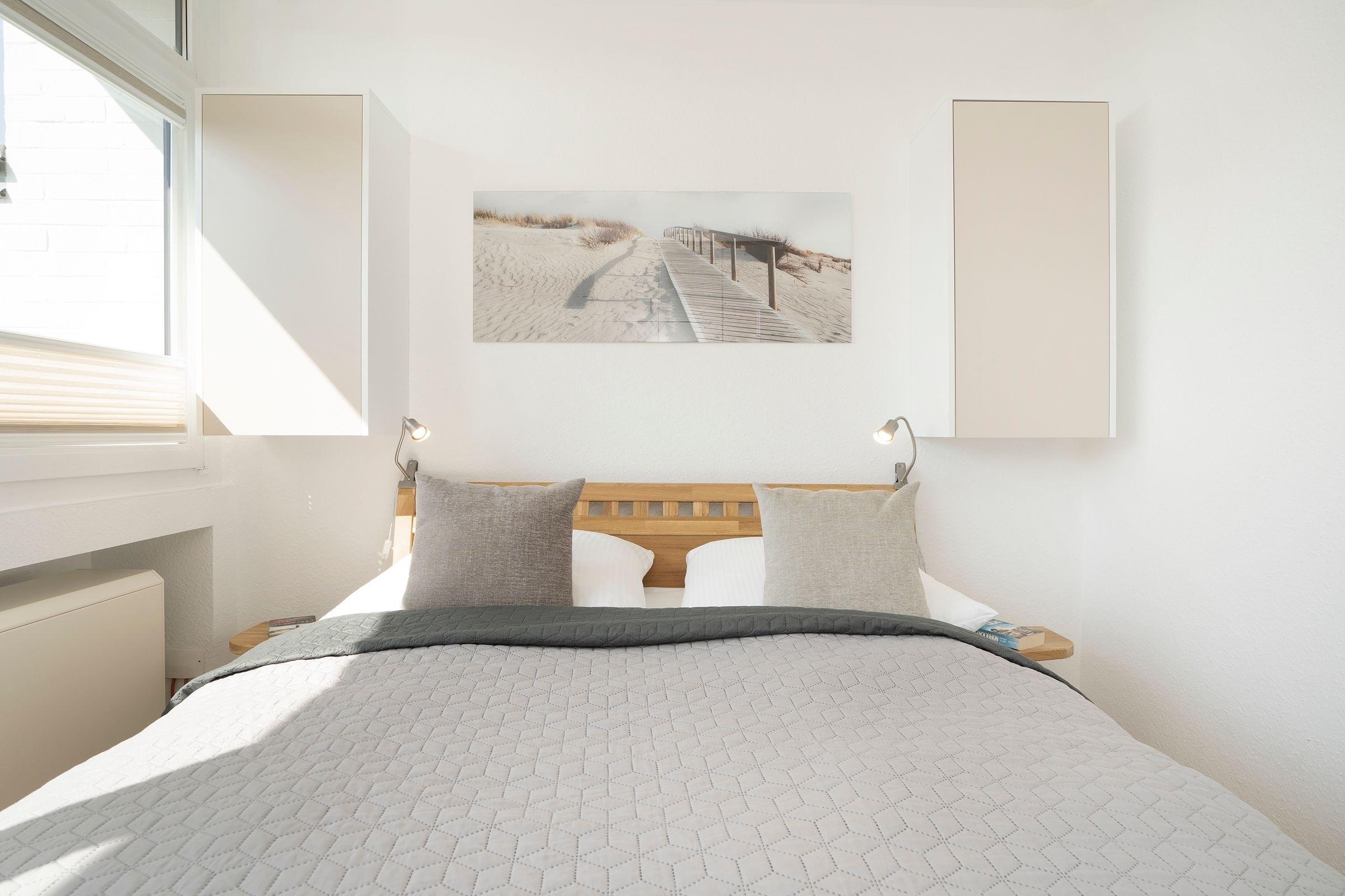 Im größeren der beiden Schlafzimmer befindet sich ein Doppelbett (2x 80x200cm) und ein Kleiderschrank, das Kinderzimmer ist mit einem praktischen Etagenbett (je 90x200 cm) ausgestattet. Das helle Bad empfängt Sie mit Waschtisch, Dusche sowie beheizbarem Handtuchhalter. In der kälteren Jahreszeit sorgt eine Fußbodenheizung (nicht im Schlafzimmer) für angenehme Temperaturen.