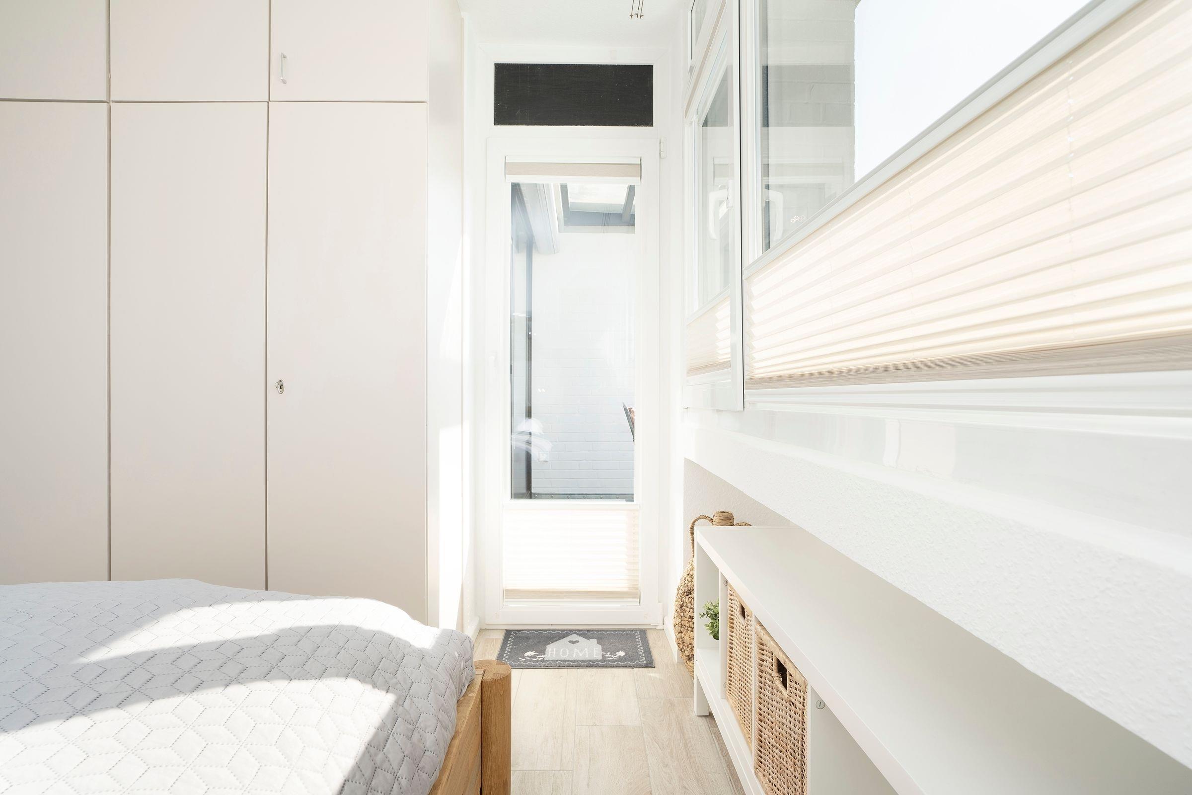 Schlafzimmer 1: 1 Doppelbett (2x 80x200 cm), Kleiderschrank, Verdunkelung: Plissee, Platz für Babybett vorhanden