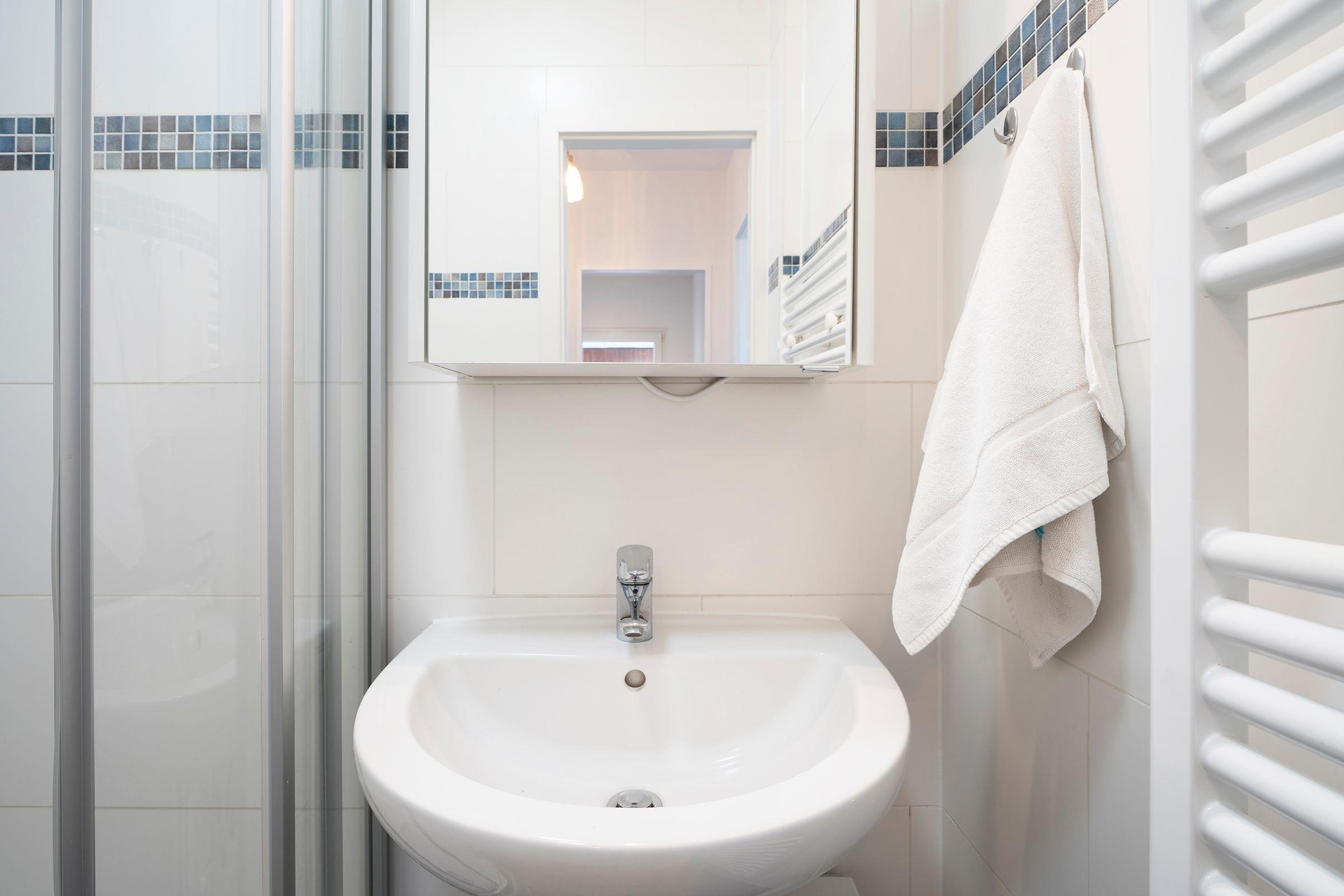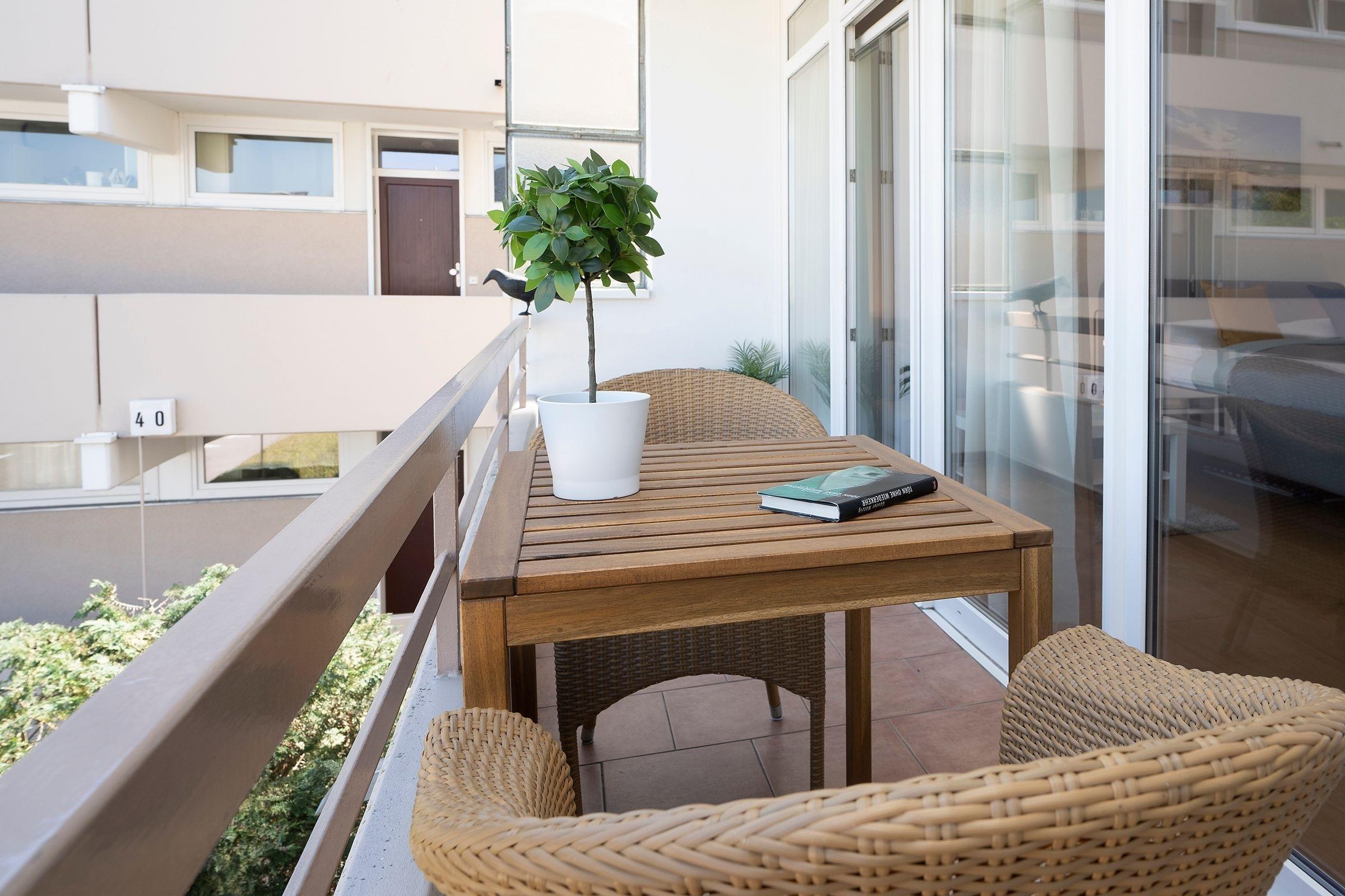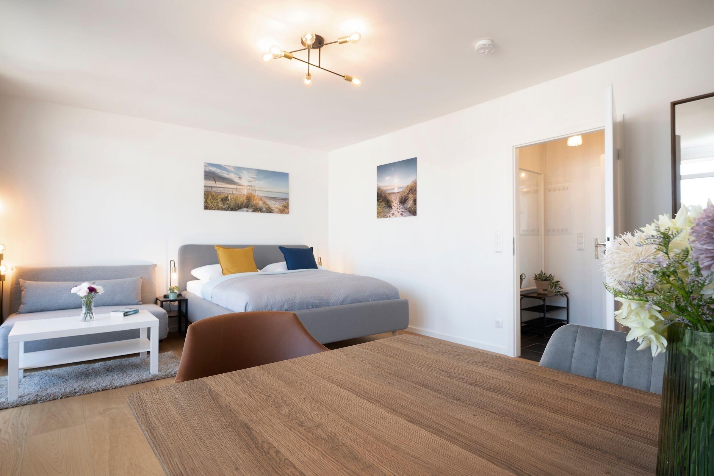 Im ersten Obergeschoss des Hauses Baltic empfängt Sie diese tolle Ferienwohnung mit einem kleinen Flur, der Sie direkt in das helle Wohn- und Schlafzimmer führt. Ein gemütliches Doppelbett (ca. 160x200cm) lädt zum Träumen und Entspannen nach einem langen Tag am Strand ein. Auf dem kleinen Sofa können Sie sich zusammenkuscheln und sich vom Fernsehprogramm berieseln lassen. Im Handumdrehen lässt es sich in einen komfortablen Schlafplatz (ca. 127x195cm) für eine dritte Person verwandeln. Der möblierte Balkon ist überdacht, so dass Sie auch an nicht ganz so schönen Tagen die frische Luft genießen können. Für den besonderen Komfort können Sie hier zwei Sonnenliegen genießen. Die moderne Einbauküche lädt mit ausreichend Arbeitsfläche und allen nötigen Utensilien zum Kochen ein. Das Appartement verfügt außerdem über ein modernes Bad mit Dusche.