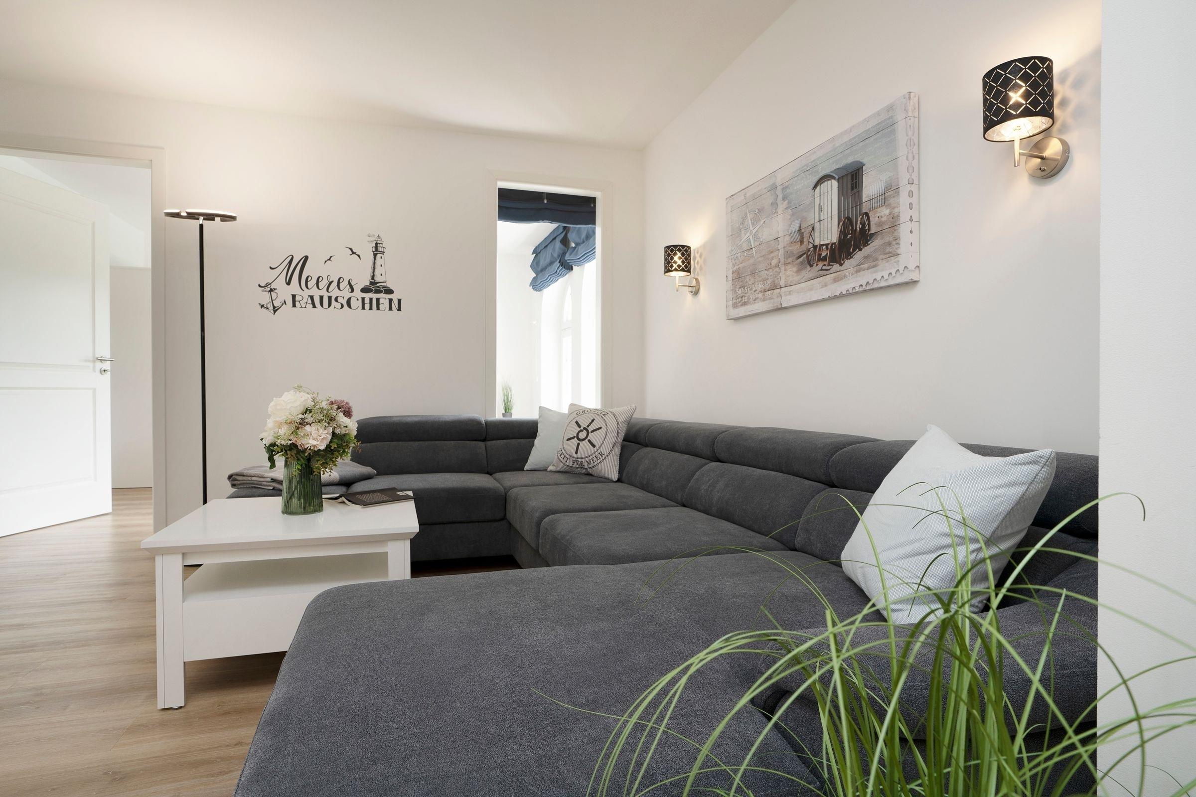 Die Ferienwohnung Meeresrauschen im Haus Schönes Leben empfängt Sie mit einem modern eingerichteten hellen Wohnbereich. In den Wohnbereich integriert ist die offene Küchenzeile, die mit ihrer sehr guten Ausstattung, inklusive Nespresso-Kaffeemaschine, keine Wünsche offen lässt. Lassen Sie sich nach einem guten Abendessen auf die gemütliche Couch fallen, lauschen Sie der wohnungseigenen WLAN-Sonos-Musikbox oder genießen Sie einen Blockbuster auf dem mit dem Streaming-Dienst Netflix ausgestatteten TV. Ihr Feriendomizil kann mit zwei voll abdunkelbaren Schlafzimmern trumpfen, die jeweils über ein eigenes Bad en suite verfügen. Ein bequemes Boxspringbett (2x 180x200cm) im ersten Schlafzimmer sowie zwei Einzelbetten (90x200cm) im zweiten Schlafzimmer sorgen für einen geruhsamen Schlaf. Die Lieblingsserie kann dabei auch vom Bett aus genossen werden, denn beide Schlafzimmer bestechen mit einem eigenen TV. Eines der beiden Dusch-Bäder bietet mit einem unterfahrbaren Waschbecken, einem WC-Haltegriff sowie einem Duschhocker barrierearme Bedingungen. Kalte Füße vermeiden Sie mit der Fußbodenheizung, die in der gesamten Wohnung verlegt ist. Die Highlight Ihres Feriendomizils sind die 58 m² große, nach Südwesten ausgerichtete Terrasse, auf der Sie die letzten Sonnenstrahlen des Tages genießen können sowie die gemeinschaftlich nutzbare Gartensauna.
