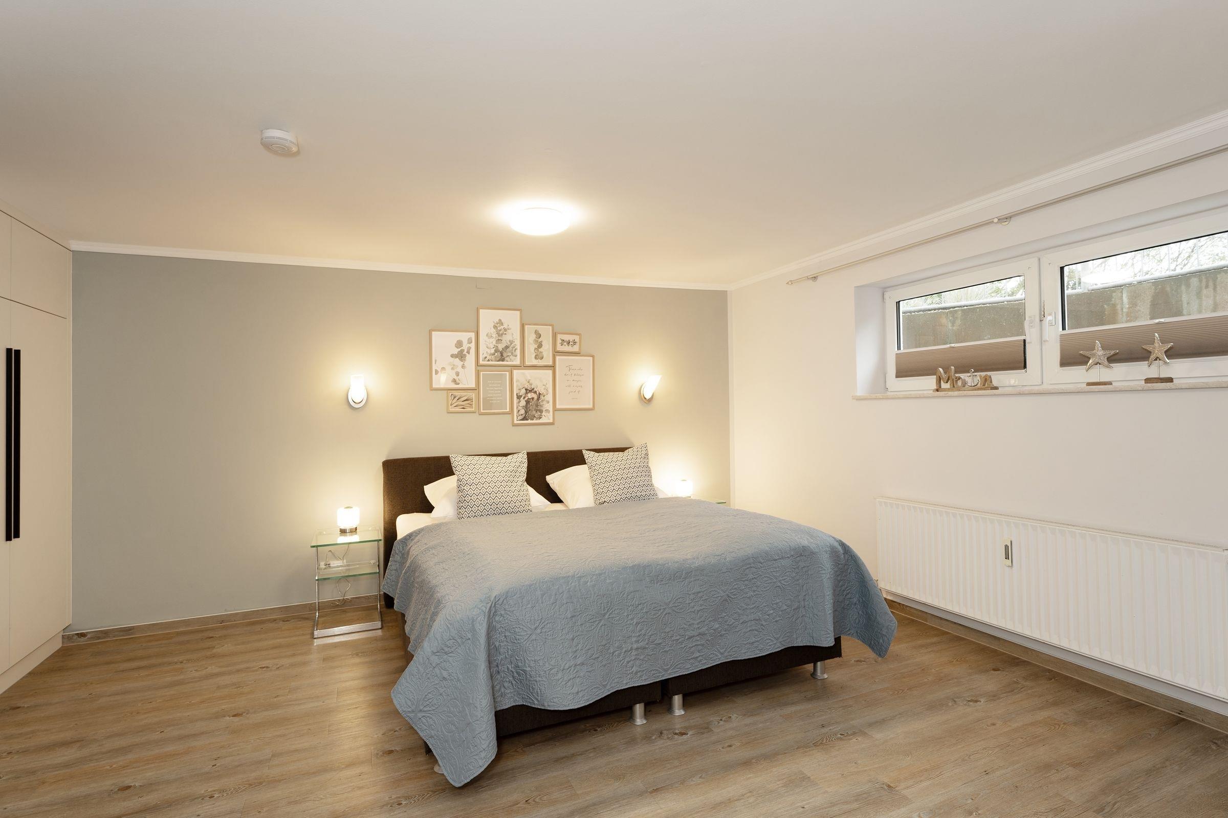 Schlafzimmer 3 (Souterr.): 1 Boxspringbett (160x200 cm), Verdunklungsplissees