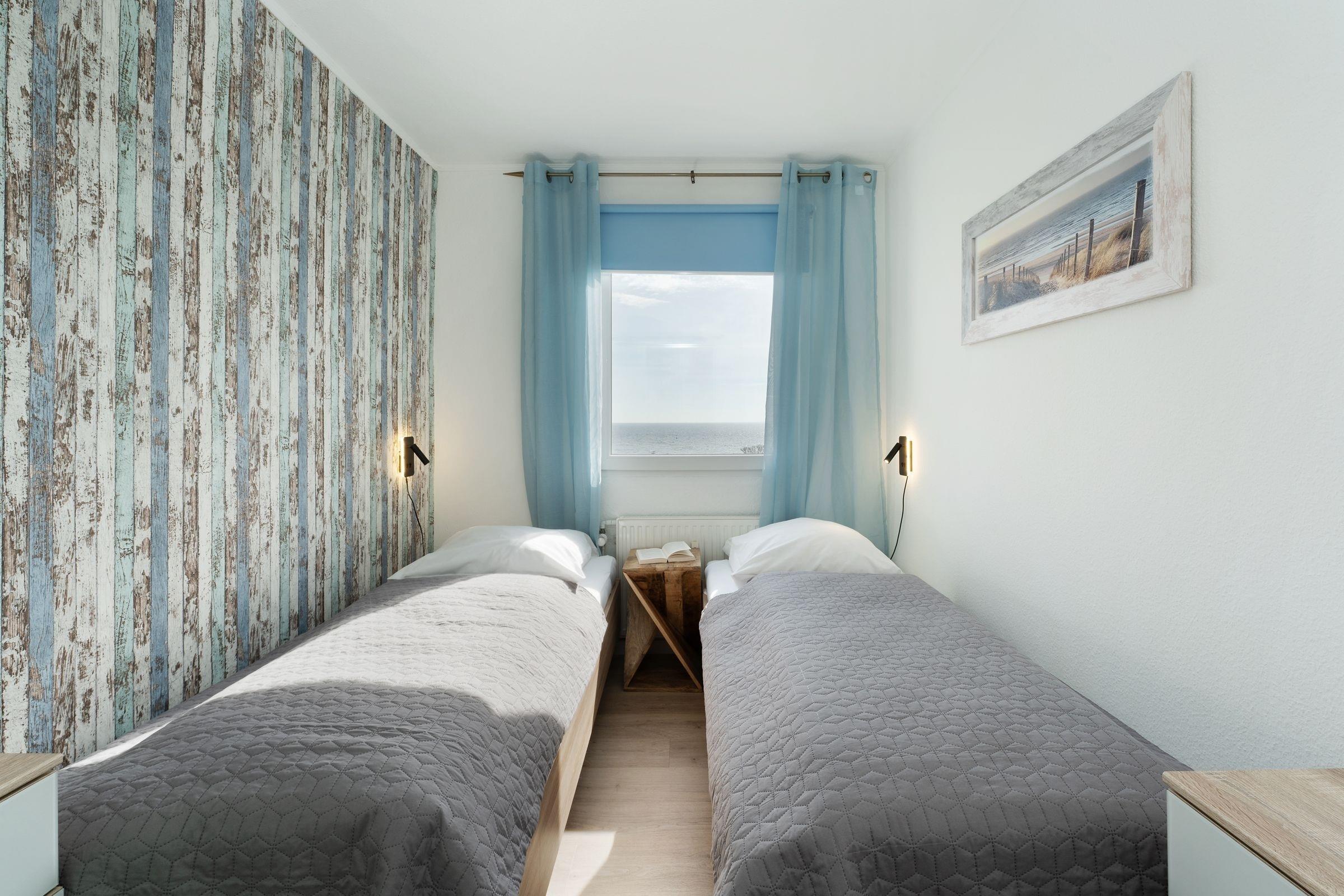 Schlafzimmer: 2 Einzelbetten (je 90x200 cm), Verdunklungsmöglichkeit: Jalousette-Rollos, kein Platz für Babybett vorhanden