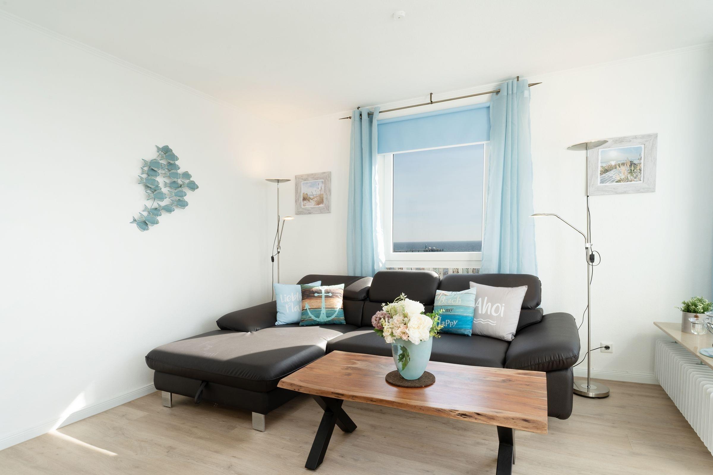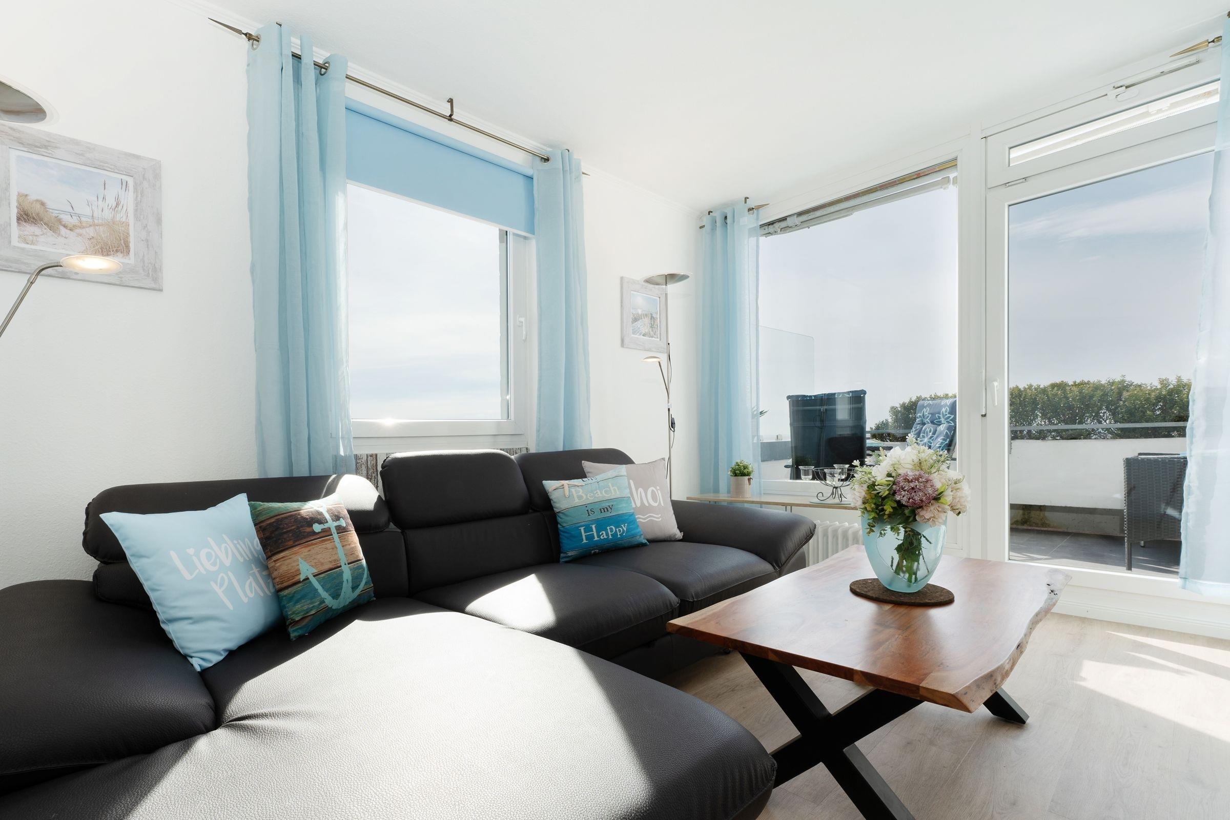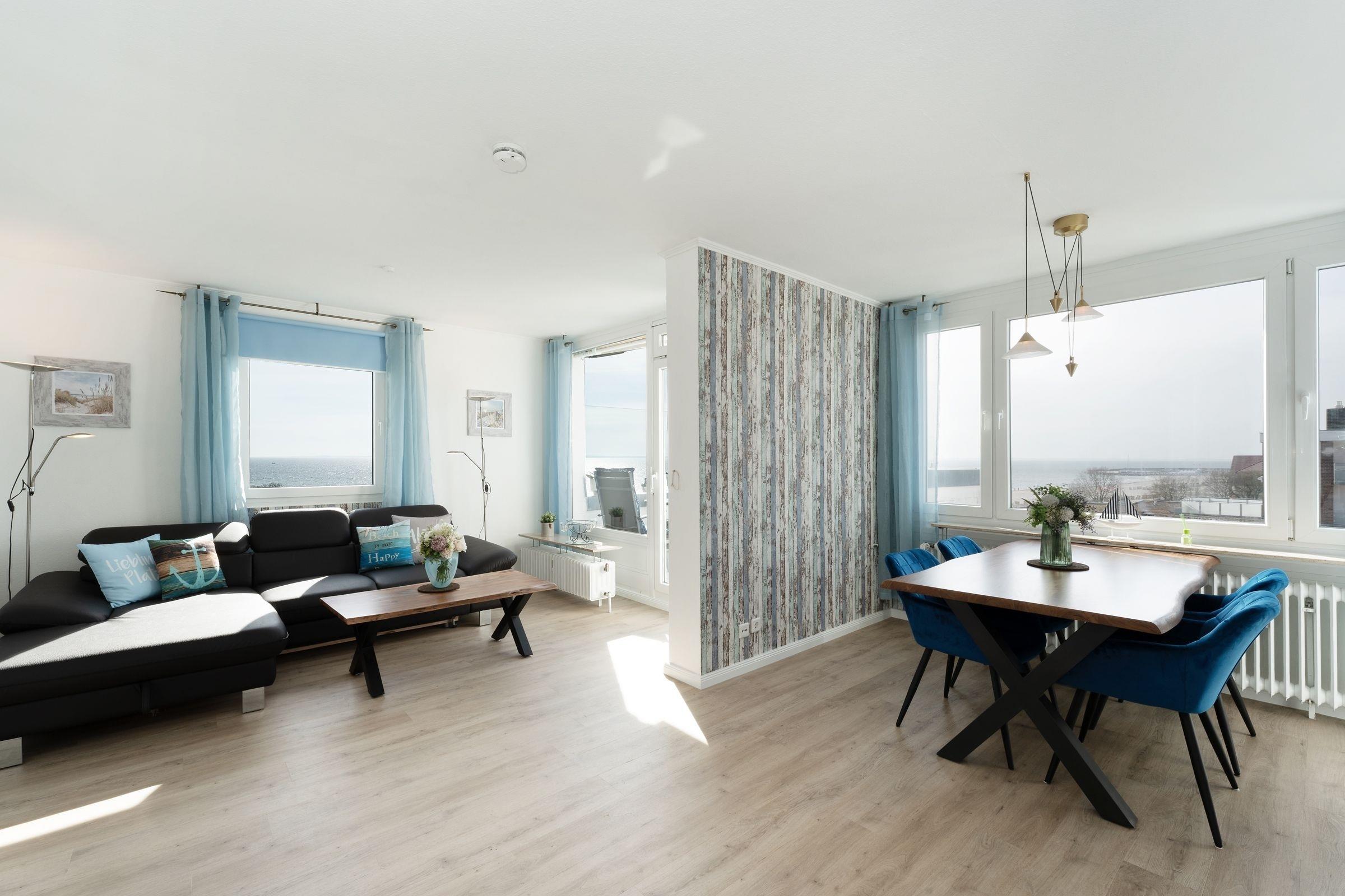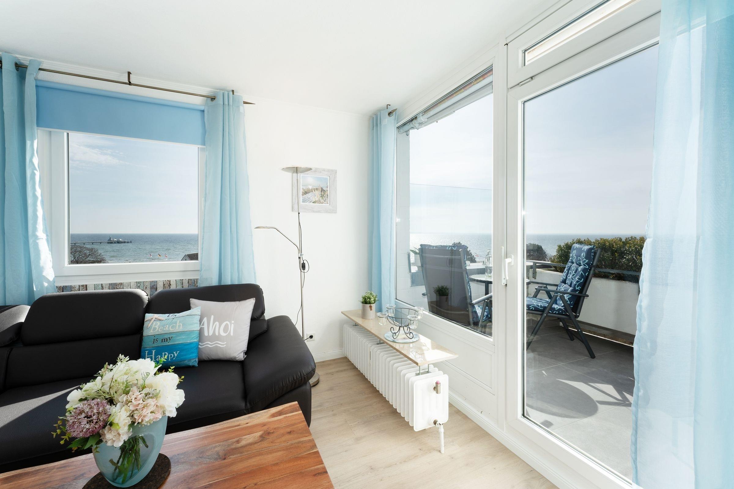 Ostsee pur. Das lichtdurchflutete Feriendomizil verwöhnt Sie mit einem herrlichen Meerblick aus allen Zimmern. Kommen Sie an, machen Sie es sich auf dem Sofa bequem und lassen Sie den Blick über die tiefblaue Ostsee schweifen. Ihre Speisen können Sie im angrenzenden Essbereich einnehmen, die separate Küche im Landhausstil ist sehr gut ausgestattet. Nach dem Essen lässt sich der Weitblick auf die Lübecker Bucht ideal auf dem großzügigen Ost-West-Balkon genießen. Das Schlafzimmer verfügt über 2 Einzelbetten (je 90x200 cm), zudem bietet das Schlafsofa im Wohnzimmer eine weitere Schlafmöglichkeit (ca. 134x197 cm). Das Duschbad mit Handtuchwärmer ist hell gefliest.