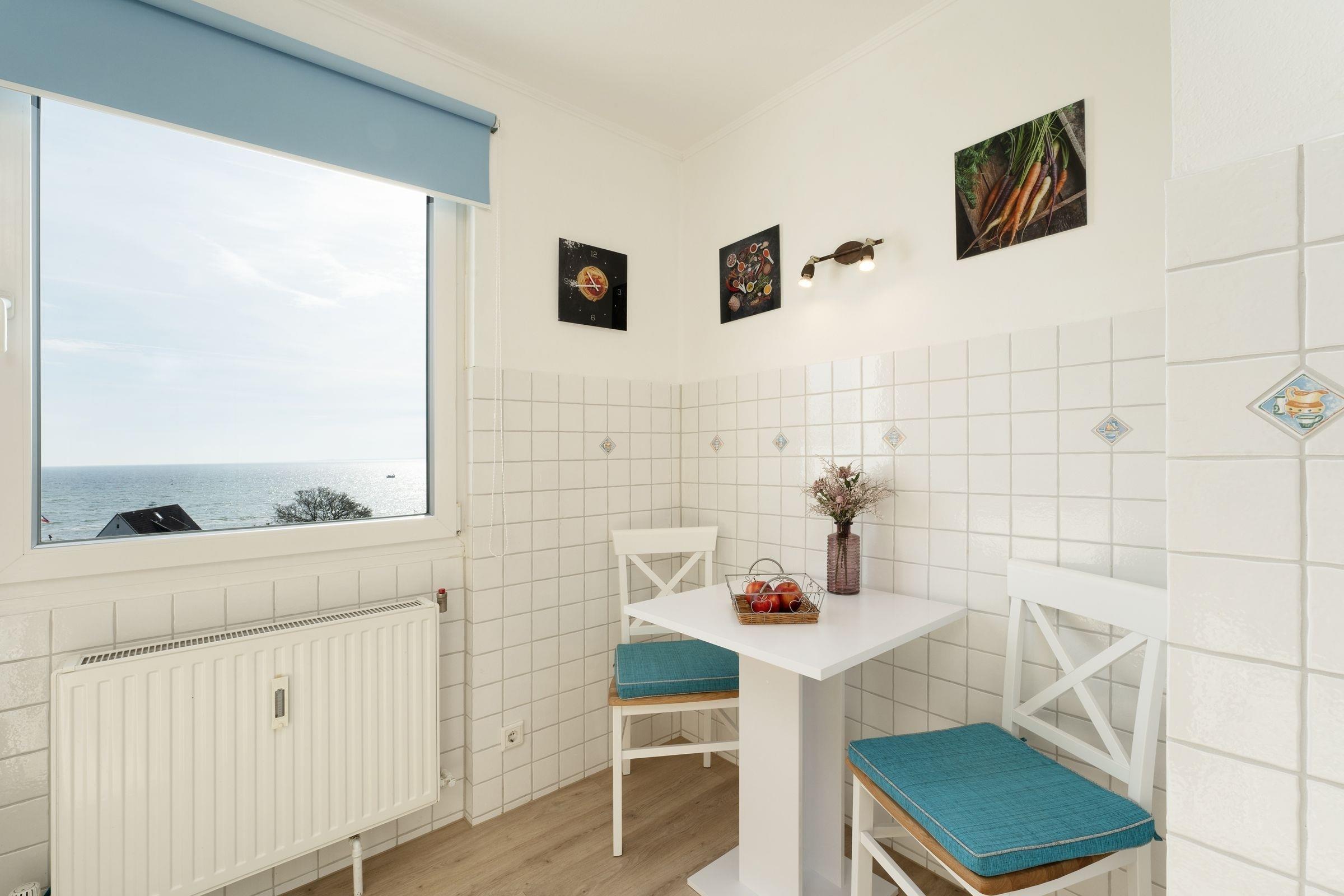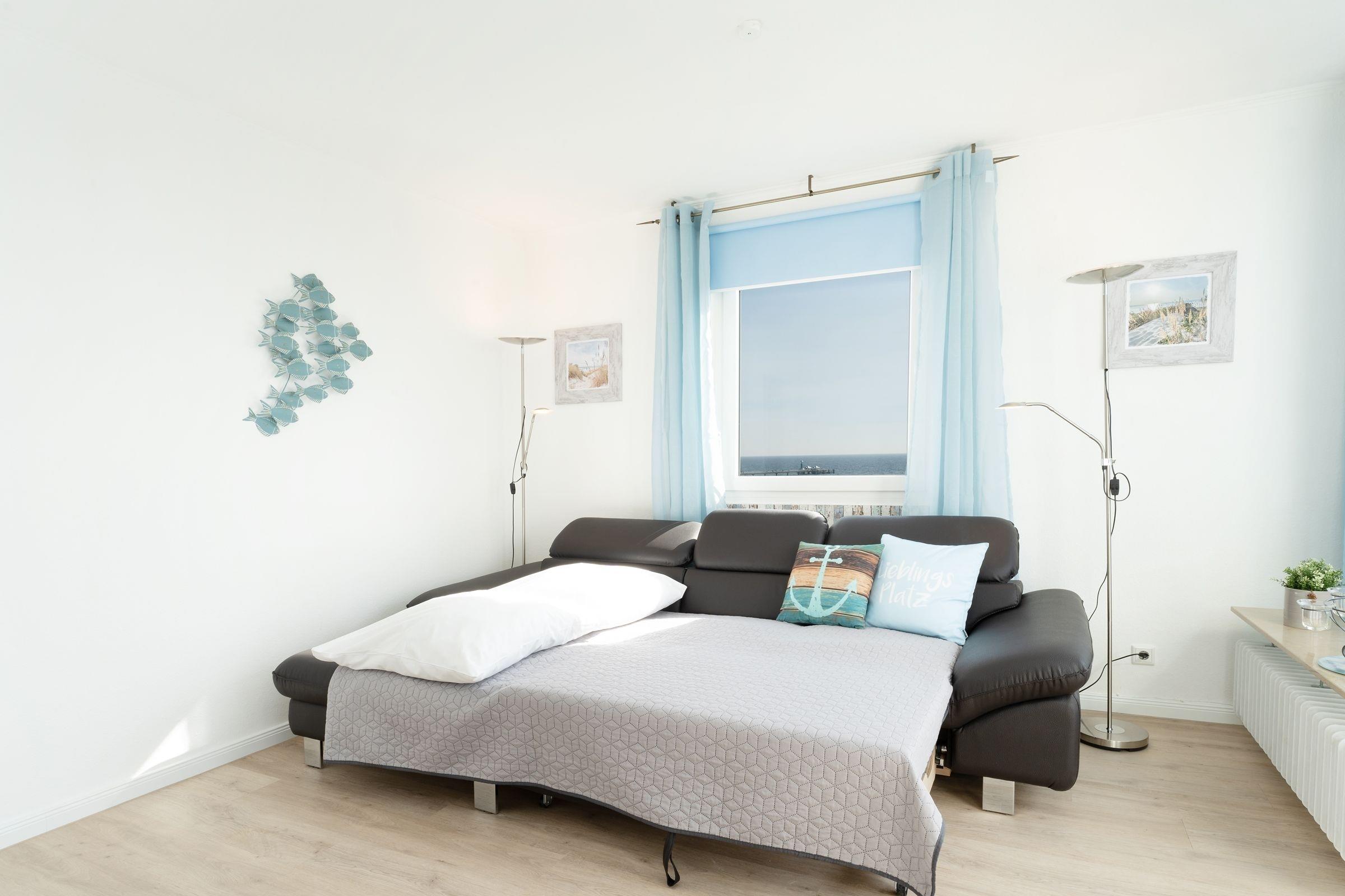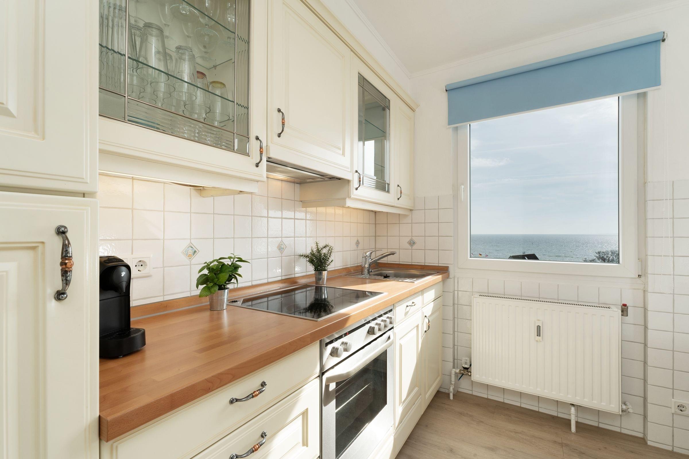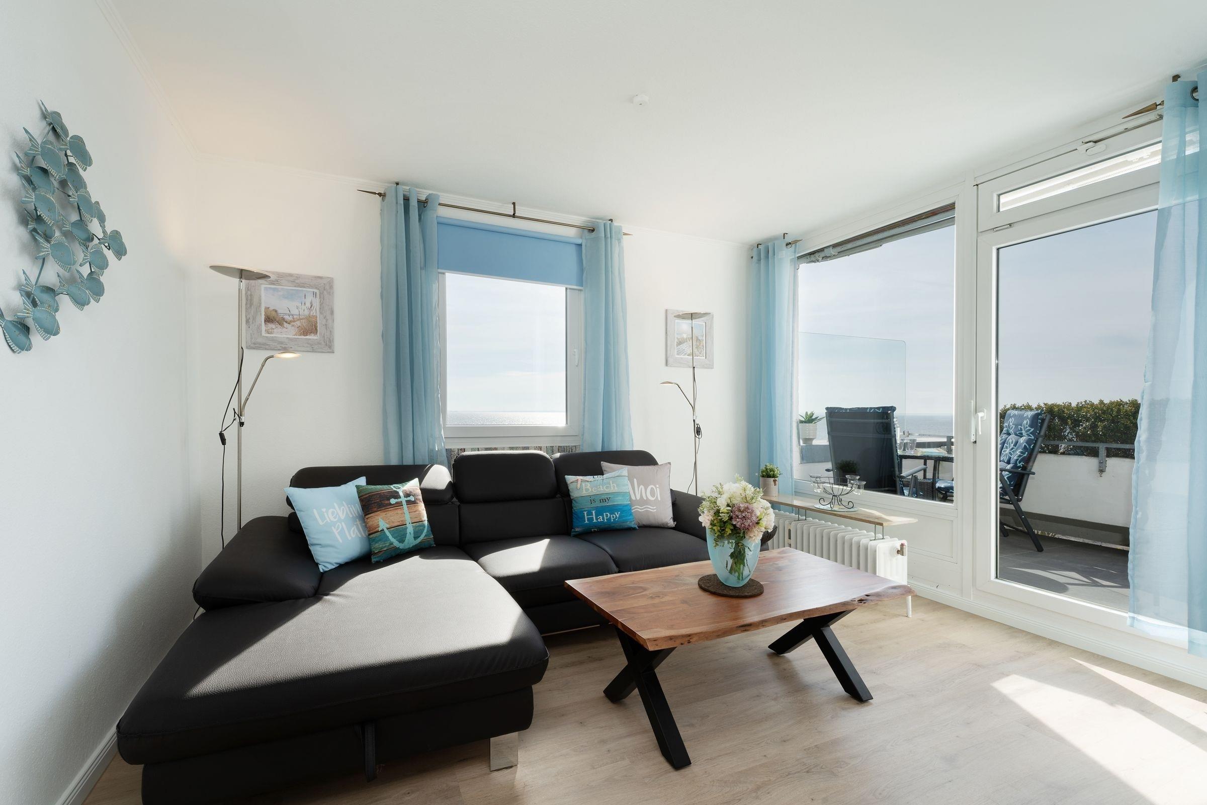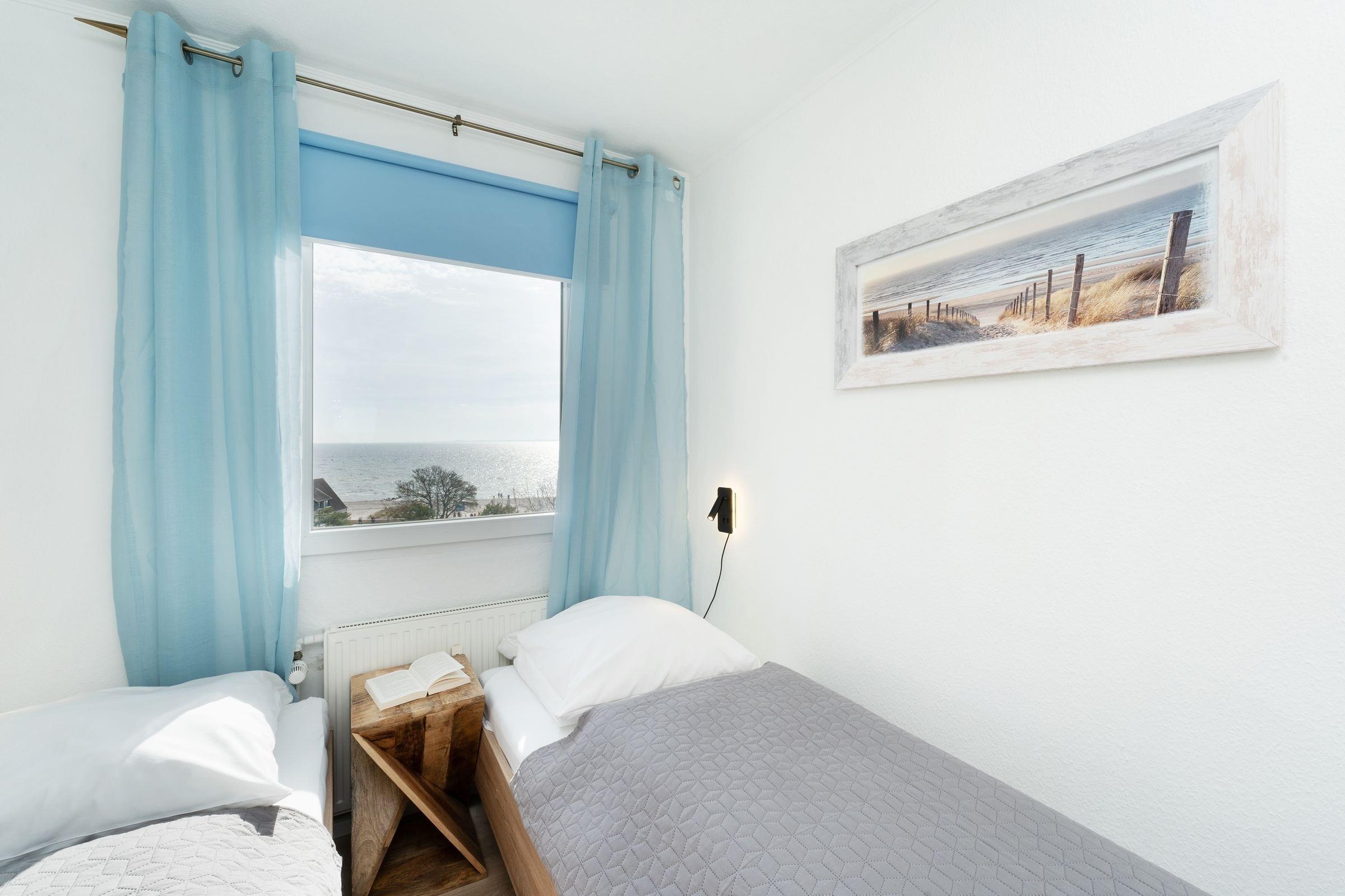 Ostsee pur. Das lichtdurchflutete Feriendomizil verwöhnt Sie mit einem herrlichen Meerblick aus allen Zimmern. Kommen Sie an, machen Sie es sich auf dem Sofa bequem und lassen Sie den Blick über die tiefblaue Ostsee schweifen. Ihre Speisen können Sie im angrenzenden Essbereich einnehmen, die separate Küche im Landhausstil ist sehr gut ausgestattet. Nach dem Essen lässt sich der Weitblick auf die Lübecker Bucht ideal auf dem großzügigen Ost-West-Balkon genießen. Das Schlafzimmer verfügt über 2 Einzelbetten (je 90x200 cm), zudem bietet das Schlafsofa im Wohnzimmer eine weitere Schlafmöglichkeit (ca. 134x197 cm). Das Duschbad mit Handtuchwärmer ist hell gefliest.
