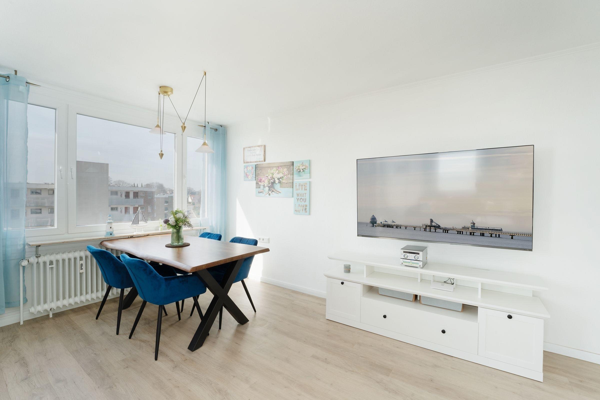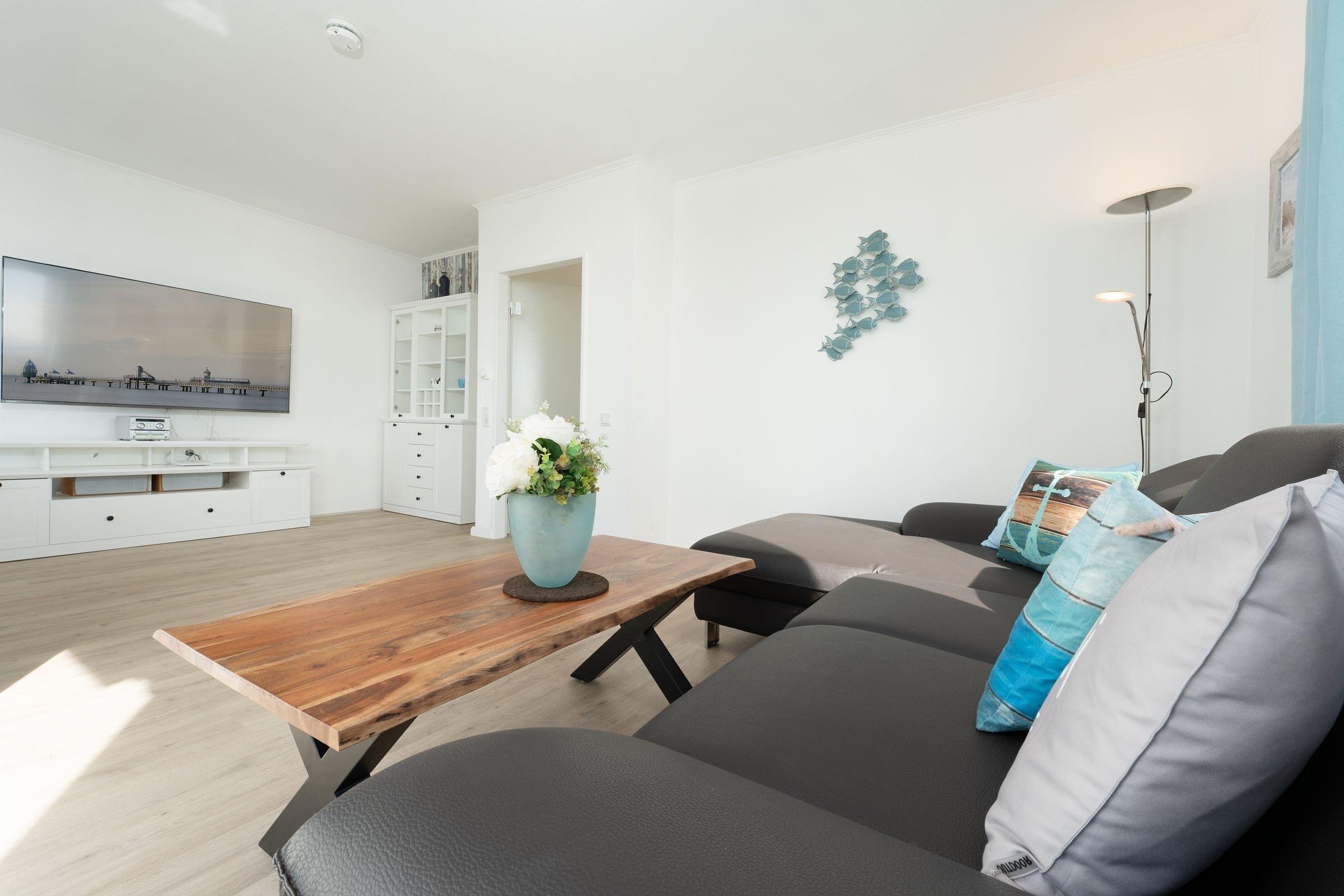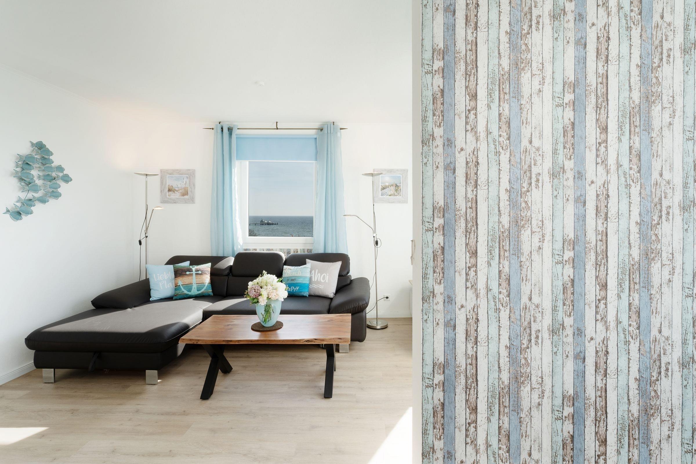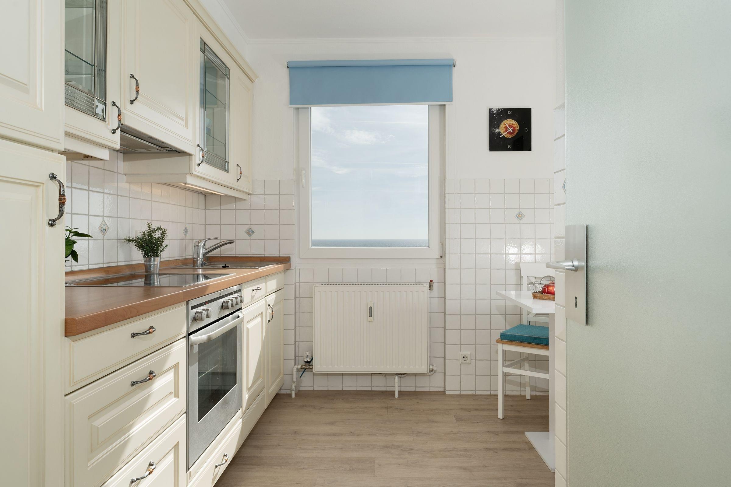 Ostsee pur. Das lichtdurchflutete Feriendomizil verwöhnt Sie mit einem herrlichen Meerblick aus allen Zimmern. Kommen Sie an, machen Sie es sich auf dem Sofa bequem und lassen Sie den Blick über die tiefblaue Ostsee schweifen. Ihre Speisen können Sie im angrenzenden Essbereich einnehmen, die separate Küche im Landhausstil ist sehr gut ausgestattet. Nach dem Essen lässt sich der Weitblick auf die Lübecker Bucht ideal auf dem großzügigen Ost-West-Balkon genießen. Das Schlafzimmer verfügt über 2 Einzelbetten (je 90x200 cm), zudem bietet das Schlafsofa im Wohnzimmer eine weitere Schlafmöglichkeit (ca. 134x197 cm). Das Duschbad mit Handtuchwärmer ist hell gefliest.