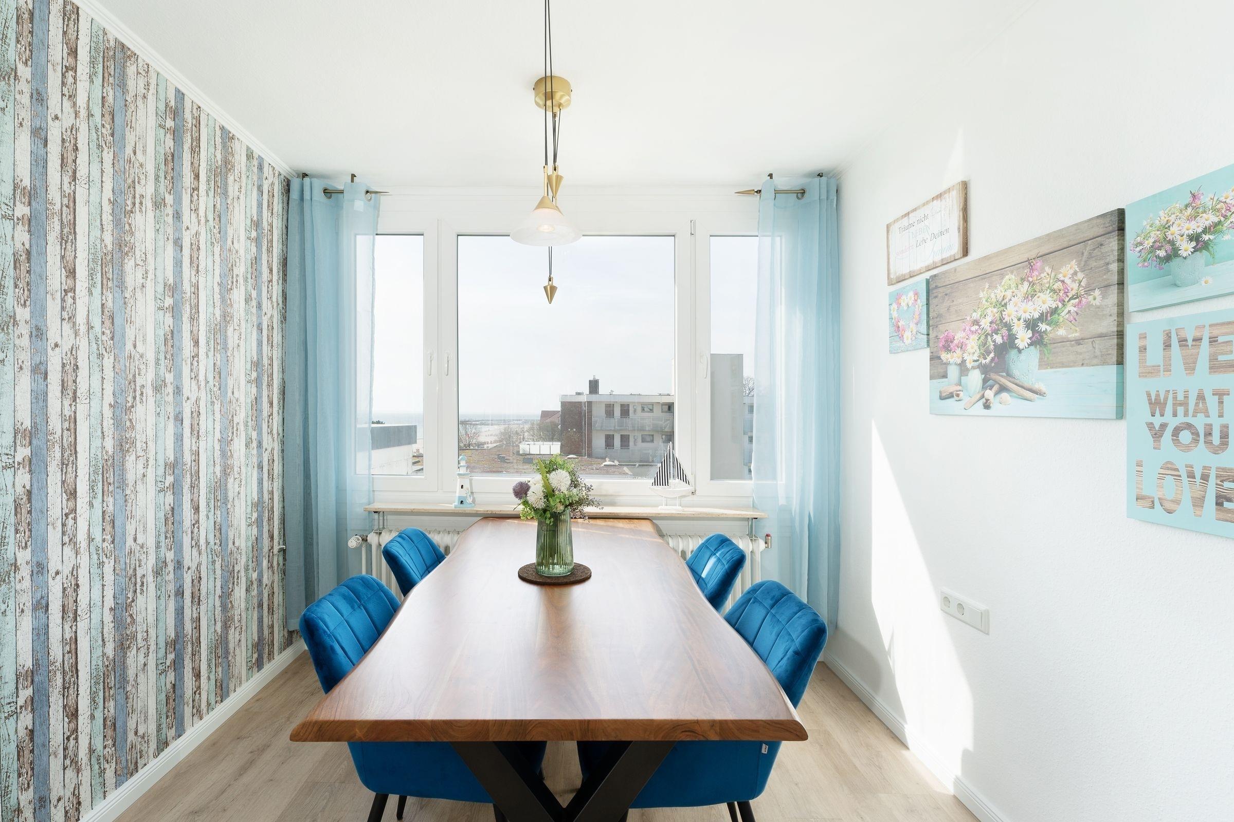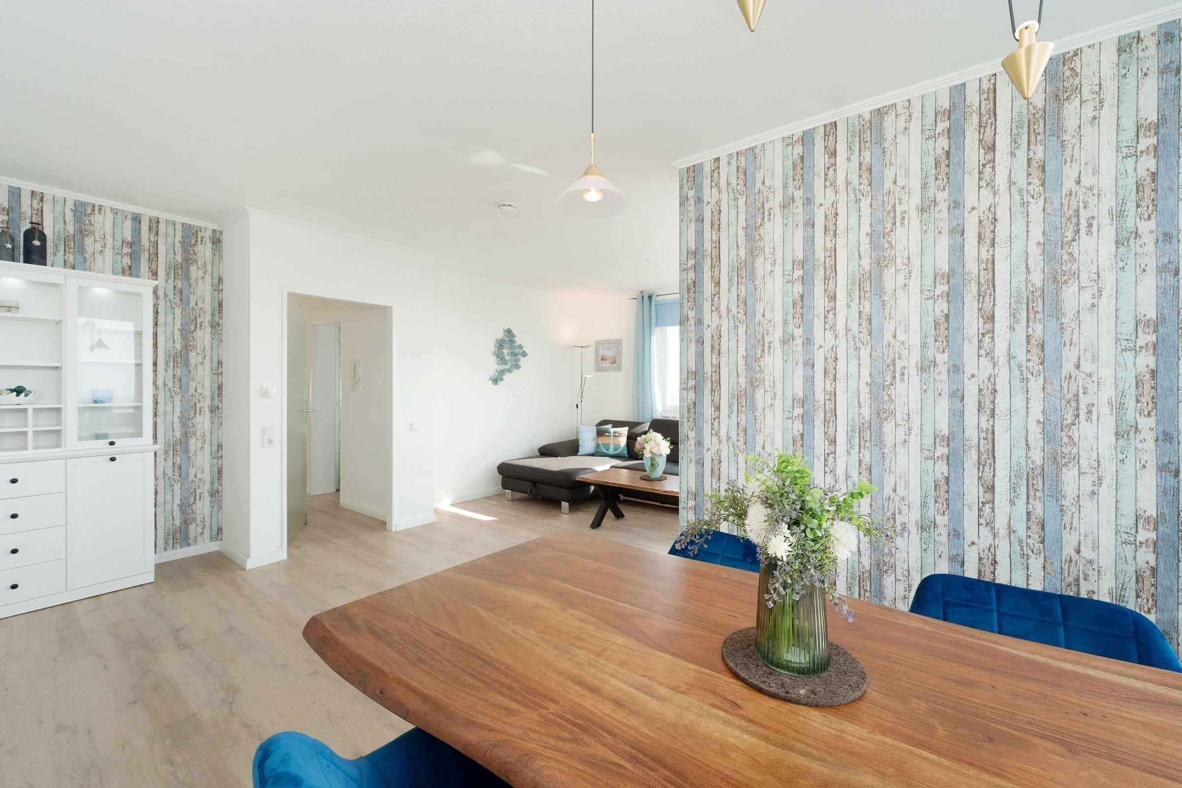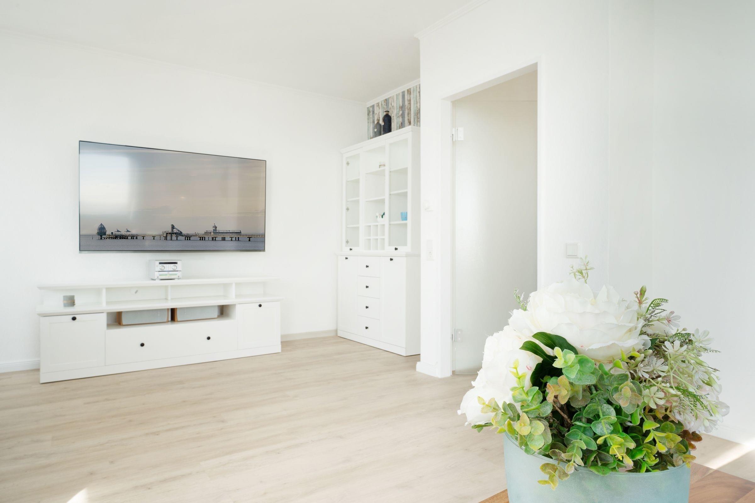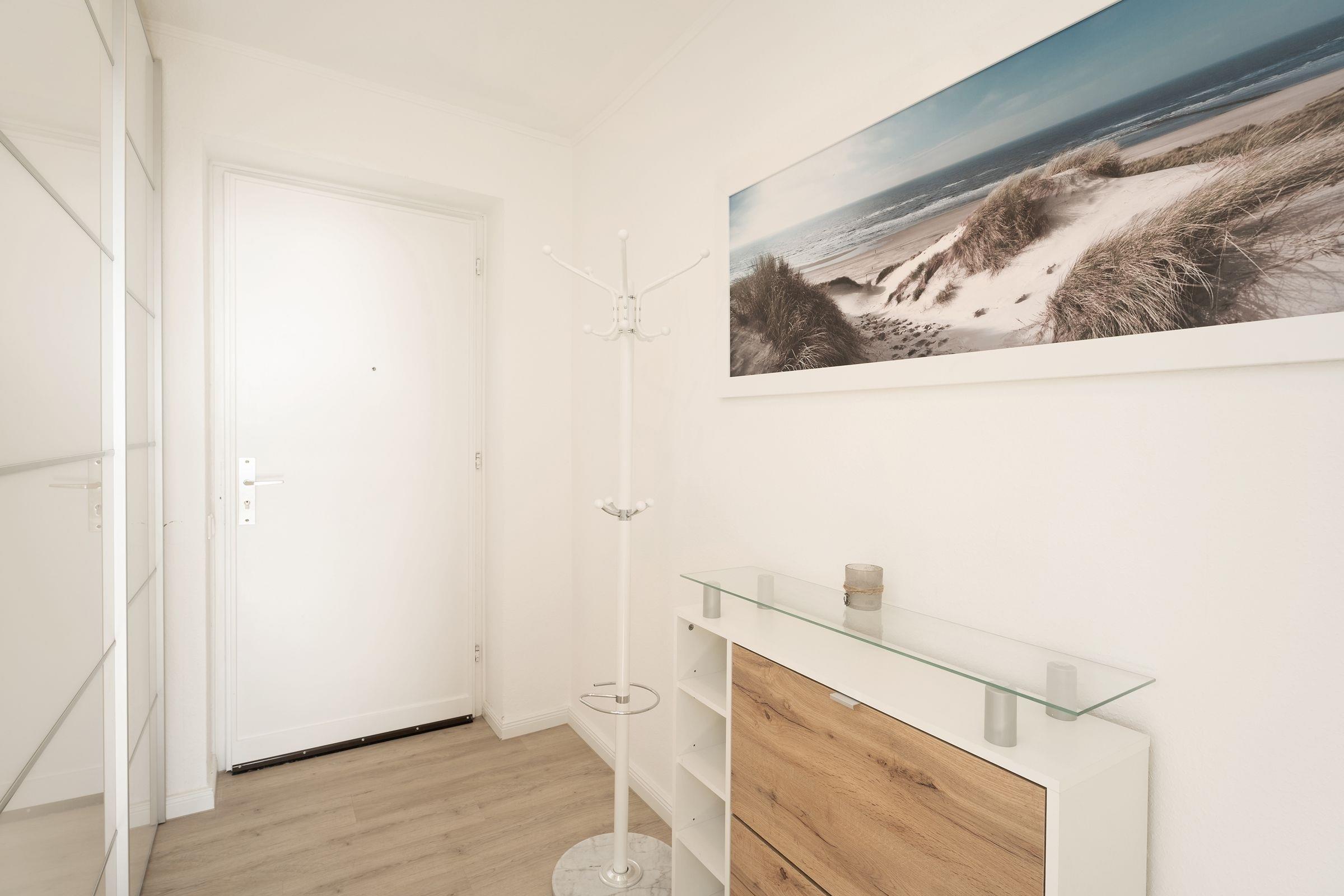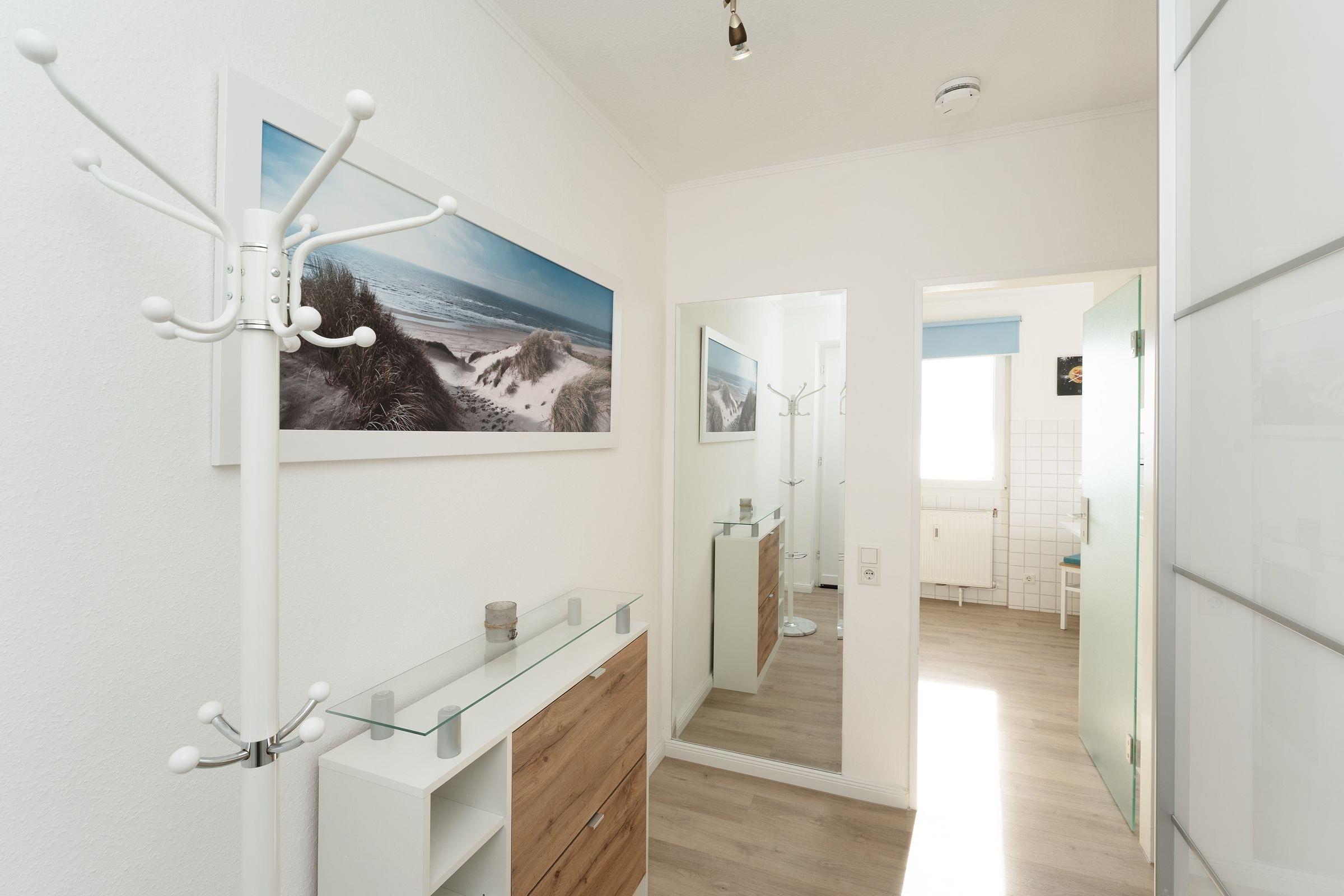 Ostsee pur. Das lichtdurchflutete Feriendomizil verwöhnt Sie mit einem herrlichen Meerblick aus allen Zimmern. Kommen Sie an, machen Sie es sich auf dem Sofa bequem und lassen Sie den Blick über die tiefblaue Ostsee schweifen. Ihre Speisen können Sie im angrenzenden Essbereich einnehmen, die separate Küche im Landhausstil ist sehr gut ausgestattet. Nach dem Essen lässt sich der Weitblick auf die Lübecker Bucht ideal auf dem großzügigen Ost-West-Balkon genießen. Das Schlafzimmer verfügt über 2 Einzelbetten (je 90x200 cm), zudem bietet das Schlafsofa im Wohnzimmer eine weitere Schlafmöglichkeit (ca. 134x197 cm). Das Duschbad mit Handtuchwärmer ist hell gefliest.