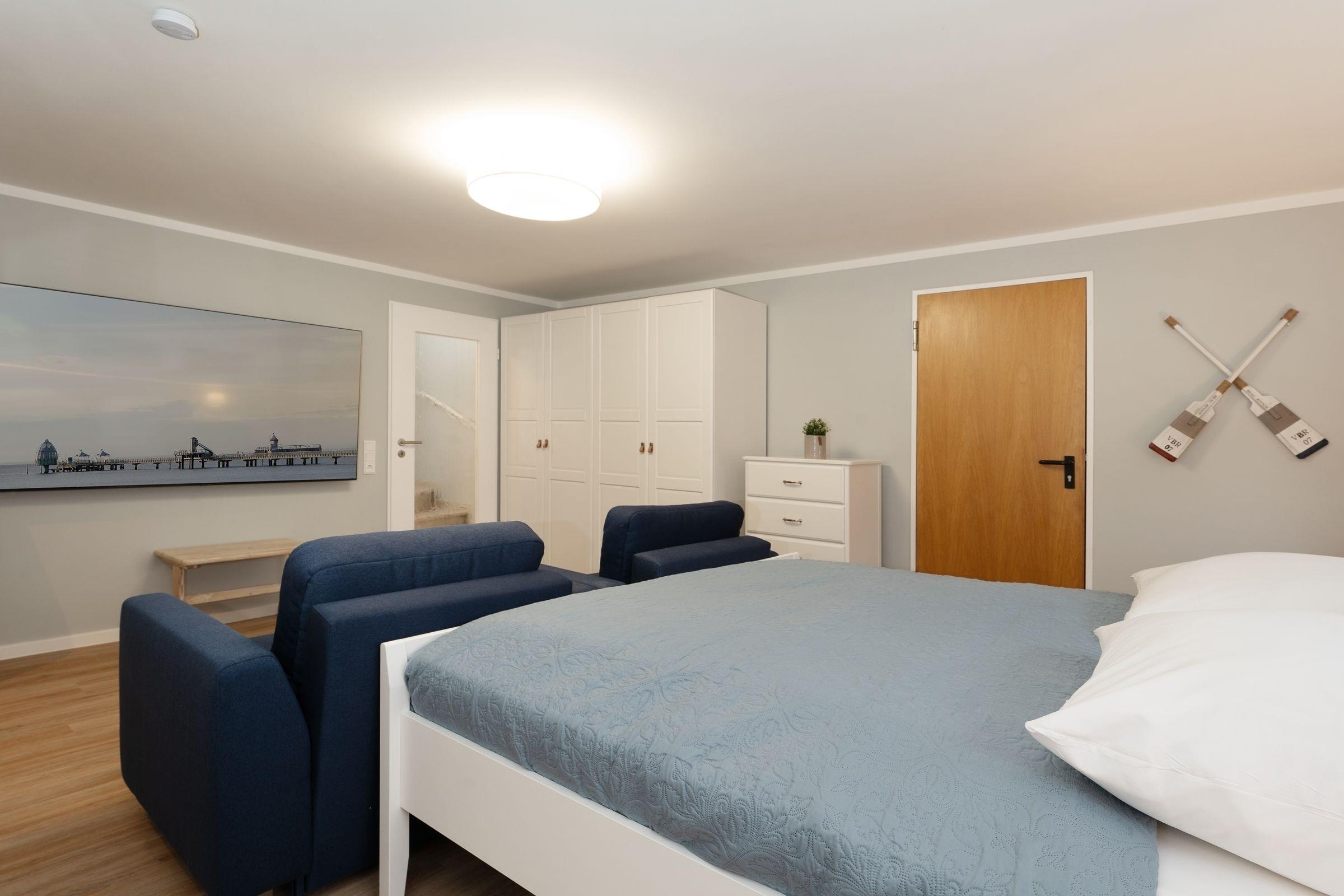 Schlafzimmer 3 (Souterrain): 1 Doppelbett (2x 90x200 cm) + 2 Schlafsessel (je 80x200 cm), Kleiderschrank, TV, Bad en suite, Verdunkelung: Vorhänge, Platz für Babybett vorhanden