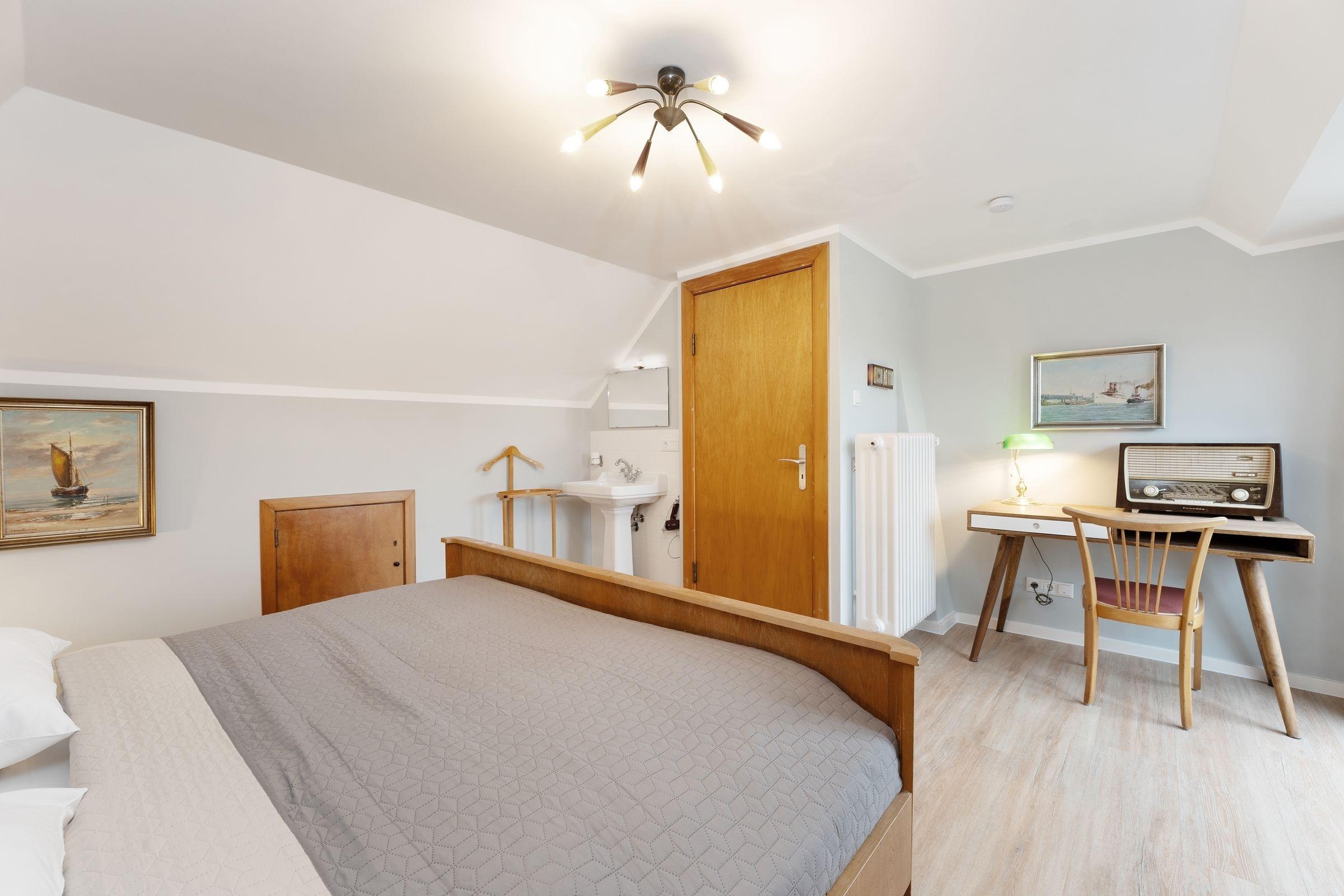 Schlafzimmer 1 (OG): 1 Doppelbett (2x 100x200 cm), Kleiderschrank, Waschbecken im Zimmer, Verdunkelung: Vorhänge, Platz für Babybett vorhanden