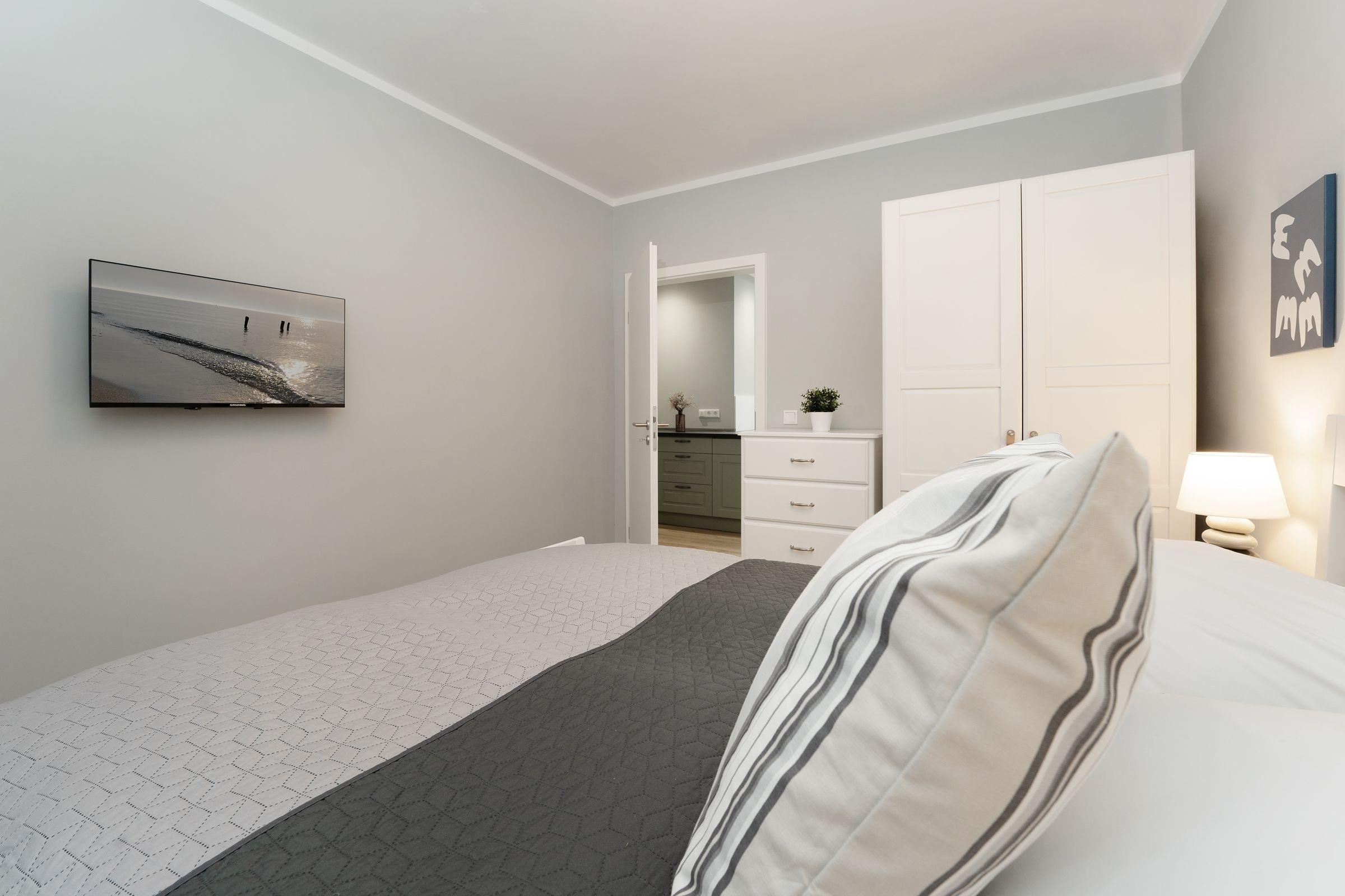 Schlafzimmer 2 (EG): 1 Doppelbett (2x 80x200 cm), Kleiderschrank, TV, Verdunkelung: Vorhänge, kein Platz für ein Babybett