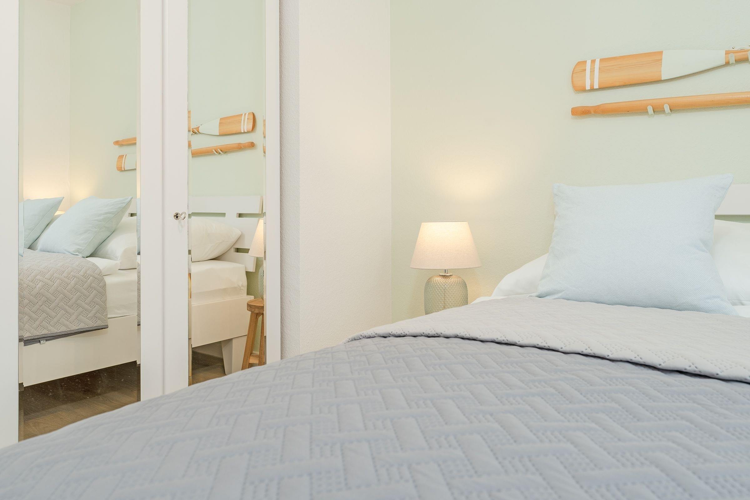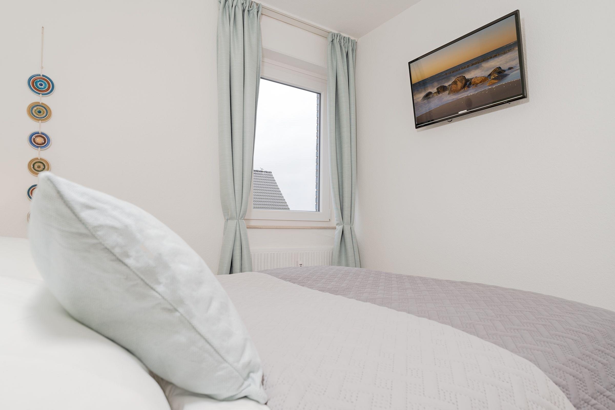 Schlafzimmer: 1 Doppelbett (180x200 cm, durchgehender Topper), Kleiderschrank, TV, Verdunkelung: Gardinen und Außenjalousie, kein Platz für ein Babybett