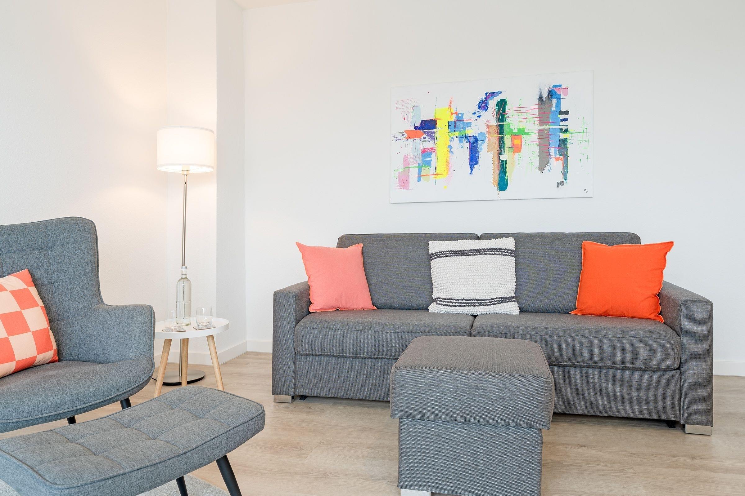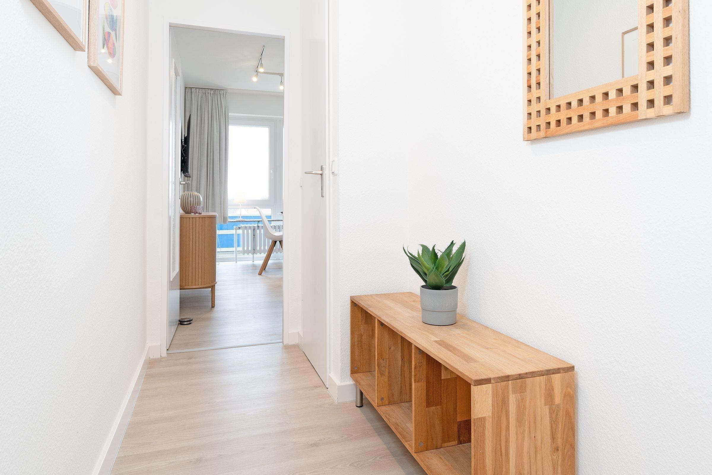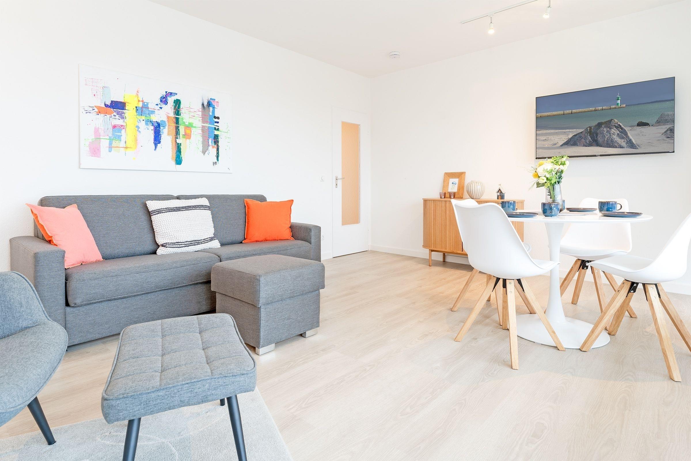 In bester Lage von Grömitz mit Blick auf die Ostsee: schicke, ca. 53 m² große 2-Zimmer-Ferienwohnung im 3. Stock mit Balkon für bis zu 4 Personen.