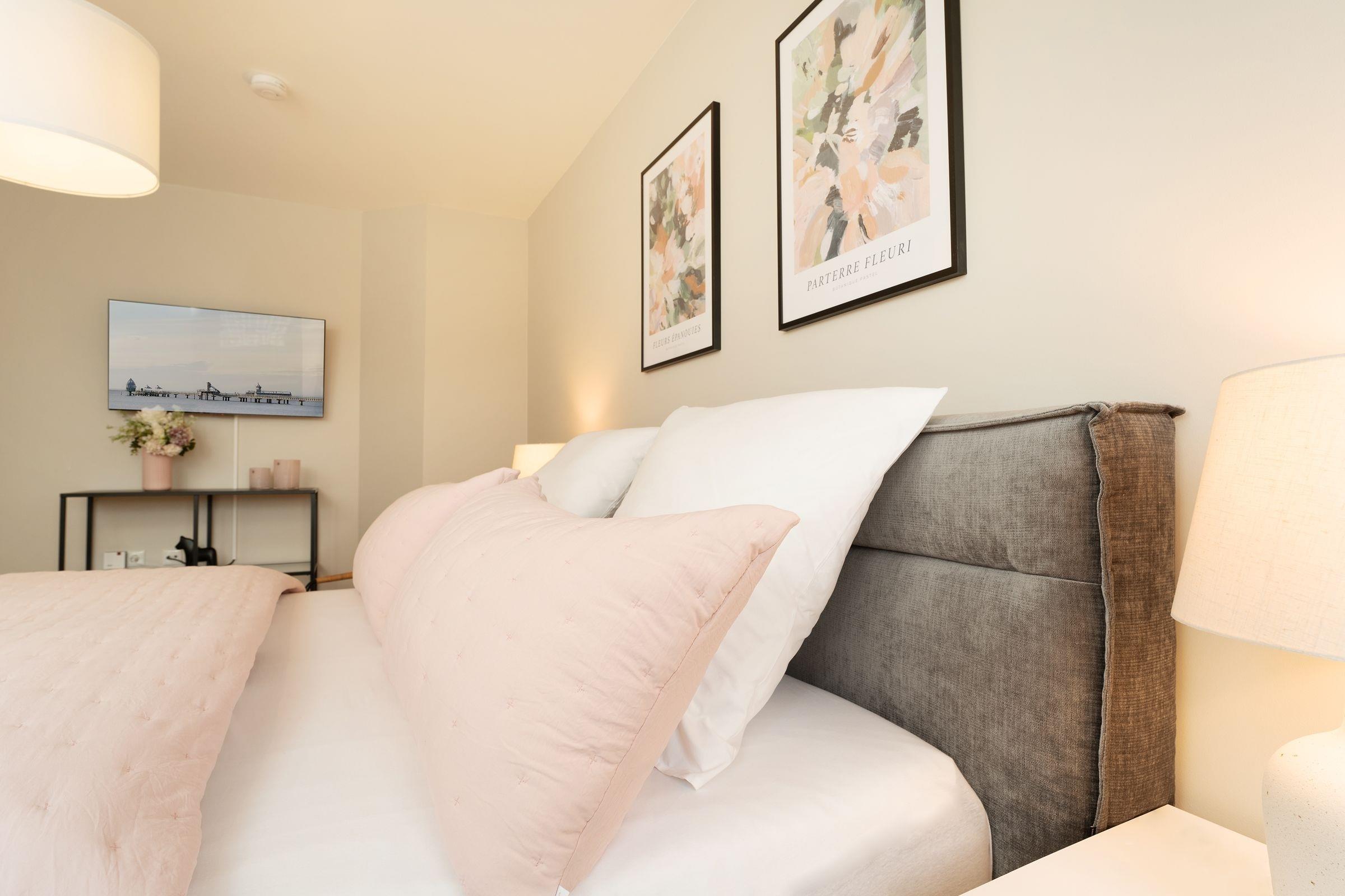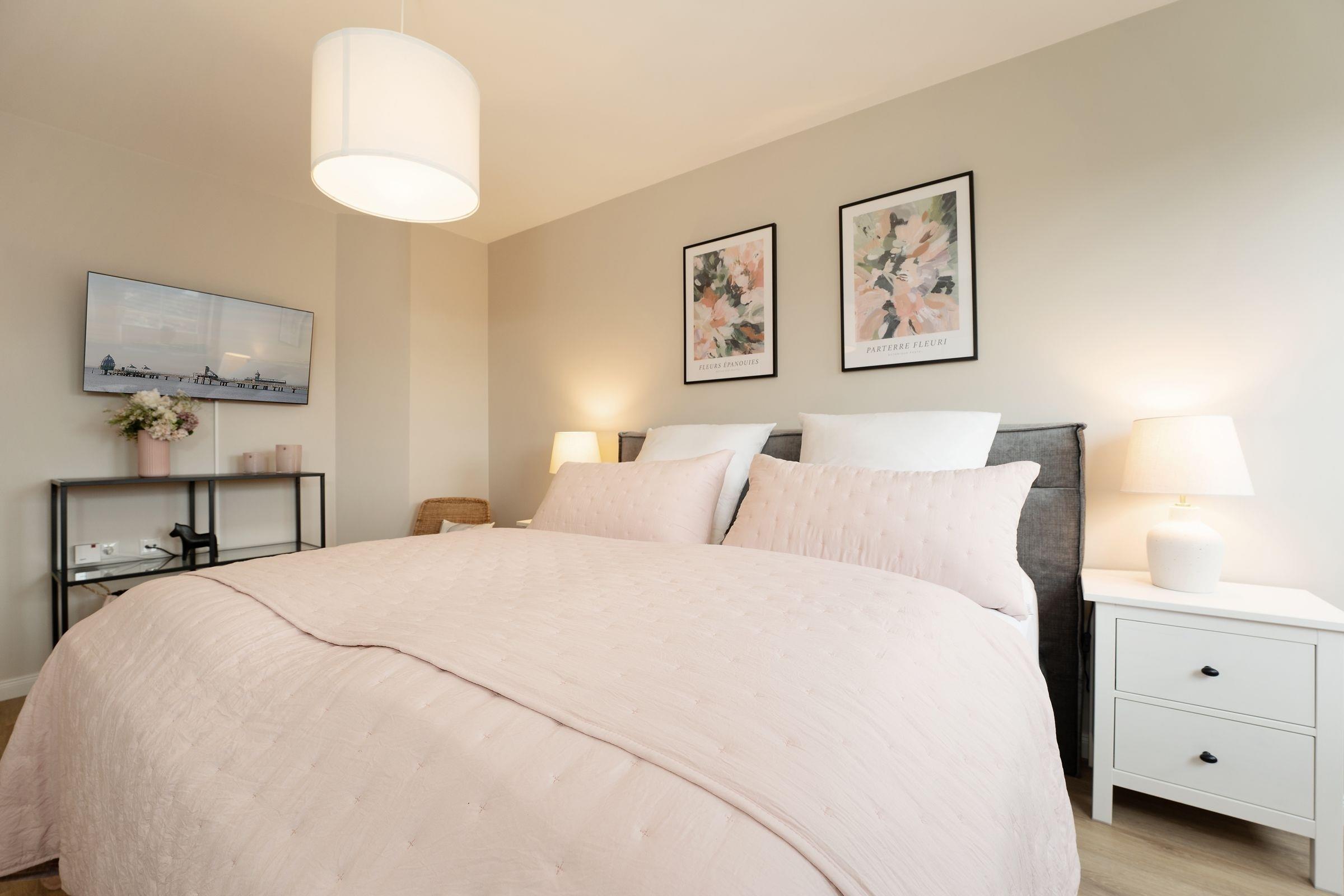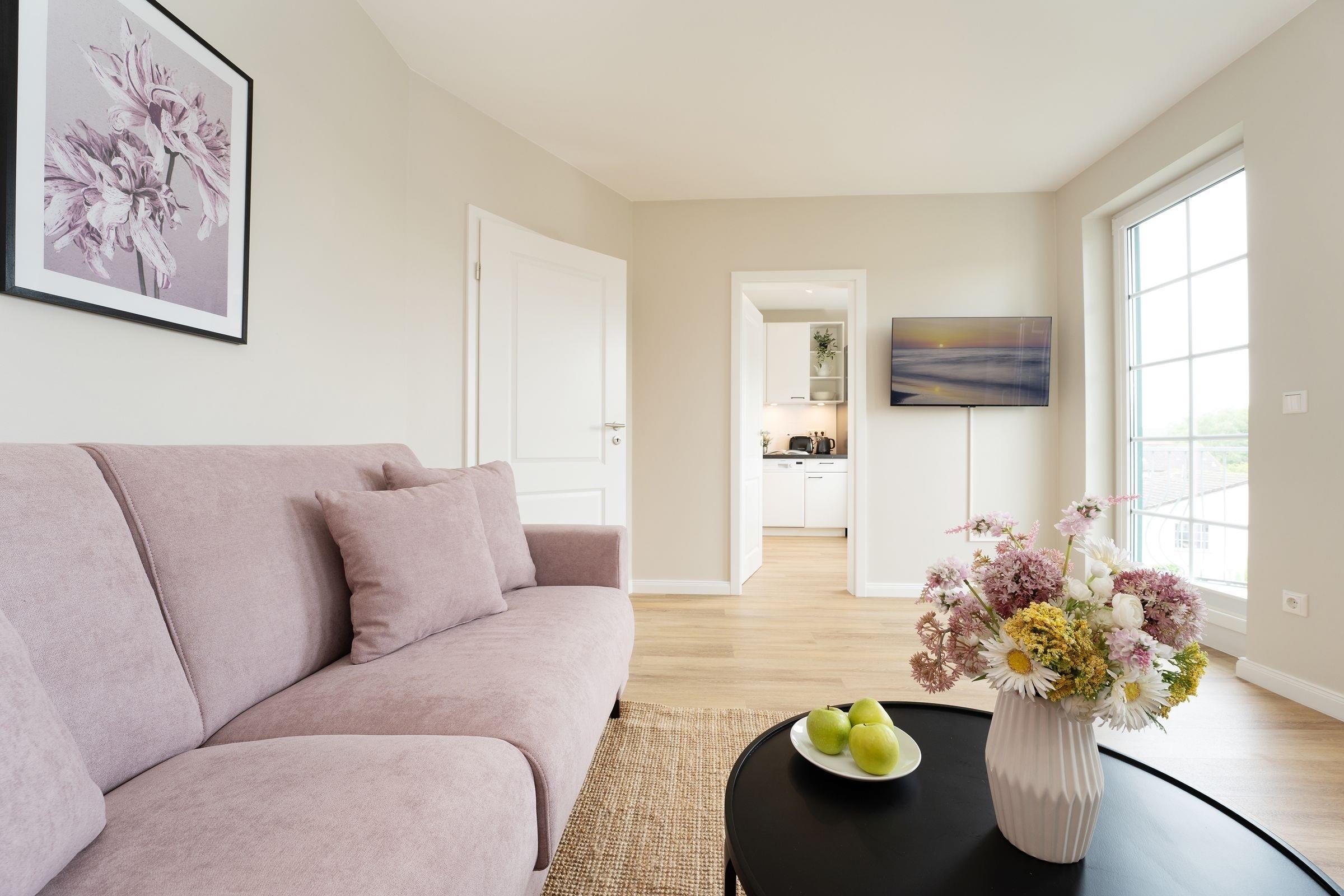 Diese schöne Ferienwohnung befindet sich in der gepflegten Wohnanlage Commodore und begrüßt Sie mit einem liebevoll eingerichteten Wohnbereich. Für die persönliche Unterhaltung sorgt ein Smart-TV (Streamingdienste zur Selbstanmeldung) sowie ein Bluetooth-Audiogerät. Der kleine, möblierte Balkon ist nach Nord-West ausgerichtet und verspricht ein gemütliches Beisammensein in der Abendsonne. Leckere Speisen dazu können Sie wunderbar in der separaten Küche zaubern. Die gute Ausstattung mit Annehmlichkeiten wie Nespresso-Maschine und Geschirrspüler wird Sie sicher erfreuen. Nächtigen können Sie im bequemen Doppelbett (180x200 cm) im Schlafzimmer. Hier befindet sich auch ein zusätzliches TV-Gerät. Oder auf dem Schlafsofa (ca. 160x197 cm) im Wohnzimmer. Das innenliegende Bad verfügt über eine bodengleiche Dusche, Föhn, Kosmetikspiegel und Handtuchwärmer.