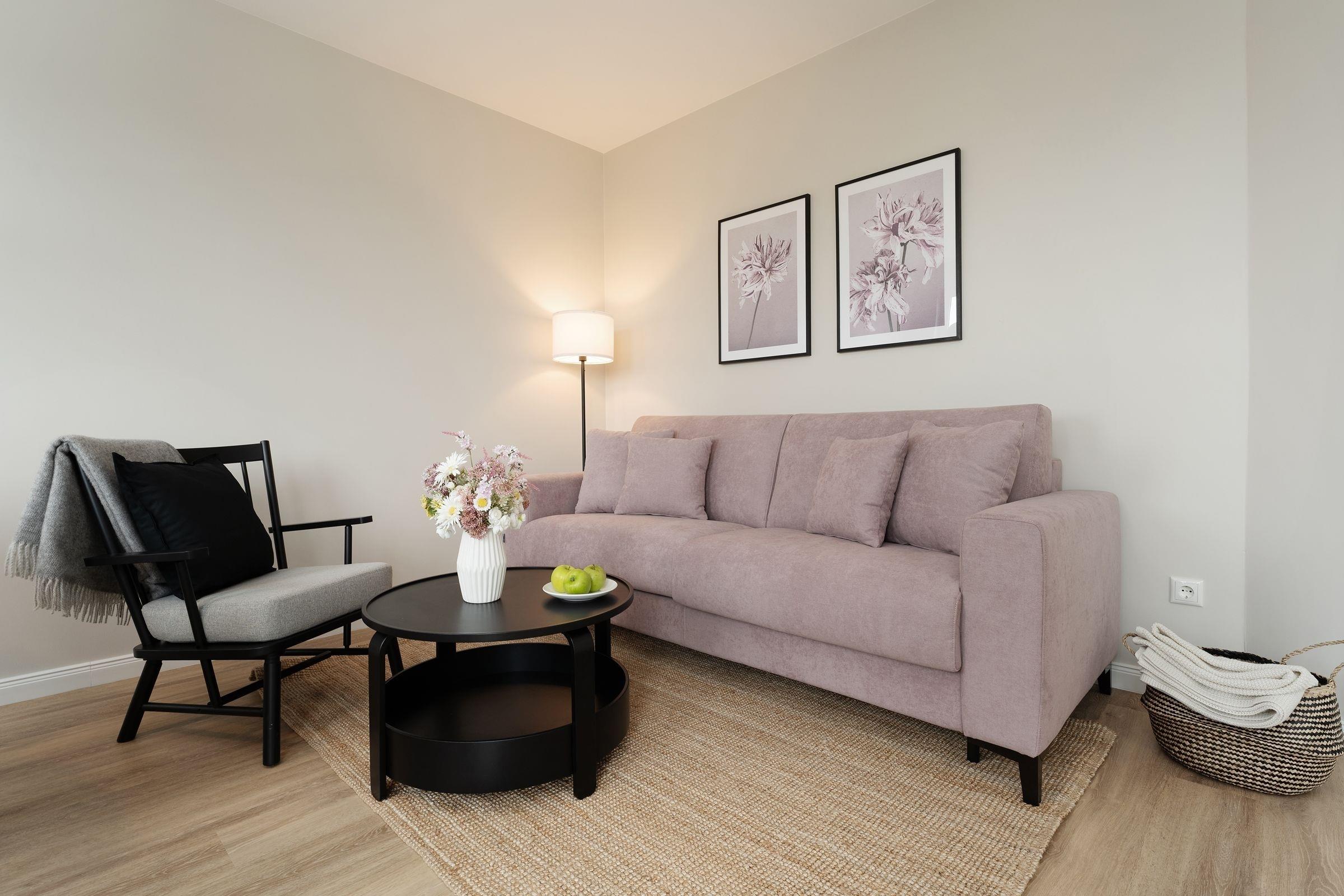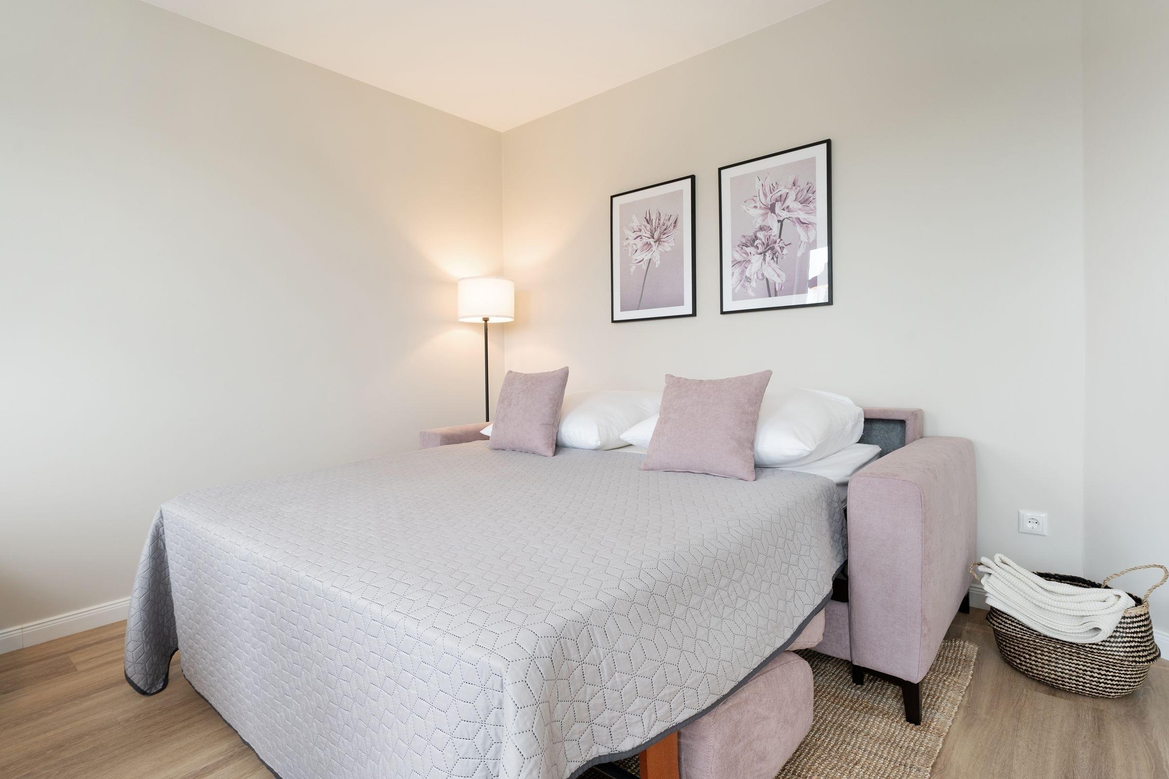 Wohnzimmer: Schlafsofa (160x197 cm), Verdunkelung: verdunkelnde Plissees, TV, Platz für Babybett vorhanden