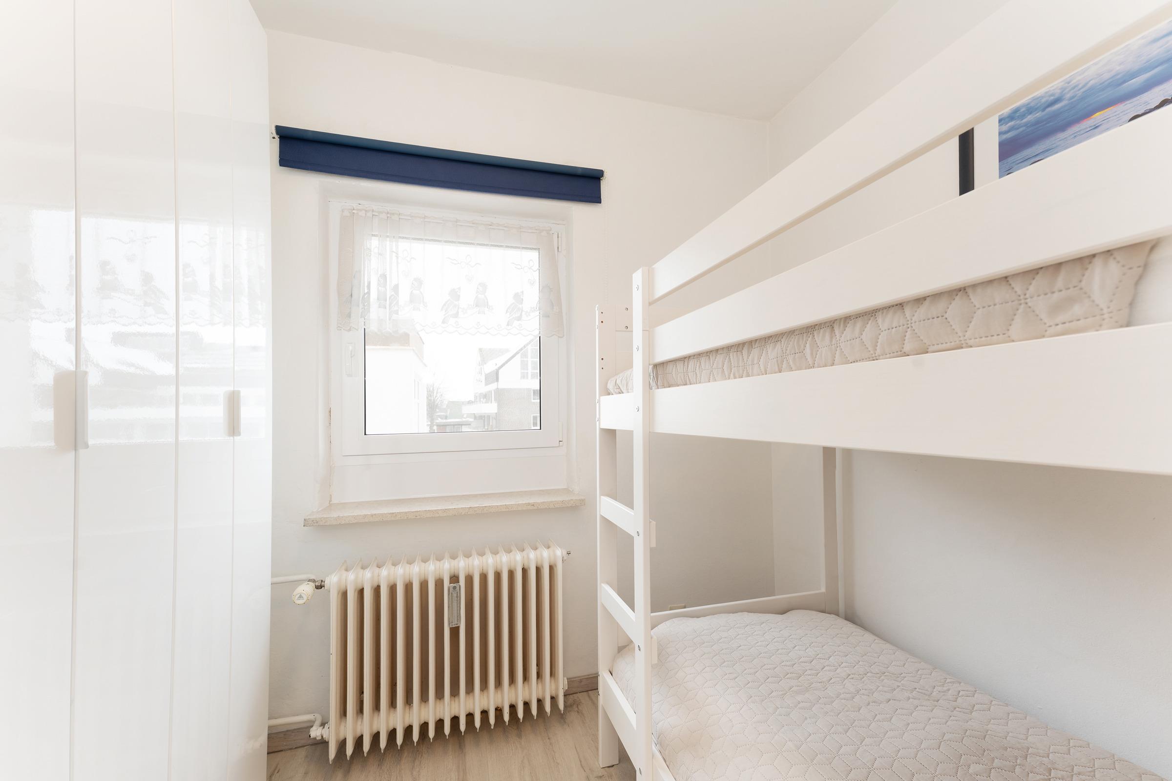 Schlafzimmer: 1 Etagenbett (90x200 cm), Kleiderschrank, Verdunkelungsrollo, kein Platz für Babybett vorhanden