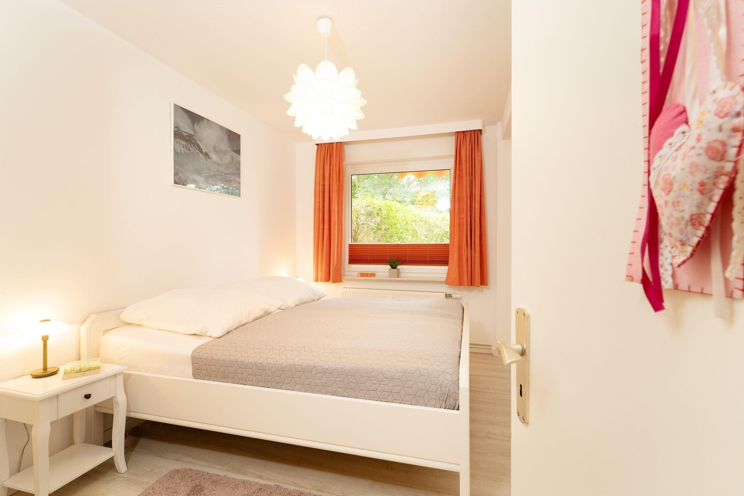 Schlafzimmer: 1 Doppelbett ( 180x200 cm), Kleiderschrank, Verdunkelung: Plissee+ Vorhang, Platz für Babybett vorhanden