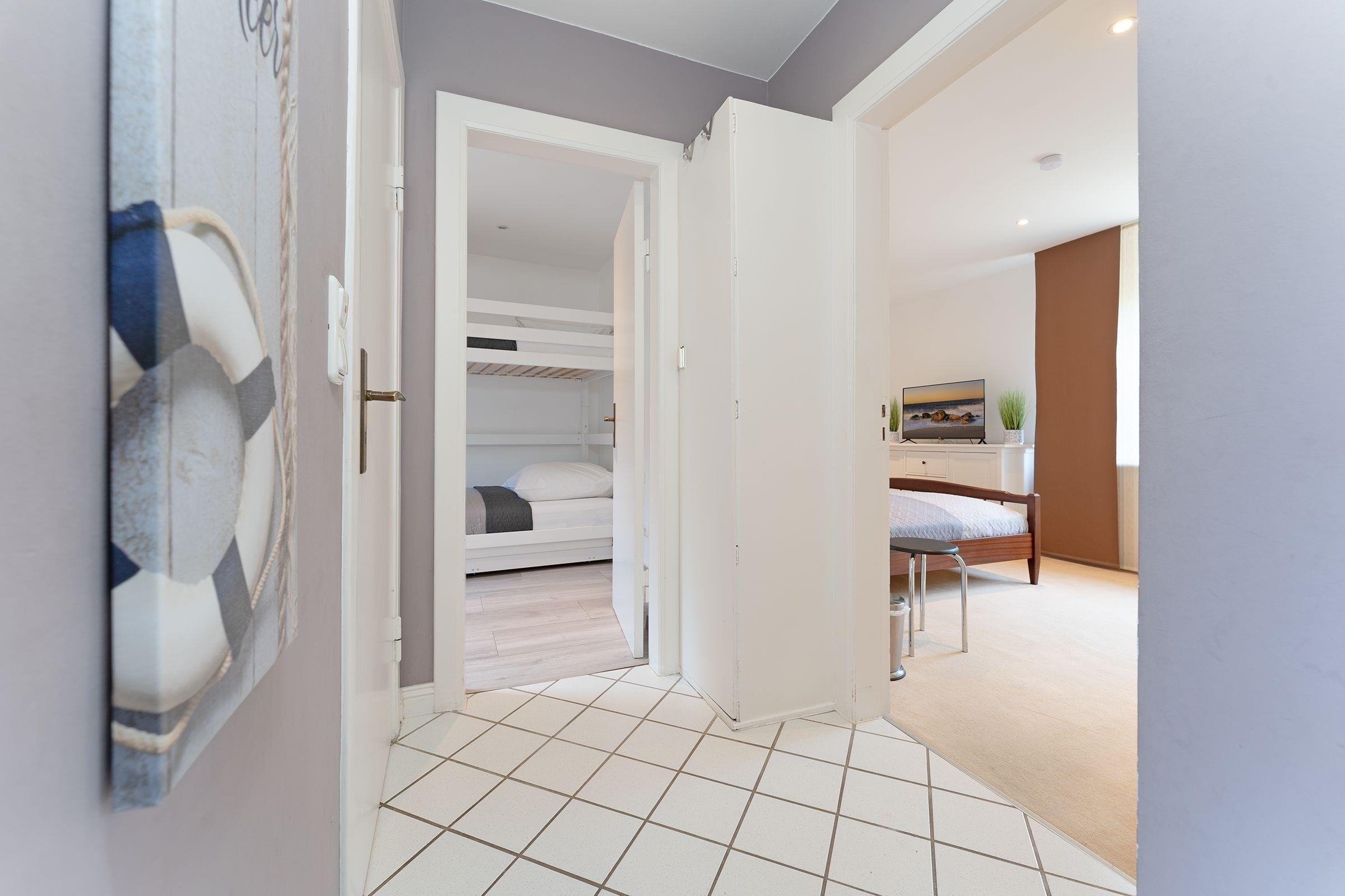 Hereinspaziert! Der helle Wohnbereich empfängt Sie mit einer kuscheligen Sofalandschaft, auf der jeder seinen Lieblingsplatz findet. TV und DVD-Player sorgen abends für die richtige Unterhaltung. Tagsüber können Sie Ihre Auszeit auf der Terrasse oder im 300 m² großen Garten genießen. Hier haben Sie mehrere Sitzgelegenheiten - und es darf auch gern gegrillt werden. Leckere Beilagen können Sie in der separaten Küche mit kleinem Essplatz zubereiten. Viele Extras machen die Selbstversorgung einfach. Prima träumen werden Sie in den beiden Schlafzimmern: Eins ist mit einem Doppelbett (180x200 cm) sowie TV ausgestattet, in dem anderen steht ein Etagenbett (2 x 90x200 cm). Das tageslichthelle Duschbad bringt Sie gut in den neuen Tag. Wie wäre es mit einem Ausflug zum rund 350 Meter entfernten Strand? Ein Bollerwagen steht für Sie bereit ...